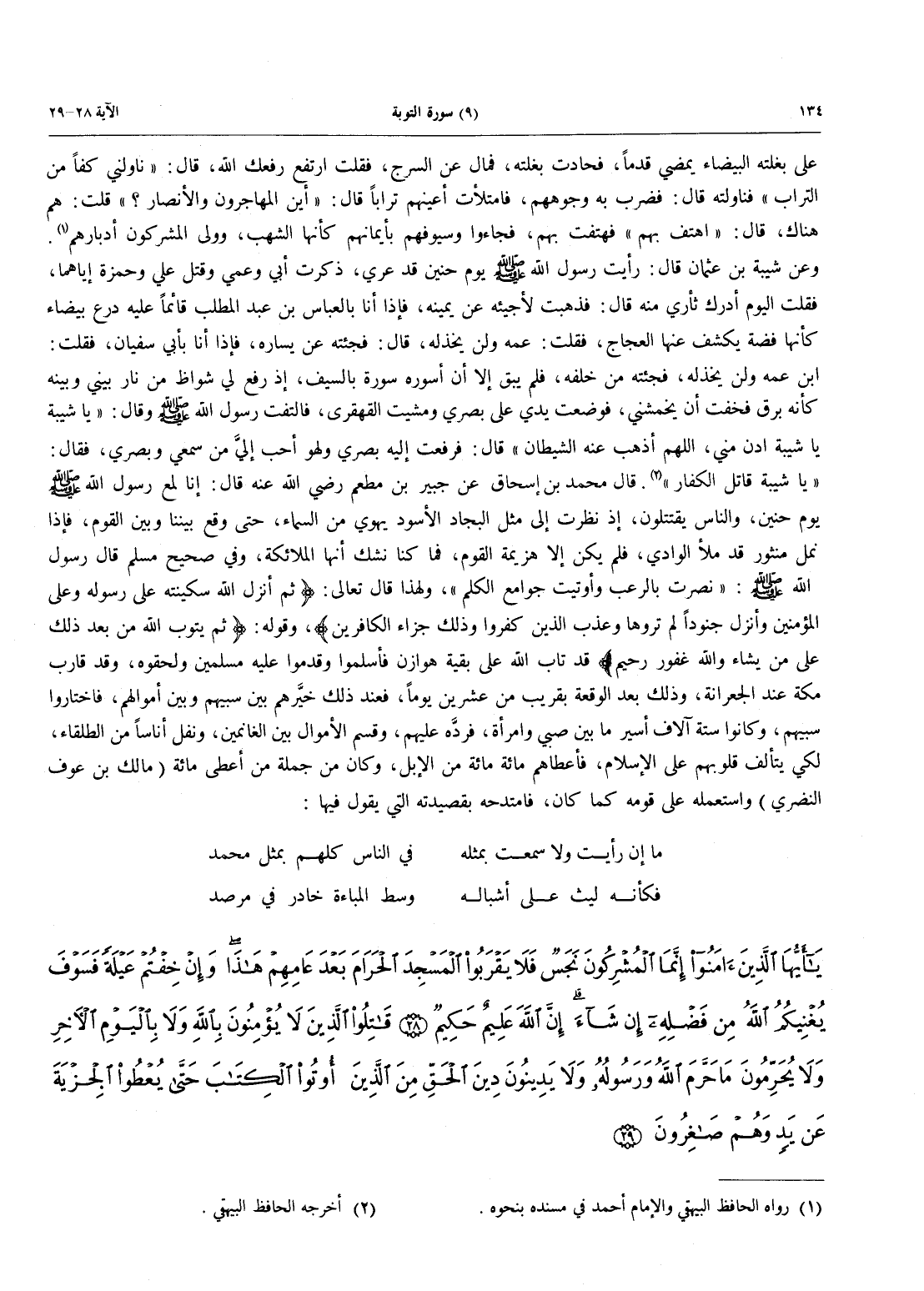 على بغلته البيضاء يَمْضِي قُدُمًا، فَحَادَتْ بَغْلَتُهُ، فَمَالَ عَنِ السَّرْجِ، فَقُلْتُ ارْتَفِعْ رَفَعَكَ اللَّهُ، قَالَ: «نَاوِلْنِي كَفًّا مِنَ التُّرَابِ» فَنَاوَلْتُهُ قَالَ: فَضَرَبَ بِهِ وُجُوهَهُمْ، فَامْتَلَأَتْ أَعْيُنُهُمْ تُرَابًا قَالَ: «أَيْنَ الْمُهَاجِرُونَ وَالْأَنْصَارُ؟» قُلْتُ: هُمْ هُنَاكَ، قَالَ: «اهْتِفْ بِهِمْ» فَهَتَفْتُ بِهِمْ، فَجَاءُوا وَسُيُوفُهُمْ بِأَيْمَانِهِمْ، كَأَنَّهَا الشُّهُبُ، وَوَلَّى المشركون أدبارهم (رواه الحافظ البيهقي والإمام أحمد في مسنده بنحوه). وعن شيبة بن عثمان قَالَ: رَأَيْتُ رَسُولَ اللَّهِ صَلَّى اللَّهُ عَلَيْهِ وَسَلَّمَ يَوْمَ حُنَيْنٍ قَدْ عُرِيَ، ذَكَرْتُ أَبِي وَعَمِّي وَقَتْلَ عَلِيٍّ وَحَمْزَةَ إِيَّاهُمَا، فَقُلْتُ الْيَوْمَ أُدْرِكُ ثَأْرِي مِنْهُ قَالَ: فَذَهَبْتُ لِأَجِيئَهُ عَنْ يَمِينِهِ، فَإِذَا أَنَا بِالْعَبَّاسِ بْنِ عَبْدِ الْمُطَّلِبِ قَائِمًا عَلَيْهِ دِرْعٌ بَيْضَاءُ كَأَنَّهَا فِضَّةٌ يَكْشِفُ عَنْهَا الْعَجَاجُ، فَقُلْتُ: عَمُّهُ وَلَنْ يَخْذُلَهُ، قَالَ: فَجِئْتُهُ عَنْ يَسَارِهِ، فَإِذَا أَنَا بِأَبِي سُفْيَانَ، فَقُلْتُ: ابْنُ عَمِّهِ وَلَنْ يَخْذُلَهُ، فَجِئْتُهُ مِنْ خَلْفِهِ، فَلَمْ يَبْقَ إِلَّا أَنْ أُسَوِّرَهُ سَوْرَةً بِالسَّيْفِ، إِذْ رُفِعَ لِي شُوَاظٌ مِّن نَّارٍ بيني وبينه كأنه برق فخفت أن يخمشني، فَوَضَعْتُ يَدِي عَلَى بَصَرِي وَمَشَيْتُ الْقَهْقَرَى، فَالْتَفَتَ رَسُولُ اللَّهِ صَلَّى اللَّهُ عَلَيْهِ وَسَلَّمَ وقال: «يا شيبة يا شيبة ادْنُ مِنِّي، اللَّهُمَّ أَذْهِبْ عَنْهُ الشَّيْطَانَ» قَالَ: فَرَفَعْتُ إِلَيْهِ بَصَرِي وَلَهُو أَحَبُّ إليَّ مِنْ سمعي وبصري، فقال: «يا شيبة قاتل الكفار» (أخرجه الحافظ البيهقي). قال محمد بن إسحاق عَنْ جُبَيْرِ بْنِ مُطْعِمٍ رَضِيَ اللَّهُ عَنْهُ قَالَ: إِنَّا لَمَعَ رَسُولِ اللَّهِ صَلَّى اللَّهُ عَلَيْهِ وَسَلَّمَ يَوْمَ حُنَيْنٍ، وَالنَّاسُ يَقْتَتِلُونَ، إِذْ نَظَرْتُ إِلَى مِثْلِ الْبِجَادِ الْأَسْوَدِ يَهْوِي مِنَ السَّمَاءِ، حَتَّى وَقَعَ بَيْنَنَا وَبَيْنَ الْقَوْمِ، فَإِذَا نَمْلٌ مَنْثُورٌ قَدْ مَلَأَ الْوَادِيَ فَلَمْ يَكُنْ إِلَّا هَزِيمَةُ الْقَوْمِ، فَمَا كُنَّا نَشُكُّ أَنَّهَا الملائكة، وفي صحيح مسلم قَالَ رَسُولُ اللَّهِ صَلَّى اللَّهُ عَلَيْهِ وَسَلَّمَ: «نُصِرْتُ بِالرُّعْبِ وَأُوتِيتُ جَوَامِعَ الْكَلِمِ»، وَلِهَذَا قَالَ تَعَالَى: {ثُمَّ أَنَزلَ اللَّهُ سَكِينَتَهُ عَلَى رَسُولِهِ وَعَلَى الْمُؤْمِنِينَ وَأَنزَلَ جُنُوداً لَّمْ تَرَوْهَا وَعذَّبَ الَّذِينَ كَفَرُواْ وَذَلِكَ جَزَآءُ الْكَافِرِينَ}، وَقَوْلُهُ: {ثُمَّ يَتُوبُ اللَّهُ مِن بَعْدِ ذَلِكَ عَلَى مَنْ يَشَاءُ وَاللَّهُ غَفُورٌ رَّحِيمٌ} قَدْ تَابَ اللَّهُ على بقية هوازن فأسلموا وَقَدِمُوا عَلَيْهِ مُسْلِمِينَ وَلَحِقُوهُ، وَقَدْ قَارَبَ مَكَّةَ عِنْدَ الْجِعْرَانَةَ، وَذَلِكَ بَعْدَ الْوَقْعَةِ بِقَرِيبٍ مِنْ عِشْرِينَ يَوْمًا، فَعِنْدَ ذَلِكَ خيَّرهم بَيْنَ سَبْيِهِمْ وبين أموالهم، فاختاروا سبيهم، وكانوا سنة آلَافِ أَسِيرٍ مَا بَيْنَ صَبِيٍّ وَامْرَأَةٍ، فردَّه عليهم، وقسم الأموال بين الغانمين، ونفل أناساً من الطلقاء، لكي يتألف قُلُوبَهُمْ عَلَى الْإِسْلَامِ، فَأَعْطَاهُمْ مِائَةً مِائَةً مِنَ الْإِبِلِ، وَكَانَ مِنْ جُمْلَةِ مَنْ أُعْطِيَ مِائَةً (مَالِكُ بْنُ عَوْفٍ النَّضْرِيُّ) وَاسْتَعْمَلَهُ عَلَى قَوْمِهِ كَمَا كَانَ، فَامْتَدَحَهُ بِقَصِيدَتِهِ الَّتِي يَقُولُ فِيهَا: