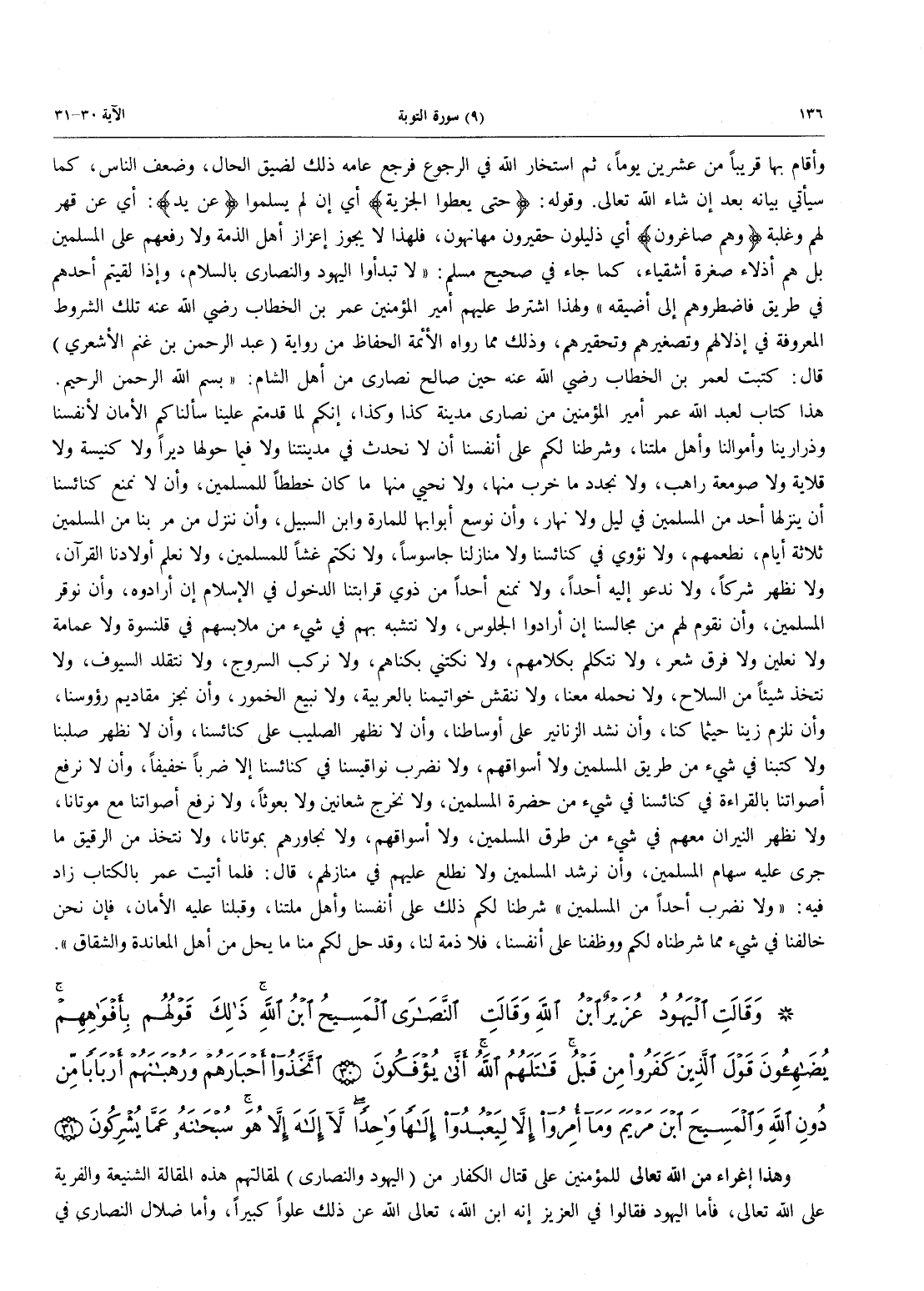 وأقام بها قَرِيبًا مِنْ عِشْرِينَ يَوْمًا، ثُمَّ اسْتَخَارَ اللَّهَ فِي الرُّجُوعِ فَرَجَعَ عَامَهُ ذَلِكَ لِضِيقِ الْحَالِ، وَضَعْفِ النَّاسِ، كَمَا سَيَأْتِي بَيَانُهُ بَعْدُ إِنْ شاء الله تعالى. وَقَوْلُهُ: {حَتَّى يُعْطُواْ الْجِزْيَةَ} أَيْ إِنْ لَمْ يُسْلِمُوا {عَن يَدٍ}: أَيْ عَنْ قَهْرٍ لَهُمْ وهم غلبة {وَهُمْ صَاغِرُونَ} أَيْ ذَلِيلُونَ حَقِيرُونَ مُهَانُونَ، فَلِهَذَا لَا يَجُوزُ إِعْزَازُ أَهْلِ الذِّمَّةِ وَلَا رَفْعُهُمْ عَلَى الْمُسْلِمِينَ بَلْ هُمْ أَذِلَّاءُ صَغَرَةٌ أَشْقِيَاءُ، كما جاء في صحيح مسلم: «لا تبدأوا الْيَهُودَ وَالنَّصَارَى بِالسَّلَامِ، وَإِذَا لَقِيتُمْ أَحَدَهُمْ فِي طريق فاضطروهم إِلَى أَضْيَقِهِ» وَلِهَذَا اشْتَرَطَ عَلَيْهِمْ أَمِيرُ الْمُؤْمِنِينَ عُمَرُ بْنُ الْخَطَّابِ رَضِيَ اللَّهُ عَنْهُ تِلْكَ الشُّرُوطِ الْمَعْرُوفَةَ فِي إِذْلَالِهِمْ وَتَصْغِيرِهِمْ وَتَحْقِيرِهِمْ، وَذَلِكَ مِمَّا رَوَاهُ الْأَئِمَّةُ الْحُفَّاظُ مِنْ رِوَايَةِ (عَبْدِ الرَّحْمَنِ بْنِ غَنْمٍ الْأَشْعَرِيِّ) قَالَ: كَتَبْتُ لِعُمَرَ بْنِ الْخَطَّابِ رَضِيَ اللَّهُ عَنْهُ حِينَ صَالَحَ نَصَارَى مِنْ أَهْلِ الشَّامِ: "بِسْمِ اللَّهِ الرَّحْمَنِ الرَّحِيمِ. هَذَا كِتَابٌ لِعَبْدِ اللَّهِ عُمَرَ أَمِيرِ الْمُؤْمِنِينَ مِنْ نَصَارَى مَدِينَةِ كَذَا وَكَذَا، إِنَّكُمْ لَمَّا قَدِمْتُمْ عَلَيْنَا سَأَلْنَاكُمُ الْأَمَانَ لِأَنْفُسِنَا وَذَرَارِينَا وَأَمْوَالِنَا وَأَهْلِ مِلَّتِنَا، وَشَرَطْنَا لَكُمْ عَلَى أَنْفُسِنَا أن لا نُحْدِثَ فِي مَدِينَتِنَا وَلَا فِيمَا حَوْلَهَا دَيْرًا ولا كنسية وَلَا قِلَايَةً وَلَا صَوْمَعَةَ رَاهِبٍ، وَلَا نُجَدِّدَ مَا خَرِبَ مِنْهَا، وَلَا نُحْيِيَ مِنْهَا مَا كان خططاً للمسلمين، وأن لا نَمْنَعَ كَنَائِسَنَا أَنْ يَنْزِلَهَا أَحَدٌ مِنَ الْمُسْلِمِينَ فِي لَيْلٍ وَلَا نَهَارٍ، وَأَنْ نُوَسِّعَ أَبْوَابَهَا للمارة وابن السبيل، وأن ننزل مَنْ مَرَّ بِنَا مِنَ الْمُسْلِمِينَ ثَلَاثَةَ أَيَّامٍ نطعمهم، ولا نؤوي فِي كَنَائِسِنَا وَلَا مَنَازِلِنَا جَاسُوسًا، وَلَا نَكْتُمَ غِشًّا لِلْمُسْلِمِينَ، وَلَا نُعَلِّمَ أَوْلَادَنَا الْقُرْآنَ، وَلَا نُظْهِرَ شِرْكًا، وَلَا نَدْعُوَ إِلَيْهِ أَحَدًا، وَلَا نَمْنَعَ أَحَدًا مِنْ ذَوِي قَرَابَتِنَا الدُّخُولَ فِي الإِسلام إِنْ أَرَادُوهُ، وَأَنْ نُوَقِّرَ الْمُسْلِمِينَ، وَأَنْ نَقُومَ لَهُمْ مِنْ مَجَالِسِنَا إِنْ أَرَادُوا الْجُلُوسَ، وَلَا نَتَشَبَّهَ بِهِمْ فِي شَيْءٍ مِنْ مَلَابِسِهِمْ فِي قَلَنْسُوَةٍ وَلَا عِمَامَةٍ وَلَا نَعْلَيْنِ وَلَا فَرْقِ شَعْرٍ، وَلَا نَتَكَلَّمَ بِكَلَامِهِمْ، وَلَا نَكْتَنِيَ بِكُنَاهُمْ، وَلَا نَرْكَبَ السُّرُوجَ، وَلَا نَتَقَلَّدَ السُّيُوفَ، وَلَا نَتَّخِذَ شَيْئًا مِنَ السِّلَاحِ، وَلَا نَحْمِلَهُ معنا، ولا ننقش خواتيمنا بالعريبة، ولا نبيع الخمور، وأن نجز مقاديم رؤوسنا، وأن نلزم حَيْثُمَا كُنَّا، وَأَنْ نَشُدَّ الزَّنَانِيرَ عَلَى أَوْسَاطِنَا، وأن لا نظهر الصليب على كنائسنا، وأن لا نُظْهِرَ صُلُبَنَا وَلَا كُتُبَنَا فِي شَيْءٍ مِنْ طريق الْمُسْلِمِينَ وَلَا أَسْوَاقِهِمْ، وَلَا نَضْرِبَ نَوَاقِيسَنَا فِي كنائسنا إلا ضرباً خفيفاً، وأن لا نَرْفَعَ أَصْوَاتَنَا بِالْقِرَاءَةِ فِي كَنَائِسِنَا فِي شَيْءٍ من حضرة المسلمين، ولا نحرج شعانين ولا بعوثاً، وَلَا نَرْفَعَ أَصْوَاتَنَا