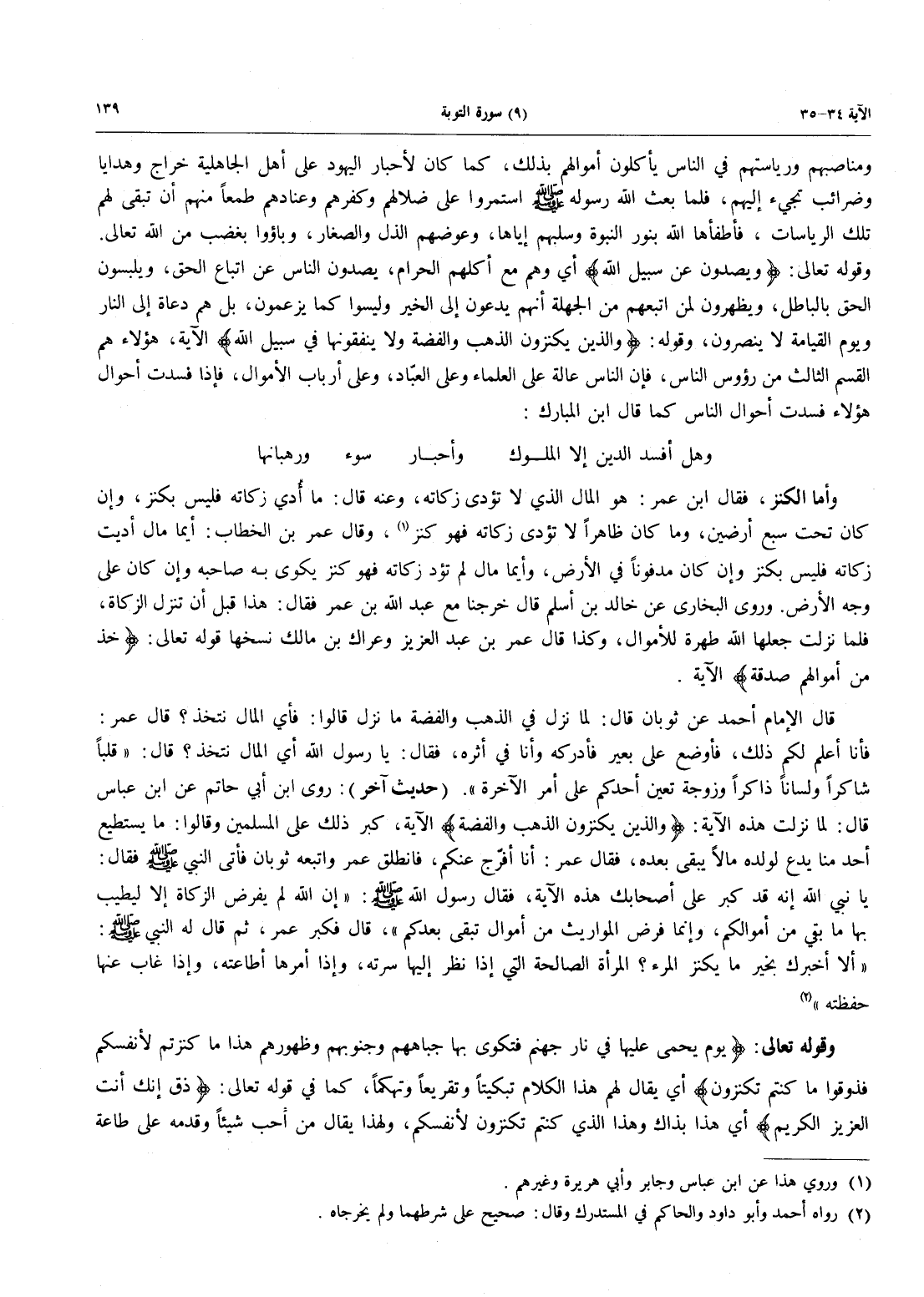وَمَنَاصِبِهِمْ وَرِيَاسَتِهِمْ فِي النَّاسِ يَأْكُلُونَ أَمْوَالَهُمْ بِذَلِكَ، كَمَا كَانَ لِأَحْبَارِ الْيَهُودِ عَلَى أَهْلِ الْجَاهِلِيَّةِ خراج وَهَدَايَا وَضَرَائِبُ تَجِيءُ إِلَيْهِمْ، فَلَمَّا بَعَثَ اللَّهُ رَسُولَهُ صَلَّى اللَّهُ عَلَيْهِ وَسَلَّمَ اسْتَمَرُّوا عَلَى ضَلَالِهِمْ وَكُفْرِهِمْ وَعِنَادِهِمْ طَمَعًا مِنْهُمْ أَنْ تَبْقَى لَهُمْ تِلْكَ الرِّيَاسَاتُ، فَأَطْفَأَهَا اللَّهُ بنور النبوة وسلبهم إياها، وعوضهم الذل والصغار، وباؤوا بغضب من الله تعالى. وَقَوْلُهُ تَعَالَى: {وَيَصُدُّونَ عَن سَبِيلِ اللَّهِ} أَيْ وَهُمْ مَعَ أَكْلِهِمُ الْحَرَامَ، يَصُدُّونَ النَّاسَ عَنِ اتِّبَاعِ الْحَقِّ، وَيُلْبِسُونَ الْحَقَّ بِالْبَاطِلِ، وَيُظْهِرُونَ لِمَنِ اتَّبَعَهُمْ مِنَ الْجَهَلَةِ أَنَّهُمْ يَدْعُونَ إِلَى الْخَيْرِ وَلَيْسُوا كَمَا يَزْعُمُونَ، بَلْ هُمْ دُعَاةٌ إِلَى النَّارِ وَيَوْمَ الْقِيَامَةِ لاَ يُنصَرُونَ، وَقَوْلُهُ: {وَالَّذِينَ يَكْنِزُونَ الذَّهَبَ وَالْفِضَّةَ وَلاَ يُنفِقُونَهَا فِي سَبِيلِ الله} الآية، هؤلاء هم القسم الثالث من رؤوس النَّاسِ، فَإِنَّ النَّاسَ عَالَةٌ عَلَى الْعُلَمَاءِ وَعَلَى العبّاد، وعلى أرباب الأموال، فإن فَسَدَتْ أَحْوَالُ هَؤُلَاءِ فَسَدَتْ أَحْوَالُ النَّاسِ كَمَا قال ابن المبارك: