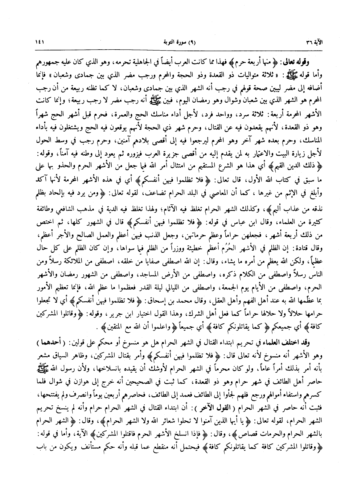 وَقَوْلُهُ تَعَالَى: {مِنْهَا أَرْبَعَةٌ حُرُمٌ} فَهَذَا مِمَّا كَانَتِ الْعَرَبُ أَيْضًا فِي الْجَاهِلِيَّةِ تُحَرِّمُهُ، وَهُوَ الذي كان عليه جمهورهم وأما قوله صلى الله عليه وسلم: «ثَلَاثَةٌ مُتَوَالِيَاتٌ ذُو الْقَعْدَةِ وَذُو الْحِجَّةِ وَالْمُحَرَّمُ وَرَجَبُ مُضَرَ الَّذِي بَيْنَ جُمَادَى وَشَعْبَانَ» فَإِنَّمَا أَضَافَهُ إِلَى مُضَرَ لِيُبَيِّنَ صِحَّةَ قَوْلِهِمْ فِي رَجَبٍ أَنَّهُ الشَّهْرُ الَّذِي بَيْنَ جُمَادَى وَشَعْبَانَ، لا كما تَظُنُّهُ رَبِيعَةُ مِنْ أَنَّ رَجَبَ الْمُحَرَّمَ هُوَ الشَّهْرُ الَّذِي بَيْنَ شَعْبَانَ وَشَوَّالٍ وَهُوَ رَمَضَانُ اليوم، فبين صلى الله عليه وسلم أَنَّهُ رَجَبُ مُضَرَ لَا رَجَبُ رَبِيعَةَ؛ وَإِنَّمَا كَانَتِ الْأَشْهُرُ الْمُحَرَّمَةُ أَرْبَعَةٌ: ثَلَاثَةٌ سَرْدٌ، وَوَاحِدٌ فرد، لأجل مناسك الحج والعمرة، فحرم قبل أشهر الحج شهراً وَهُوَ ذُو الْقَعْدَةِ، لِأَنَّهُمْ يَقْعُدُونَ فِيهِ عَنِ الْقِتَالِ، وَحَرُمَ شَهْرُ ذِي الْحِجَّةِ لِأَنَّهُمْ يُوقِعُونَ فِيهِ الْحَجَّ وَيَشْتَغِلُونَ فِيهِ بِأَدَاءِ الْمَنَاسِكِ، وَحَرُمَ بَعْدَهُ شَهْرٌ آخَرُ وَهُوَ الْمُحَرَّمُ لِيَرْجِعُوا فِيهِ إلى أَقْصَى بِلَادِهِمْ آمِنِينَ، وَحَرُمَ رَجَبُ فِي وَسَطِ الْحَوْلِ لِأَجْلِ زِيَارَةِ الْبَيْتِ وَالِاعْتِمَارِ بِهِ لِمَنْ يَقْدُمُ إِلَيْهِ مِنْ أَقْصَى جَزِيرَةِ الْعَرَبِ فَيَزُورُهُ ثم يعود إلى وطنه آمناً، وقوله: {ذَلِكَ الدِّينُ الْقَيِّمُ} أَيْ هَذَا هُوَ الشَّرْعُ الْمُسْتَقِيمُ مِنِ امْتِثَالِ أَمْرِ اللَّهِ فِيمَا جَعَلَ مِنَ الْأَشْهُرِ الْحُرُمِ وَالْحَذْوُ بِهَا عَلَى مَا سبق من كتاب الله الأول، قال تَعَالَى: {فَلاَ تَظْلِمُواْ فِيهِنَّ أَنْفُسَكُمْ} أَيْ فِي هذه الأشهر المحرمة لأنها آكَدُ وَأَبْلَغُ فِي الْإِثْمِ مِنْ غَيْرِهَا، كَمَا أَنَّ الْمَعَاصِيَ فِي الْبَلَدِ الْحَرَامِ تُضَاعَفُ، لِقَوْلِهِ تَعَالَى: {وَمَنْ يُرِدْ فِيهِ بِإِلْحَادٍ بِظُلْمٍ نُّذِقْهُ مِنْ عَذَابٍ أليم}، وَكَذَلِكَ الشَّهْرُ الْحَرَامُ تَغْلُظُ فِيهِ الْآثَامُ؛ وَلِهَذَا تَغْلُظُ فِيهِ الدِّيَةُ فِي مَذْهَبِ الشَّافِعِيِّ وَطَائِفَةٍ كثيرة من العلماء، وقال ابْنِ عَبَّاسٍ فِي قَوْلِهِ: {فَلاَ تَظْلِمُواْ فِيهِنَّ أَنْفُسَكُمْ} قال في الشهور كلها، ثُمَّ اخْتَصَّ مِنْ ذَلِكَ أَرْبَعَةَ أَشْهُرٍ، فَجَعَلَهُنَّ حَرَامًا وَعَظَّمَ حُرُمَاتِهِنَّ، وَجَعَلَ الذَّنْبَ فِيهِنَّ أَعْظَمَ والعمل الصالح والأجر أعظم، وقال قتادة: إِنَّ الظُّلْمَ فِي الْأَشْهُرِ الحُرُم أَعْظَمُ خَطِيئَةً وَوِزْرًا مِنَ الظُّلْمِ فِيمَا سِوَاهَا، وَإِنْ كَانَ الظُّلْمُ عَلَى كُلِّ حَالٍ عَظِيمًا، وَلَكِنَّ اللَّهَ يعظم من أمره ما يشاء، وقال: إِنَّ اللَّهَ اصْطَفَى صَفَايا مِنْ خَلْقِهِ، اصْطَفَى مِنَ الْمَلَائِكَةِ رُسُلاً وَمِنَ النَّاسِ رُسُلًا وَاصْطَفَى مِنَ الْكَلَامِ ذِكْرَهُ، وَاصْطَفَى مِنَ الْأَرْضِ الْمَسَاجِدَ، وَاصْطَفَى مِنَ الشُّهُورِ رَمَضَانَ وَالْأَشْهُرَ الْحُرُمَ، وَاصْطَفَى مِنَ الْأَيَّامِ يَوْمَ الْجُمُعَةِ، وَاصْطَفَى مِنَ اللَّيَالِي لَيْلَةَ الْقَدْرِ فَعَظِّمُوا مَا عَظَّمَ اللَّهُ، فَإِنَّمَا تعظيم الْأُمُورُ بِمَا عَظَّمَهَا اللَّهُ بِهِ عِنْدَ أَهْلِ الفهم وأهل العقل، وَقَالَ مُحَمَّدُ بْنُ إِسْحَاقَ: {فَلاَ تَظْلِمُواْ فِيهِنَّ أَنْفُسَكُمْ} أَيْ لَا تَجْعَلُوا حَرَامَهَا حَلَالًا وَلَا حلالها حراماً كما فعل أهل الشرك، وَهَذَا الْقَوْلُ اخْتِيَارُ ابْنِ جَرِيرٍ، وَقَوْلُهُ: {وَقَاتِلُواْ الْمُشْرِكِينَ كَآفَّةً} أَيْ جَمِيعَكُمْ {كَمَا يُقَاتِلُونَكُمْ كَآفَّةً} أي جميعاً {وَاعْلَمُوا أَنَّ اللَّهَ مَعَ الْمُتَّقِينَ}.