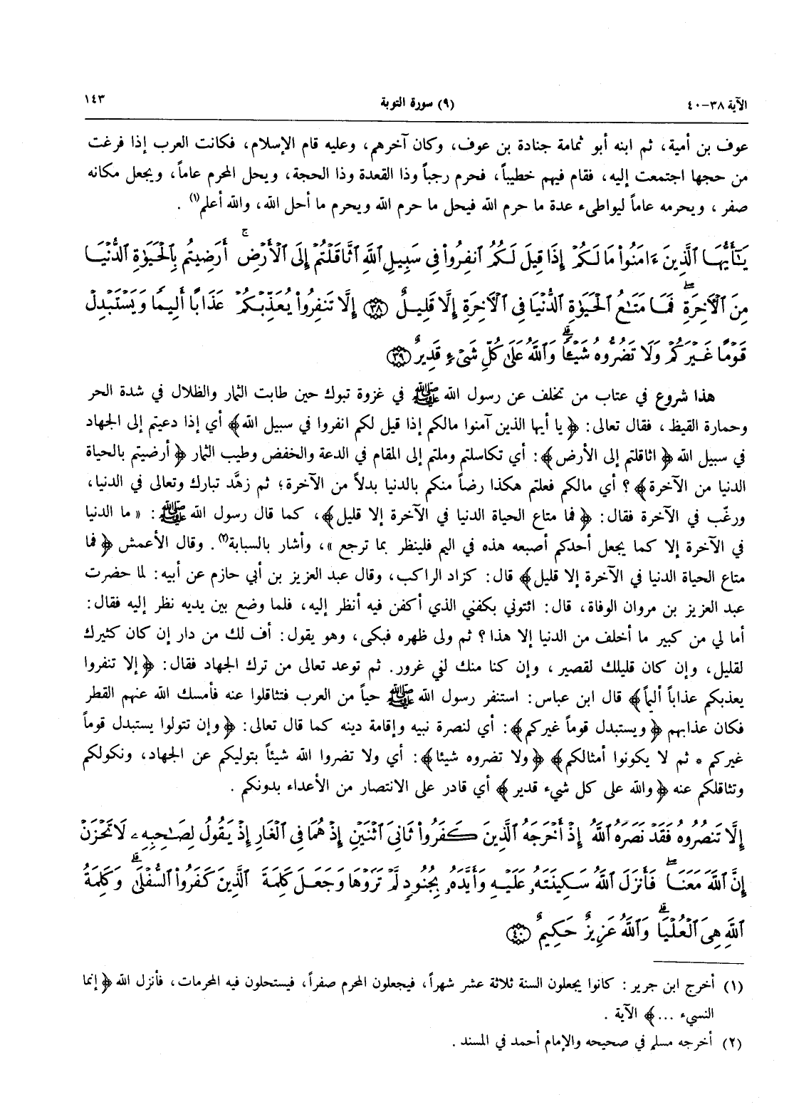- 40 - إِلَّا تَنْصُرُوهُ فَقَدْ نَصَرَهُ اللَّهُ إِذْ أَخْرَجَهُ الَّذِينَ كَفَرُواْ ثَانِيَ اثْنَيْنِ إِذْ هُمَا فِي الْغَارِ إِذْ يَقُولُ لِصَاحِبِهِ لَا تَحْزَنْ إِنَّ اللَّهَ مَعَنَا فَأَنزَلَ اللَّهُ سَكِينَتَهُ عَلَيْهِ وَأَيَّدَهُ بِجُنُودٍ لَّمْ تَرَوْهَا وَجَعَلَ كَلِمَةَ الَّذِينَ كَفَرُواْ السُّفْلَى وَكَلِمَةُ اللَّهِ هِيَ الْعُلْيَا وَاللَّهُ عَزِيزٌ حَكِيمٌ