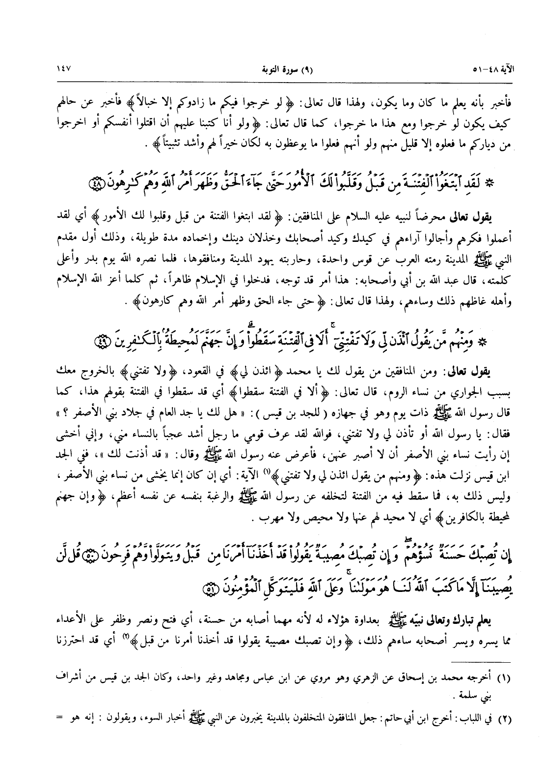 يَقُولُ تَعَالَى: وَمِنَ الْمُنَافِقِينَ مَنْ يَقُولُ لَكَ يَا مُحَمَّدُ {ائْذَنْ لِي} فِي الْقُعُودِ، {وَلاَ تَفْتِنِّي} بِالْخُرُوجِ مَعَكَ بِسَبَبِ الْجَوَارِي مِنْ نساء الروم، قال تَعَالَى: {أَلا فِي الْفِتْنَةِ سَقَطُواْ} أَيْ قَدْ سَقَطُوا فِي الْفِتْنَةِ بِقَوْلِهِمْ هَذَا، كَمَا قَالَ رَسُولُ اللَّهِ صَلَّى اللَّهُ عَلَيْهِ وَسَلَّمَ ذَاتَ يَوْمٍ وَهُوَ فِي جَهَازِهِ (لِلْجَدِّ بْنِ قَيْسٍ): «هَلْ لَكَ يَا جَدُّ الْعَامَ فِي جِلَادِ بني الأصفر؟» فقال: يا رسول الله أو تأذن لِي وَلَا تَفْتِنِّي، فَوَاللَّهِ لَقَدْ عَرَفَ قَوْمِي مَا رَجُلٌ أَشَدُّ عَجَبًا بِالنِّسَاءِ مِنِّي، وَإِنِّي أخشى إن رأيت نساء بني الأصفر أن لَا أَصْبِرُ عَنْهُنَّ، فَأَعْرَضَ عَنْهُ رَسُولُ اللَّهِ صَلَّى اللَّهُ عَلَيْهِ وَسَلَّمَ وَقَالَ: «قَدْ أَذِنْتُ لَكَ»، فَفِي الْجَدِّ بْنِ قَيْسٍ نَزَلَتْ هَذِهِ: {وَمِنْهُمْ مَنْ يَقُولُ ائْذَنْ لِّي وَلاَ تَفْتِنِّي} (أخرجه محمد بن إسحاق عن الزهري وهو مروي عن ابن عباس ومجاهد وغير واحد، وكان الجد بن قيس من أشراف بني سلمة) الآية: أي إن كان يَخْشَى مِنْ نِسَاءِ بَنِي الْأَصْفَرِ، وَلَيْسَ ذَلِكَ به، فما سقط فيه من الفتنة لتخلفه عَنْ رَسُولِ اللَّهِ صَلَّى اللَّهُ عَلَيْهِ وَسَلَّمَ والرغبة بنفسه عن نفسه أعظم، {وَإِنَّ جَهَنَّمَ لَمُحِيطَةٌ بِالْكَافِرِينَ} أَيْ لَا مَحِيدَ لَهُمْ عَنْهَا وَلَا مَحِيصَ وَلَا مَهْرَبَ.
