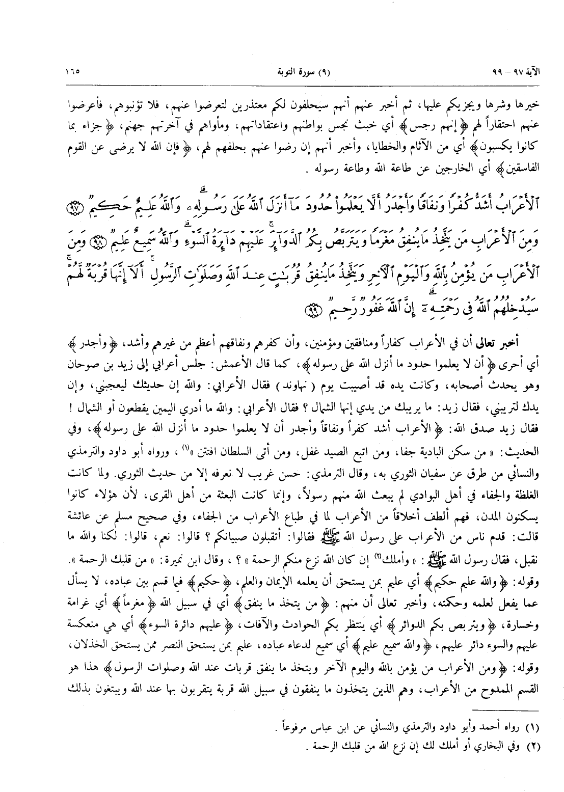 - 97 - الْأَعْرَابُ أَشَدُّ كُفْراً وَنِفَاقاً وَأَجْدَرُ أَلاَّ يَعْلَمُواْ حُدُودَ مَآ أَنْزَلَ اللَّهُ عَلَى رَسُولِهِ وَاللَّهُ عَلِيمٌ حَكِيمٌ