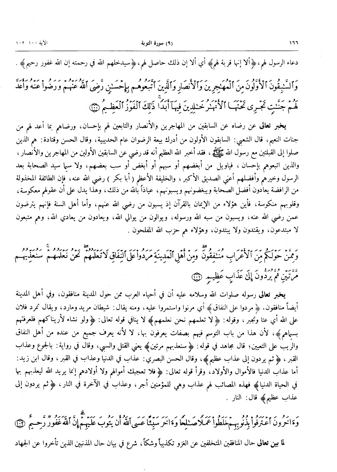 - 100 - وَالسَّابِقُونَ الْأَوَّلُونَ مِنَ الْمُهَاجِرِينَ وَالْأَنْصَارِ وَالَّذِينَ اتَّبَعُوهُمْ بِإِحْسَانٍ رَّضِيَ اللَّهُ عَنْهُمْ وَرَضُواْ عَنْهُ وَأَعَدَّ لَهُمْ جَنَّاتٌ تَجْرِي تَحْتِهَا الْأَنْهَارُ خَالِدِينَ فِيهَا أَبَدًا ذَلِكَ الْفَوْزُ الْعَظِيمُ