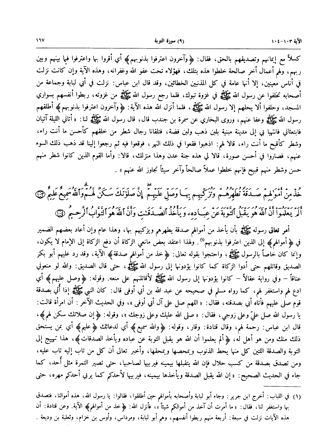 أَمَرَ تَعَالَى رَسُولَهُ صَلَّى اللَّهُ عَلَيْهِ وَسَلَّمَ بأن يأخذ مِنْ أَمْوَالِهِمْ صَدَقَةً يطهرهم بها وَيُزَكِّيهِمْ بِهَا، وَهَذَا عَامٌّ وَإِنْ أَعَادَ بَعْضُهُمُ الضَّمِيرَ فِي {أَمْوَالِهِمْ} إِلَى الَّذِينَ اعْتَرَفُوا بِذُنُوبِهِمْ (في اللباب: أخرج ابن جرير: وجاء أبو لبابة وأصحابه بأموالهم حين أطلقوا، فقالوا: يا رسول الله هذه أموالنا، فتصدق بها واستغفر لنا، فقال: «ما أمرت أن آخذ من أموالكم شيئاً»، فأنزل الله: {خُذْ مِنْ أَمْوَالِهِمْ} الآية. وعن قتادة: أن هذه الآيات نزلت في سبعة: أربعة منهم ربطوا أنفسهم، وهم أبو لبابة، ومرداس، وأوس ابن خزان، وثعلبة بن وديعة). ولهذا اعتقد بعض مانعي الزكاة أَنَّ دَفْعِ الزَّكَاةِ إِلَى الْإِمَامِ لَا يَكُونُ، وإنما كان خاصاً بالرسول صلى الله عليه وسلم، واحتجوا بقوله تعالى: {خُذْ مِنْ أَمْوَالِهِمْ صَدَقَةً} الآية، وقد رد عليهم أبو بكر الصدّيق وقاتلهم حتى أدوا الزكاة كَمَا كَانُوا يُؤَدُّونَهَا إِلَى رَسُولِ اللَّهِ صَلَّى اللَّهُ عَلَيْهِ وَسَلَّمَ، حَتَّى قَالَ الصِّدِّيقُ: وَاللَّهِ لو منعوني عناقاً - وفي رواية عقالاً - كَانُوا يُؤَدُّونَهَا إِلَى رَسُولِ اللَّهِ صَلَّى اللَّهُ عَلَيْهِ وَسَلَّمَ لَأُقَاتِلَنَّهُمْ عَلَى مَنْعِهِ. وَقَوْلُهُ: {وَصَلِّ عَلَيْهِمْ} أَيْ ادْعُ لَهُمْ وَاسْتَغْفِرْ لَهُمْ، كَمَا رَوَاهُ مُسْلِمٌ فِي صَحِيحِهِ عَنْ عَبْدِ اللَّهِ بْنِ أَبِي أَوْفَى قَالَ: كَانَ النَّبِيُّ صَلَّى اللَّهُ عَلَيْهِ وَسَلَّمَ إِذَا أُتي بِصَدَقَةِ قَوْمٍ صَلَّى عَلَيْهِمْ فَأَتَاهُ أَبِي بِصَدَقَتِهِ، فَقَالَ: «اللَّهُمَّ صَلِّ عَلَى آلِ أَبِي أَوْفَى»، وَفِي الْحَدِيثِ الْآخَرِ: أَنَّ امْرَأَةً قَالَتْ: يَا رَسُولَ اللَّهِ صَلِّ عَلَيَّ وَعَلَى زَوْجِي، فَقَالَ: «صَلَّى اللَّهُ عَلَيْكِ وَعَلَى زَوْجِكِ»، وقوله: {إن صلاتك سَكَنٌ لَّهُمْ}، قَالَ ابْنُ عَبَّاسٍ: رَحْمَةٌ لَهُمْ، وَقَالَ قَتَادَةُ: وَقَارٌ، وَقَوْلُهُ: {وَاللَّهُ سَمِيعٌ} أَيْ لِدُعَائِكَ {عَلِيمٌ} أَيْ بِمَنْ يَسْتَحِقُّ ذَلِكَ مِنْكَ ومن هو أهل له، {أَلَمْ يَعْلَمُوا أَنَّ اللَّهَ هُوَ يَقْبَلُ التَّوْبَةَ عَنْ عِبَادِهِ وَيَأْخُذُ الصَّدَقَاتِ}، هَذَا تَهْيِيجٌ إِلَى التَّوْبَةِ وَالصَّدَقَةِ اللَّتَيْنِ كَلَّ مِنْهَا يَحُطُّ الذُّنُوبَ وَيُمَحِّصُهَا وَيَمْحَقُهَا، وَأَخْبَرَ تَعَالَى أَنَّ كُلَّ مَنْ تَابَ إِلَيْهِ تَابَ عَلَيْهِ، وَمَنْ تَصَدَّقَ بِصَدَقَةٍ من كسب حلال فإن الله يَتَقَبَّلُهَا بِيَمِينِهِ فَيُرَبِّيهَا لِصَاحِبِهَا، حَتَّى تَصِيرَ التَّمْرَةُ مثل أُحد، كما جاء في الحديث الصحيح: «إِنَّ اللَّهَ يَقْبَلُ الصَّدَقَةَ وَيَأْخُذُهَا بِيَمِينِهِ، فَيُرَبِّيهَا لِأَحَدِكُمْ كَمَا يُرَبِّي أَحَدُكُمْ مُهْرَهُ، حَتَّى