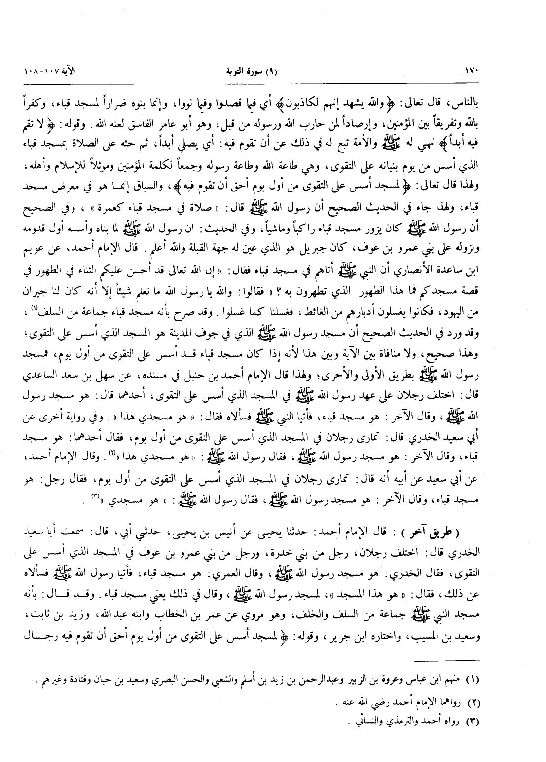 قال الإمام أحمد، عن عويم بن ساعدة الأنصاري أَنَّ النَّبِيَّ صَلَّى اللَّهُ عَلَيْهِ وَسَلَّمَ أَتَاهُمْ فِي مَسْجِدِ قُبَاءٍ فَقَالَ: «إِنَّ اللَّهَ تَعَالَى قَدْ أَحْسَنَ عَلَيْكُمُ الثَّنَاءَ فِي الطَّهُورِ فِي قِصَّةِ مَسْجِدِكُمْ فَمَا هَذَا الطَّهُورُ الَّذِي تَطَهَّرُونَ بِهِ؟» فَقَالُوا: وَاللَّهِ يَا رَسُولَ اللَّهِ مَا نَعْلَمُ شَيْئًا إِلَّا أَنَّهُ كَانَ لَنَا جِيرَانٌ مِنَ الْيَهُودِ، فَكَانُوا يَغْسِلُونَ أَدْبَارَهُمْ مِنَ الْغَائِطِ، فغسلنا كما غسلوا. وَقَدْ صَرَّحَ بِأَنَّهُ مَسْجِدُ قُبَاءٍ جَمَاعَةٌ مِنَ السلف (منهم ابن عباس وعروة بْنُ الزُّبَيْرِ وَعَبْدُ الرَّحْمَنِ بْنُ زَيْدِ بْنِ أَسْلَمَ وَالشَّعْبِيُّ والحسن البصري وسعيد بن حبان وقتادة وغيرهم). وَقَدْ وَرَدَ فِي الْحَدِيثِ الصَّحِيحِ أَنَّ مَسْجِدِ رَسُولِ اللَّهِ صَلَّى اللَّهُ عَلَيْهِ وَسَلَّمَ الَّذِي في جوف المدنية هُوَ الْمَسْجِدُ الَّذِي أُسِّسَ عَلَى التَّقْوَى؛ وَهَذَا صَحِيحٌ، وَلَا مُنَافَاةَ بَيْنَ الْآيَةِ وَبَيْنَ هَذَا لِأَنَّهُ إِذَا كَانَ مَسْجِدُ قُبَاءٍ قَدْ أُسِّسَ عَلَى التَّقْوَى مِنْ أَوَّلِ يَوْمٍ، فَمَسْجِدُ رَسُولِ اللَّهِ صَلَّى اللَّهُ عَلَيْهِ وَسَلَّمَ بِطَرِيقِ الْأَوْلَى وَالْأَحْرَى؛ وَلِهَذَا قَالَ الْإِمَامُ أَحْمَدُ بْنُ حَنْبَلٍ فِي مُسْنَدِهِ، عَنْ سَهْلِ بْنِ سَعْدٍ السَّاعِدِيِّ قَالَ: اخْتَلَفَ رَجُلَانِ عَلَى عَهْدِ رَسُولِ اللَّهِ صَلَّى اللَّهُ عَلَيْهِ وَسَلَّمَ فِي الْمَسْجِدِ الَّذِي أُسِّسَ عَلَى التقوى، أحدهما قال: هو مَسْجِدِ رَسُولِ اللَّهِ صَلَّى اللَّهُ عَلَيْهِ وَسَلَّمَ، وَقَالَ الْآخَرُ: هُوَ مَسْجِدِ قُبَاءٍ، فَأَتَيَا النَّبِيَّ صَلَّى اللَّهُ عَلَيْهِ وَسَلَّمَ فَسَأَلَاهُ فَقَالَ: «هو مسجدي هذا». وفي رواية أخرى عن أبي سعيد الخدري قَالَ: تَمَارَى رَجُلَانِ فِي الْمَسْجِدِ الَّذِي أُسِّسَ عَلَى التَّقْوَى مِنْ أَوَّلِ يوم، فَقَالَ أَحَدُهُمَا: هُوَ مَسْجِدُ قُبَاءٍ، وَقَالَ الْآخَرُ: هو مَسْجِدِ رَسُولِ اللَّهِ صَلَّى اللَّهُ عَلَيْهِ وَسَلَّمَ، فَقَالَ رَسُولُ اللَّهِ صَلَّى اللَّهُ عَلَيْهِ وَسَلَّمَ: «هو مسجدي هذا» (رواهما الإمام أحمد رضي الله عنه). وقال الإمام أحمد، عن أَبِي سَعِيدٍ عَنْ أَبِيهِ أَنَّهُ قَالَ: تَمَارَى رَجُلَانِ فِي الْمَسْجِدِ الَّذِي أُسِّسَ عَلَى التَّقْوَى مِنْ أَوَّلِ يَوْمٍ، فَقَالَ رَجُلٌ: هُوَ مَسْجِدُ قُبَاءٍ، وَقَالَ الْآخَرُ: هُوَ مَسْجِدِ رَسُولِ اللَّهِ صَلَّى اللَّهُ عَلَيْهِ وَسَلَّمَ، فَقَالَ رَسُولُ اللَّهِ صَلَّى اللَّهُ عَلَيْهِ وَسَلَّمَ: «هو مسجدي». (رواه أحمد والترمزي والنسائي).