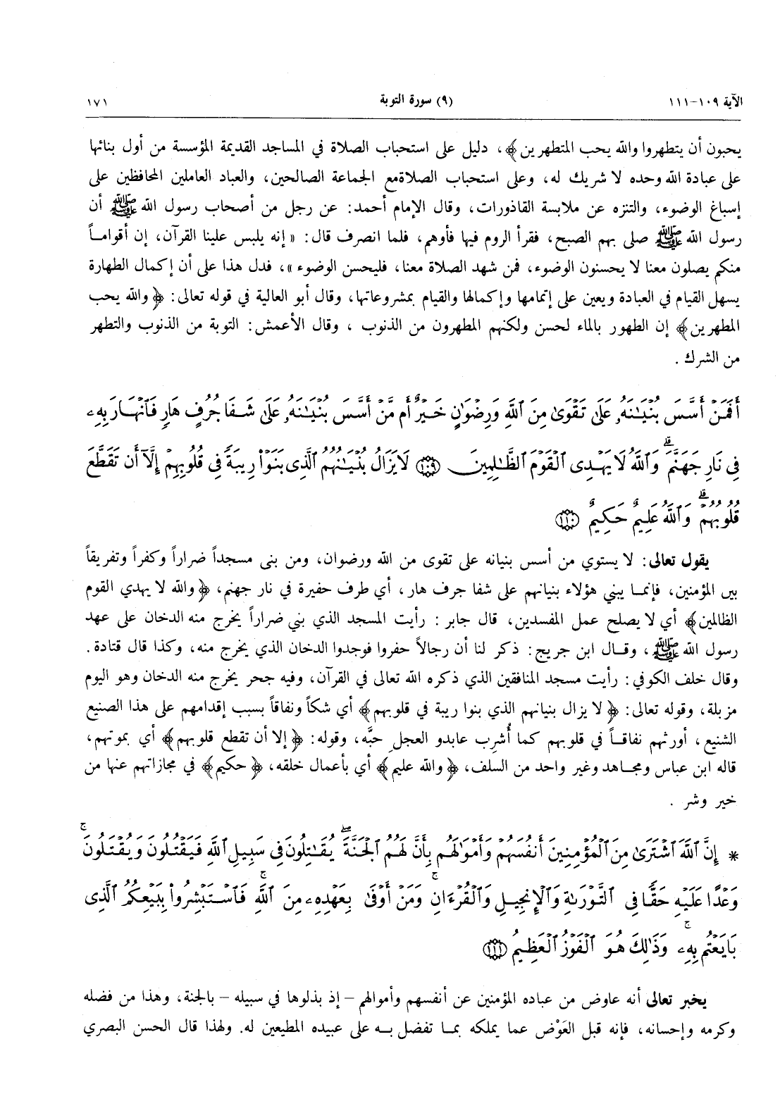 - 111 - إِنَّ اللَّهَ اشْتَرَى مِنَ الْمُؤْمِنِينَ أَنفُسَهُمْ وَأَمْوَالَهُمْ بِأَنَّ لَهُمُ الْجَنَّةَ يُقَاتِلُونَ فِي سَبِيلِ اللَّهِ فَيَقْتُلُونَ وَيُقْتَلُونَ وَعْداً عَلَيْهِ حَقّاً فِي التَّوْرَاةِ والإِنجيل وَالْقُرْآنِ وَمَنْ أَوْفَى بِعَهْدِهِ مِنَ اللَّهِ فَاسْتَبْشِرُوا بِبَيْعِكُمُ الذِي بَايَعْتُمْ بِهِ وَذَلِكَ هُوَ الفوز العظيم
