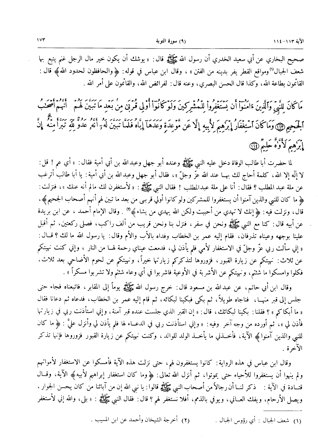 - 113 - مَا كَانَ لِلنَّبِيِّ وَالَّذِينَ آمَنُوا أَن يَسْتَغْفِرُواْ لِلْمُشْرِكِينَ وَلَوْ كَانُوا أُوْلِي قُرْبَى مِنْ بَعْدِ مَا تَبَيَّنَ لَهُمْ أَنَّهُمْ أَصْحَابُ الْجَحِيمِ