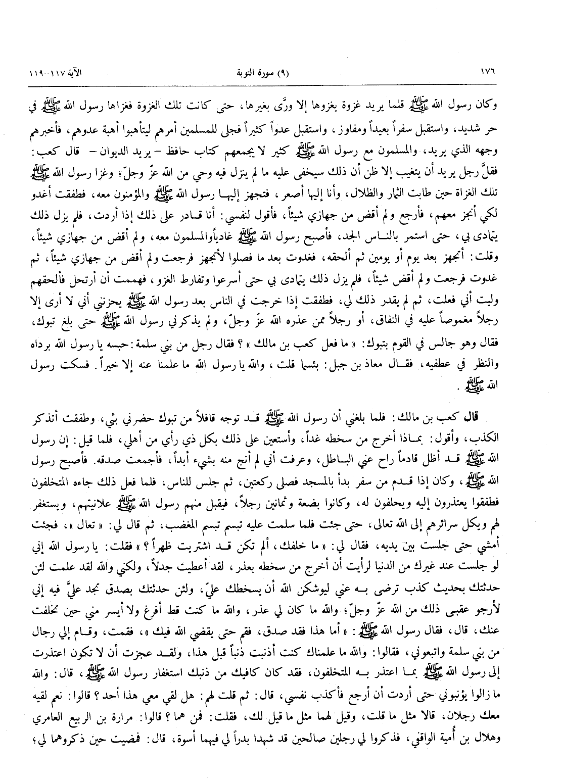وَكَانَ رَسُولُ اللَّهِ صَلَّى اللَّهُ عَلَيْهِ وَسَلَّمَ قَلَّمَا يُرِيدُ غَزْوَةً يَغْزُوهَا إِلَّا ورَّى بِغَيْرِهَا، حَتَّى كَانَتْ تِلْكَ الْغَزْوَةُ فَغَزَاهَا رَسُولُ اللَّهِ صَلَّى اللَّهُ عَلَيْهِ وَسَلَّمَ فِي حَرٍّ شَدِيدٍ، واستقبل سفراً بعيداً ومفاوز، وَاسْتَقْبَلَ عَدُوًّا كَثِيرًا فَجَلَّى لِلْمُسْلِمِينَ أَمْرَهُمْ لِيَتَأَهَّبُوا أُهْبَةَ عَدُوِّهِمْ، فَأَخْبَرَهُمْ وَجْهَهُ الَّذِي يُرِيدُ، وَالْمُسْلِمُونَ مَعَ رَسُولِ اللَّهِ صَلَّى اللَّهُ عَلَيْهِ وَسَلَّمَ كَثِيرٌ لَا يَجْمَعُهُمْ كِتَابٌ حَافِظٌ - يُرِيدُ الدِّيوَانَ -. قال كَعْبٌ: فقلَّ رَجُلٌ يُرِيدُ أَن يَتَغَيَّبَ إِلَّا ظن أن ذلك سيخفى عليه مَا لَمْ يَنْزِلْ فِيهِ وَحْيٌ مِنَ اللَّهِ عَزَّ وَجَلَّ؛ وَغَزَا رَسُولُ اللَّهِ صَلَّى اللَّهُ عَلَيْهِ وَسَلَّمَ تِلْكَ الْغَزَاةَ حِينَ طَابَتِ الثِّمَارُ والظلال، وَأَنَا إِلَيْهَا أَصْعَرُ، فَتَجَهَّزَ إِلَيْهَا رَسُولُ اللَّهِ صَلَّى اللَّهُ عَلَيْهِ وَسَلَّمَ والمؤمنون معه، فطفقت أغدو لكي أنجز مَعَهُمْ، فَأَرْجِعُ وَلَمْ أَقْضِ مِنْ جِهَازِي شَيْئًا، فَأَقُولُ لِنَفْسِي: أَنَا قَادِرٌ عَلَى ذَلِكَ إِذَا أَرَدْتُ، فَلَمْ يَزَلْ ذَلِكَ يَتَمَادَى بِي، حَتَّى استمر بِالنَّاسِ الْجَدُّ، فَأَصْبَحَ رَسُولُ اللَّهِ صَلَّى اللَّهُ عَلَيْهِ وَسَلَّمَ غَادِيًا وَالْمُسْلِمُونَ مَعَهُ، وَلَمْ أَقْضِ من جهازي شيئاً، وقلت: أتجهز بَعْدَ يَوْمٍ أَوْ يَوْمَيْنِ ثُمَّ أَلْحَقُهُ، فَغَدَوْتُ بعد ما فصلوا لأتجهز فرجعت ولم أقض من جهازي شيئاً، ثُمَّ غَدَوْتُ فَرَجَعْتُ وَلَمْ أَقْضِ شَيْئًا، فَلَمْ يَزَلْ ذَلِكَ يَتَمَادَى بِي حَتَّى أَسْرَعُوا وَتَفَارَطَ الغزو، فهممت أن أرتحل فألحقهم وَلَيْتَ أَنِّي فَعَلْتُ، ثُمَّ لَمْ يُقَدَّرْ ذَلِكَ لِي، فَطَفِقْتُ إِذَا خَرَجْتُ فِي النَّاسِ بَعْدَ رَسُولِ اللَّهِ صَلَّى اللَّهُ عَلَيْهِ وَسَلَّمَ يحزنني أني لا أَرَى إِلَّا رَجُلًا مَغْمُوصًا عَلَيْهِ فِي النِّفَاقِ، أَوْ رَجُلًا مِمَّنْ عَذَرَهُ اللَّهُ عَزَّ وَجَلَّ، وَلَمْ يَذْكُرْنِي رَسُولُ اللَّهِ صَلَّى اللَّهُ عَلَيْهِ وَسَلَّمَ حَتَّى بَلَغَ تَبُوكَ، فَقَالَ وَهُوَ جَالِسٌ فِي الْقَوْمِ بِتَبُوكَ: «مَا فَعَلَ كَعْبُ بْنُ مالك»؟ فقال رَجُلٌ مِنْ بَنِي سَلَمَةَ: حَبَسَهُ يَا رَسُولَ الله برداه والنظر في عطفيه، فقال مُعَاذُ بْنُ جَبَلٍ: بِئْسَمَا قُلْتَ، وَاللَّهِ يَا رسول الله ما علمنا عنه إِلَّا خَيْرًا. فَسَكَتَ رَسُولُ اللَّهِ صَلَّى اللَّهُ عَلَيْهِ وَسَلَّمَ.