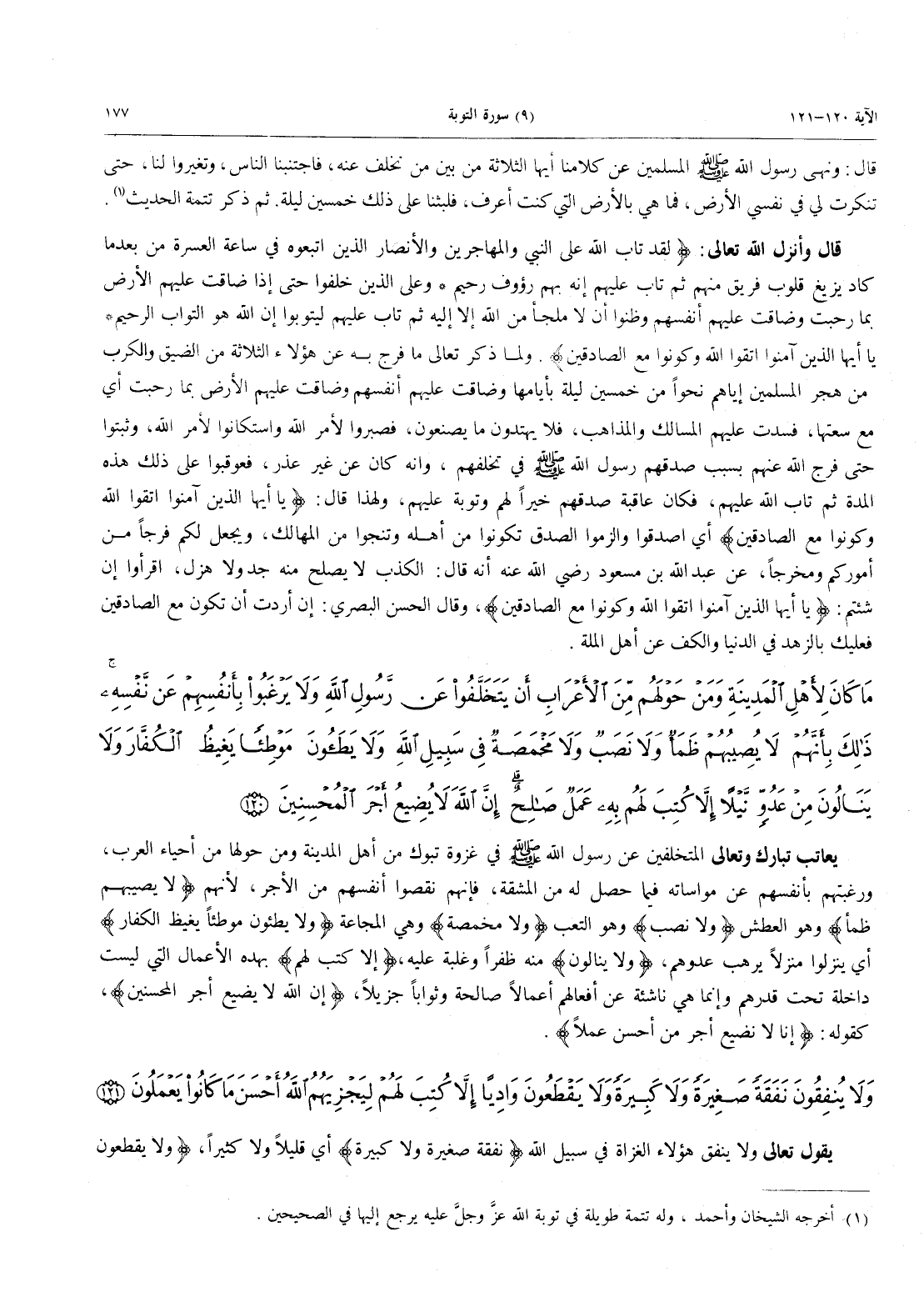 - 120 - مَا كَانَ لأَهْلِ الْمَدِينَةِ وَمَنْ حَوْلَهُمْ مِنَ الْأَعْرَابِ أَنْ يَتَخَلَّفُوا عَنْ رَسُولِ اللَّهِ وَلَا يَرْغَبُوا بِأَنْفُسِهِمْ عَنْ نَفْسِهِ ذَلِكَ بِأَنَّهُمْ لاَ يُصِيبُهُمْ ظَمَأٌ وَلَا نَصَبٌ وَلَا مَخْمَصَةٌ فِي سبيل الله ولا يطؤون مَوْطِئاً يَغِيظُ الكفار ولاينالون مِنْ عَدُوٍّ نَيْلًا إِلاَّ كُتِبَ لَهُمْ بِهِ عَمَلٌ صَالِحٌ إِنَّ اللَّهَ لَا يُضِيعُ أَجْرَ المحسنين
