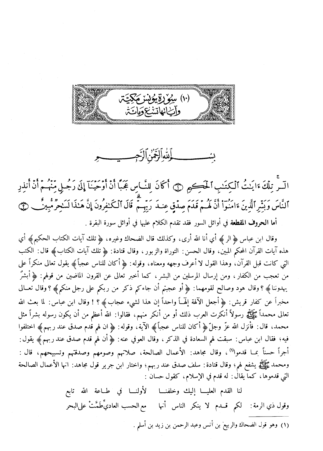 وقال أبن عباس {الر} أي أنا الله أرى، وكذلك قَالَ الضَّحَّاكُ وَغَيْرُهُ، {تِلْكَ آيَاتُ الْكِتَابِ الْحَكِيمِ} أَيْ هَذِهِ آيَاتُ الْقُرْآنِ الْمُحْكَمِ الْمُبِينِ، وَقَالَ الْحَسَنُ: التَّوْرَاةُ وَالزَّبُورُ، وَقَالَ قَتَادَةُ: {تِلْكَ آيَاتُ الْكِتَابِ} قَالَ: الْكُتُبُ الَّتِي كَانَتْ قَبْلَ الْقُرْآنِ، وهذا القول لا أعرف وجهه ومعناه: {أَكَانَ لِلنَّاسِ عَجَباً} يَقُولُ تَعَالَى مُنْكِرًا عَلَى مَنْ تَعَجَّبَ مِنَ الكفار، ومن إِرْسَالِ الْمُرْسَلِينَ مِنَ الْبَشَرِ، كَمَا أَخْبَرَ تَعَالَى عن القرون الماضين من قولهم: {أبشر يهدوننا}؟ وقال هود وصالح لقومهما: {أَوَ عَجِبْتُمْ أَن جَآءَكُمْ ذِكْرٌ مِّن رَّبِّكُمْ عَلَى رَجُلٍ منكم}؟ وقال تعالى مخبراً عن كفار قريش: {أَجَعَلَ الْآلِهَةَ إِلَهًا وَاحِداً إِنَّ هَذَا لَشَيْءٌ عجاب}؟! وقال ابْنِ عَبَّاسٍ: لَمَّا بَعَثَ اللَّهُ تَعَالَى مُحَمَّدًا صَلَّى اللَّهُ عَلَيْهِ وَسَلَّمَ رَسُولًا أَنْكَرَتِ الْعَرَبُ ذَلِكَ أَوْ مِن أَنْكَرَ مِنْهُمْ، فَقَالُوا: اللَّهُ أَعْظَمُ مِنْ أَنْ يَكُونَ رَسُولُهُ بَشَرًا مِثْلَ مُحَمَّدٍ، قَالَ فَأَنْزَلَ اللَّهُ عزَّ وجلَّ {أَكَانَ لِلنَّاسِ عَجَباً} الآية، وَقَوْلُهُ: {أَنَّ لَهُمْ قَدَمَ صِدْقٍ عِندَ رَبِّهِمْ} اختلفوا فيه؛ فقال ابن عباس: سبقت لهم السعادة في الذكر، وقال العوفي عنه: {أَنَّ لَهُمْ قَدَمَ صِدْقٍ عِندَ رَبِّهِمْ} يَقُولُ: أجراً حسناً بما قدموا (وهو قول الضَّحَّاكُ وَالرَّبِيعُ بْنُ أنَس وَعَبْدُ الرَّحْمَنِ بْنُ زَيْدِ بْنِ أَسْلَمَ)، وَقَالَ مجاهد: الأعمال الصالحة، صلاتهم وصومهم وصدقتهم وتسبيحهم، قال: ومحمد صلى الله عليه وسلم يشفع لهم؛ وَقَالَ قَتَادَةُ سَلَفُ صِدْقٍ عِنْدَ رَبِّهِمْ؛ وَاخْتَارَ ابْنُ جَرِيرٍ قَوْلَ مُجَاهِدٍ: أَنَّهَا الْأَعْمَالُ الصَّالِحَةُ التي قدموها، كما يقال: له قدم في الإسلام، كقول حسان: