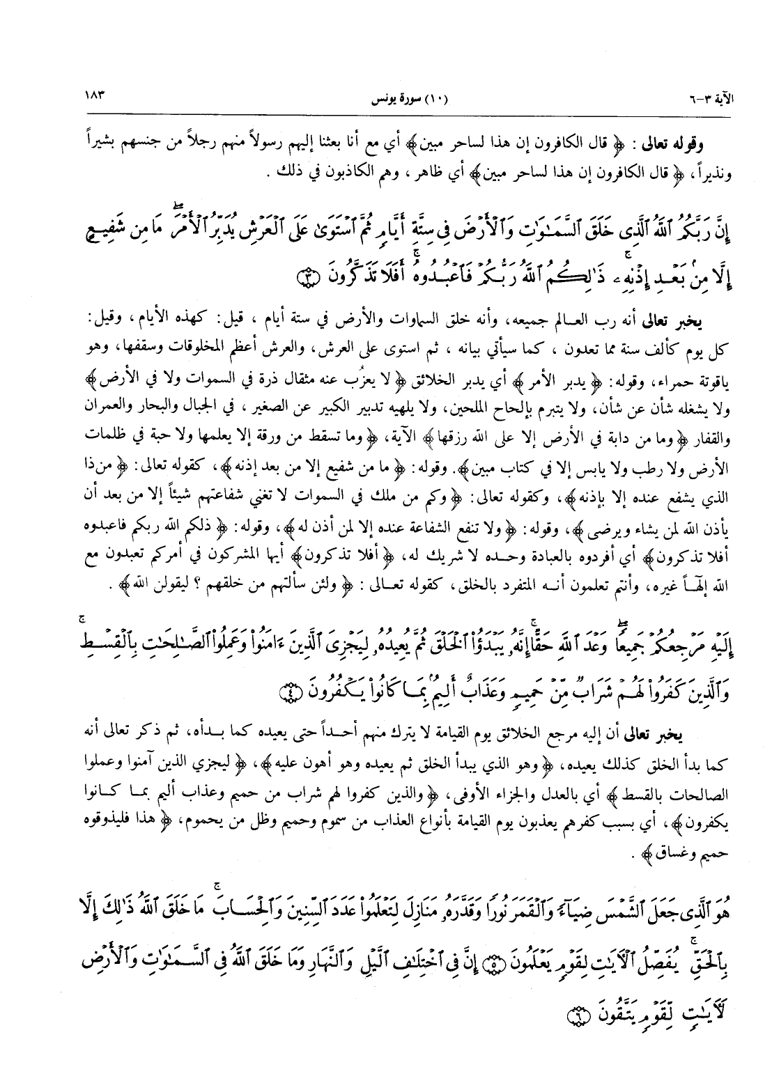 - 3 - إِنَّ رَبَّكُمُ اللَّهُ الَّذِي خَلَقَ السَّمَاوَاتِ وَالْأَرْضَ فِي سِتَّةِ أَيَّامٍ ثُمَّ اسْتَوَى عَلَى الْعَرْشِ يُدَبِّرُ الْأَمْرَ مَا مِن شَفِيعٍ إِلاَّ مِن بَعْدِ إِذْنِهِ ذَلِكُمُ اللَّهُ رَبُّكُمْ فَاعْبُدُوهُ أَفَلاَ تَذَكَّرُونَ