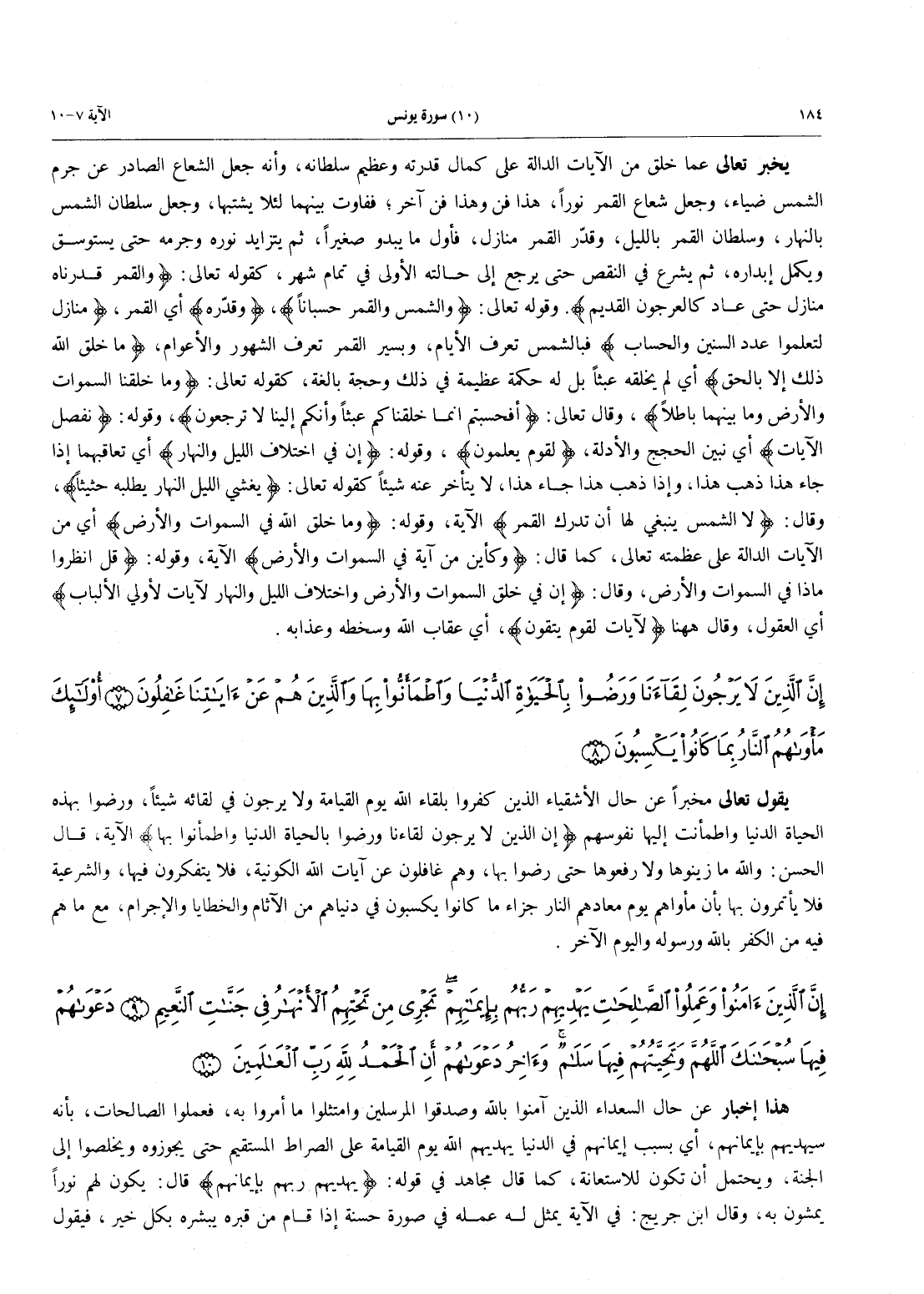 يقول تَعَالَى مُخْبِرًا عَنْ حَالِ الْأَشْقِيَاءِ الَّذِينَ كَفَرُوا بِلِقَاءِ اللَّهِ يَوْمَ الْقِيَامَةِ وَلَا يَرْجُونَ فِي لقائه شَيْئًا، وَرَضُوا بِهَذِهِ الْحَيَاةِ الدُّنْيَا وَاطْمَأَنَّتْ إِلَيْهَا نفوسهم {إِنَّ الَّذِينَ لاَ يَرْجُونَ لِقَآءَنَا وَرَضُوا بِالْحَيَاةِ الدنيا واطمأنوا بِهَا} الآية، قَالَ الْحَسَنُ: وَاللَّهِ مَا زَيَّنُوهَا وَلَا رَفَعُوهَا حَتَّى رَضُوا بِهَا، وَهُمْ غَافِلُونَ عَنْ آيَاتِ اللَّهِ الْكَوْنِيَّةِ، فَلَا يَتَفَكَّرُونَ فِيهَا، وَالشَّرْعِيَّةِ فَلَا يَأْتَمِرُونَ بِهَا بِأَنَّ مَأْوَاهُمْ يَوْمَ مَعَادِهِمُ النَّارُ جزاء مَّا كَانُواْ يَكْسِبُونَ في ديناهم مِنَ الْآثَامِ وَالْخَطَايَا وَالْإِجْرَامِ، مَعَ مَا هُمْ فِيهِ مِنَ الْكُفْرِ بِاللَّهِ وَرَسُولِهِ وَالْيَوْمِ الْآخِرِ.