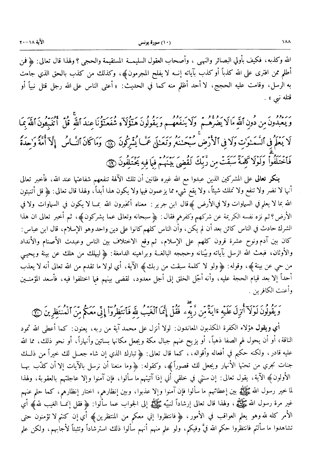 يُنْكِرُ تَعَالَى عَلَى الْمُشْرِكِينَ الَّذِينَ عَبَدُوا مَعَ اللَّهِ غَيْرَهُ ظَانِّينَ أن تلك الآلهة أَنَّ تِلْكَ الْآلِهَةَ تَنْفَعُهُمْ شَفَاعَتُهَا عِنْدَ اللَّهِ، فأخبر تعالى أنها لا تضر ولا تنفع وَلَا تَمْلِكُ شَيْئًا، وَلَا يَقَعُ شَيْءٌ مِمَّا يَزْعُمُونَ فِيهَا وَلَا يَكُونُ هَذَا أَبَدًا، وَلِهَذَا قَالَ تَعَالَى: {قُلْ أَتُنَبِّئُونَ اللَّهَ بِمَا لاَ يَعْلَمُ في السماوات ولا في الأرض} قال ابْنُ جَرِيرٍ: مَعْنَاهُ أَتُخَبِّرُونَ اللَّهَ بِمَا لَا يَكُونُ فِي السَّمَاوَاتِ وَلَا فِي الْأَرْضِ؟ ثُمَّ نزه نفسه الكريمة عَنْ شِرْكِهِمْ وَكُفْرِهِمْ فَقَالَ: {سُبْحَانَهُ وَتَعَالَى عَمَّا يُشْرِكُونَ}، ثُمَّ أَخْبَرَ تَعَالَى أَنَّ هَذَا الشِّرْكَ حَادِثٌ فِي النَّاسِ كَائِنٌ بَعْدَ أَنْ لَمْ يَكُنْ، وَأَنَّ النَّاسَ كُلَّهُمْ كَانُوا عَلَى دِينٍ وَاحِدٍ وَهُوَ الْإِسْلَامُ، قَالَ ابْنُ عَبَّاسٍ: كَانَ بَيْنَ آدَمَ وَنُوحٍ عَشَرَةُ قُرُونٍ كُلُّهُمْ عَلَى الْإِسْلَامِ، ثُمَّ وَقَعَ الِاخْتِلَافُ بَيْنَ النَّاسِ وَعُبِدَتِ الْأَصْنَامُ وَالْأَنْدَادُ وَالْأَوْثَانُ، فَبَعَثَ اللَّهُ الرُّسُلَ بِآيَاتِهِ وَبَيِّنَاتِهِ وَحُجَجِهِ الْبَالِغَةِ وَبَرَاهِينِهِ الدَّامِغَةِ: {لِّيَهْلِكَ مَنْ هَلَكَ عَن بَيِّنَةٍ وَيَحْيَى مَنْ حَيَّ عَن بينة}، وقوله: {وَلَوْلاَ كَلِمَةٌ سَبَقَتْ مِن رَّبِّكَ} الآية، أَيْ لَوْلَا مَا تَقَدَّمَ مِنَ اللَّهِ تَعَالَى أَنَّهُ لَا يُعَذِّبُ أَحَدًا إِلَّا بَعْدَ قِيَامِ الْحُجَّةِ عليه، وأنه أَجَّلَ الْخَلْقَ إِلَى أَجَلٍ مَعْدُودٍ، لَقَضَى بَيْنَهُمْ فيما اختلفوا فيه، فَأَسْعَدَ الْمُؤْمِنِينَ وَأَعْنَتَ الْكَافِرِينَ.