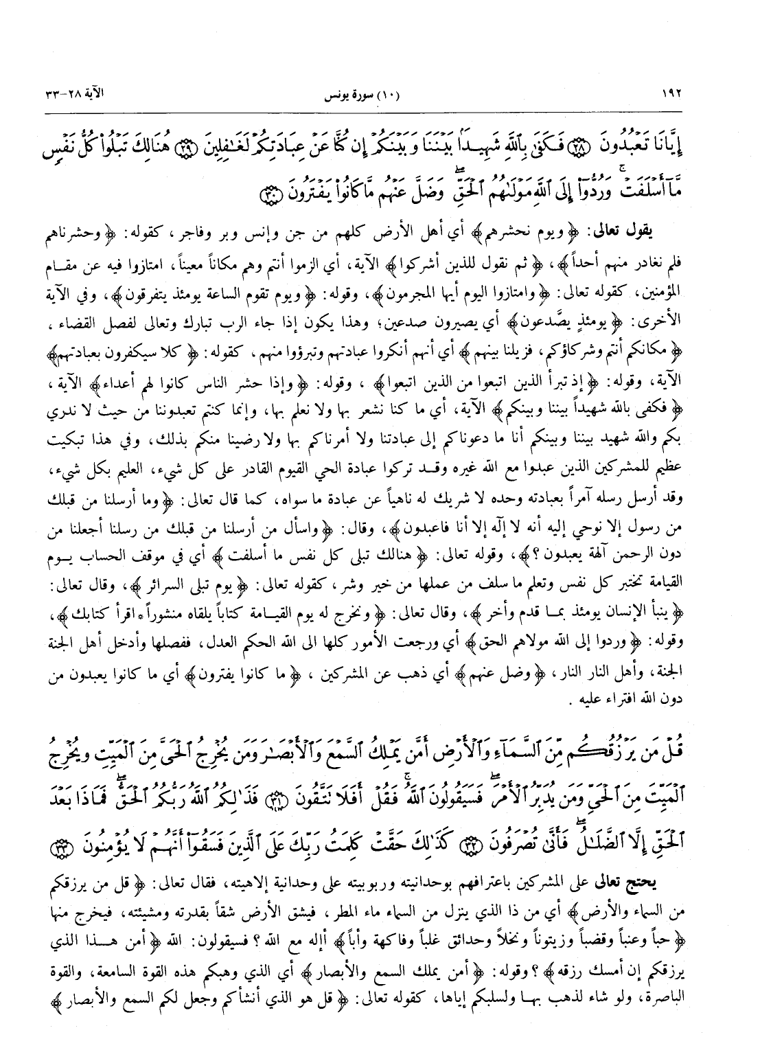 يَقُولُ تَعَالَى: {وَيَوْمَ نَحْشُرُهُمْ} أَيْ أَهْلَ الْأَرْضِ كلهم من جن وإنس وبر وفاجر، كقوله: {وَحَشَرْنَاهُمْ فَلَمْ نُغَادِرْ مِنْهُمْ أحدا}، {ثُمَّ نَقُولُ لِلَّذِينَ أَشْرَكُواْ} الآية، أَيْ الْزَمُوا أَنْتُمْ وَهَمَ مَكَانًا مُعَيَّنًا، امْتَازُوا فيه عن مقام المؤمنين، كقوله تعالى: {وامتازوا اليوم أَيُّهَا المجرمون}، وقوله: {وَيَوْمَ تَقُومُ الساعة يَوْمَئِذٍ يَتَفَرَّقُونَ}، وفي الآية الأُخْرى: {يَوْمَئِذٍ يَصَّدَّعُونَ} أَيْ يَصِيرُونَ صَدْعَيْنِ؛ وَهَذَا يَكُونُ إِذَا جَاءَ الرَّبُّ تَبَارَكَ وَتَعَالَى لِفَصْلِ الْقَضَاءِ، {مَكَانَكُمْ أَنتُمْ وَشُرَكَآؤُكُمْ فَزَيَّلْنَا بَيْنَهُمْ} أي أنهم أنكروا عبادتهم وتبرؤوا منهم، كقوله: {كَلاَّ سَيَكْفُرُونَ بِعِبَادَتِهِمْ} الآية، وقوله: {إِذْ تَبَرَّأَ الَّذِينَ اتُّبِعُوا مِنَ الَّذِينَ اتَّبَعُوا}، وَقَوْلُهُ: {وَإِذَا حُشِرَ النَّاسُ كَانُواْ لَهُمْ أَعْدَآءً} الآية، {فكفى بالله شَهِيداً بَيْنَنَا وَبَيْنَكُمْ} الآية، أَيْ مَا كُنَّا نَشْعُرُ بِهَا وَلَا نَعْلَمُ بها، وإنما كُنْتُمْ تَعْبُدُونَنَا مِنْ حَيْثُ لَا نَدْرِي بِكُمْ وَاللَّهُ شَهِيدٌ بَيْنَنَا وَبَيْنَكُمْ أَنَّا مَا دَعَوْنَاكُمْ إِلَى عِبَادَتِنَا وَلَا أَمَرْنَاكُمْ بِهَا وَلَا رَضِينَا مِنْكُمْ بِذَلِكَ، وَفِي هَذَا تَبْكِيتٌ عَظِيمٌ لِلْمُشْرِكِينَ الذين عبدوا مع الله غيره وقد تركوا عبادة الحي القيوم الْقَادِرِ عَلَى كُلِّ شَيْءٍ، الْعَلِيمِ بِكُلِّ شَيْءٍ، وقد أرسل رسله آمِرًا بِعِبَادَتِهِ وَحْدَهُ لَا شَرِيكَ لَهُ نَاهِيًا عَنْ عِبَادَةِ مَا سِوَاهُ، كَمَا قَالَ تَعَالَى: {وَمَآ أَرْسَلْنَا مِن قَبْلِكَ مِن رَّسُولٍ إِلاَّ نُوحِي إِلَيْهِ أَنَّهُ لَا إِلَهَ إِلاَّ أَنَاْ فاعبدون}، وَقَالَ: {وَاسْأَلْ مَنْ أَرْسَلْنَا مِن قَبْلِكَ مِن رُّسُلِنَآ أَجَعَلْنَا مِن دُونِ الرَّحْمَنِ آلِهَةً يُعْبَدُونَ؟}، وقوله تعالى: {هُنَالِكَ تَبْلُواْ كُلُّ نَفْسٍ مَّآ أَسْلَفَتْ} أَيْ فِي مَوْقِفِ الْحِسَابِ يَوْمَ الْقِيَامَةِ تُخْتَبَرُ كُلُّ نَفْسٍ وَتَعْلَمُ ما سلف من عملها من خير وشر، كقوله تعالى: {يَوْمَ تبلى السرآئر}، وَقَالَ تَعَالَى: {يُنَبَّأُ الْإِنْسَانُ يَوْمَئِذٍ بِمَا قَدَّمَ وَأَخَّرَ}، وَقَالَ تَعَالَى: {وَنُخْرِجُ لَهُ يَوْمَ الْقِيَامَةِ كِتَاباً يَلْقَاهُ مَنْشُوراً * اقرأ كتابك}، وَقَوْلُهُ: {وَرُدُّوا إِلَى اللَّهِ مَوْلاَهُمُ الْحَقِّ} أَيْ وَرَجَعْتِ الْأُمُورُ كُلُّهَا إِلَى اللَّهِ الْحَكَمِ الْعَدْلِ، فَفَصَّلَهَا وَأَدْخَلَ أَهْلَ الْجَنَّةِ الْجَنَّةَ، وَأَهْلَ النَّارِ النَّارَ، {وَضَلَّ عَنْهُمْ} أَيْ ذَهَبَ عَنِ الْمُشْرِكِينَ، {مَا كَانُواْ يَفْتَرُونَ} أَيْ مَا كَانُواْ يَعْبُدُونَ مِن دُونِ اللَّهِ افْتِرَاءً عَلَيْهِ.