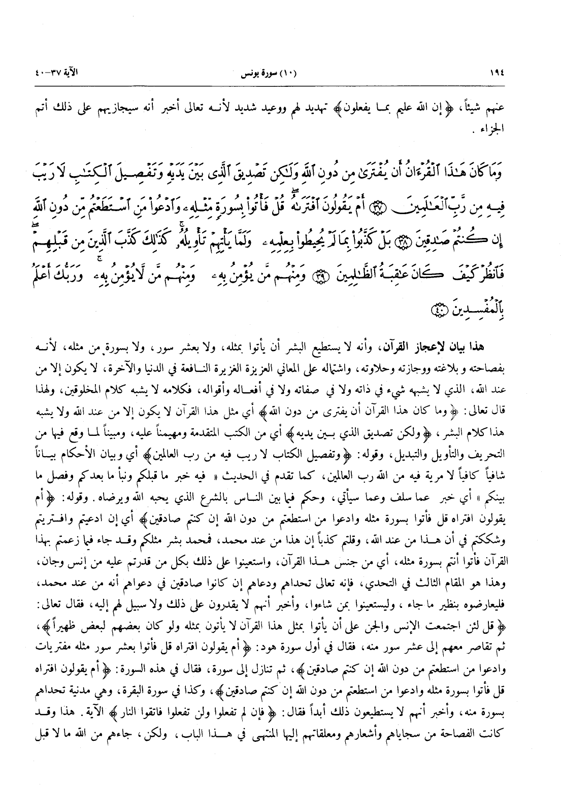 هَذَا بَيَانٌ لِإِعْجَازِ الْقُرْآنِ، وَأَنَّهُ لَا يَسْتَطِيعُ الْبَشَرُ أَنْ يَأْتُوا بِمِثْلِهِ، وَلَا بِعَشْرِ سُوَرٍ، وَلَا بِسُورَةٍ مِنْ مِثْلِهِ، لِأَنَّهُ بِفَصَاحَتِهِ وَبَلَاغَتِهِ وَوَجَازَتِهِ وحلاوته، واشتماله على المعاني العزيزة الغزيرة النَّافِعَةِ فِي الدُّنْيَا وَالْآخِرَةِ، لَا يَكُونُ إِلَّا مِنْ عِنْدِ اللَّهِ، الَّذِي لَا يُشْبِهُهُ شَيْءٌ في ذاته ولا في صِفَاتِهِ وَلَا فِي أَفْعَالِهِ وَأَقْوَالِهِ، فَكَلَامُهُ لَا يُشْبِهُ كَلَامَ الْمَخْلُوقِينَ، وَلِهَذَا قَالَ تَعَالَى: {وَمَا كَانَ هَذَا الْقُرْآنُ أَنْ يُفْتَرَى مِنْ دُونِ اللَّهِ} أَيْ مِثْلُ هَذَا الْقُرْآنِ لَا يَكُونُ إِلاَّ مِنْ عِندِ اللَّهِ وَلَا يُشْبِهُ هَذَا كَلَامَ الْبَشَرِ، وَلَكِنْ تَصْدِيقَ الَّذِي بَيْنَ يَدَيْهِ} أي من الكتب المتقدمة ومهيمناً عليه، وَمُبَيِّنًا لِمَا وَقَعَ فِيهَا مِنَ التَّحْرِيفِ وَالتَّأْوِيلِ وَالتَّبْدِيلِ، وَقَوْلُهُ: {وَتَفْصِيلَ الْكِتَابِ لاَ رَيْبَ فِيهِ مِن رَّبِّ الْعَالَمِينَ} أي وبيان الأحكام بياناً شافياً كافياً لَا مِرْيَةَ فِيهِ مِنَ اللَّهِ رَبِّ الْعَالَمِينَ، كما تقدم في الحديث «فِيهِ خَبَرُ مَا قَبْلَكُمْ وَنَبَأُ مَا بَعْدَكُمْ وَفَصْلُ مَا بَيْنَكُمْ» أَيْ خَبَرٌ عَمَّا سَلَفَ وَعَمَّا سَيَأْتِي، وَحُكْمٌ فِيمَا بَيْنَ النَّاسِ بِالشَّرْعِ الَّذِي يُحِبُّهُ اللَّهُ وَيَرْضَاهُ. وَقَوْلُهُ: {أَمْ يَقُولُونَ افْتَرَاهُ قُلْ فَأْتُواْ بِسُورَةٍ مِّثْلِهِ وَادْعُوا مَنِ اسْتَطَعْتُمْ مِّن دُونِ اللَّهِ إِن كُنتُمْ صَادِقِينَ} أَيْ إِنِ ادَّعَيْتُمْ وَافْتَرَيْتُمْ وَشَكَكْتُمْ فِي أَنَّ هذا من عند الله، وقلتم كذباً إِنَّ هَذَا مِنْ عِنْدِ مُحَمَّدٍ، فَمُحَمَّدٌ بَشَرٌ مِثْلُكُمْ وَقَدْ جَاءَ فِيمَا زَعَمْتُمْ بِهَذَا الْقُرْآنِ فَأْتُوا أَنْتُمْ بِسُورَةٍ مِثْلِهِ، أَيْ مِنْ جِنْسِ هذا الْقُرْآنِ، وَاسْتَعِينُوا عَلَى ذَلِكَ بِكُلِّ مَنْ قَدَرْتُمْ عَلَيْهِ مِنْ إِنْسٍ وَجَانٍّ، وَهَذَا هُوَ الْمَقَامُ الثَّالِثُ فِي التَّحَدِّي، فَإِنَّهُ تَعَالَى تَحَدَّاهُمْ وَدَعَاهُمْ إِن كَانُواْ صَادِقِينَ فِي دَعْوَاهُمْ أَنَّهُ مِنْ عند محمد، فليعارضوه بنظير ما جاء، ولسيتعينوا بمن شاءوا، وَأَخْبَرَ أَنَّهُمْ لَا يَقْدِرُونَ عَلَى ذَلِكَ وَلَا سَبِيلَ لَهُمْ إِلَيْهِ، فَقَالَ تَعَالَى: {قُلْ لَّئِنِ اجْتَمَعَتِ الْإِنْسُ وَالْجِنُّ عَلَى أَن يَأْتُواْ بِمِثْلِ هَذَا الْقُرْآنِ لاَ يَأْتُونَ بِمِثْلِهِ وَلَوْ كَانَ بَعْضُهُمْ لِبَعْضٍ ظَهِيراً}، ثُمَّ تَقَاصَرَ مَعَهُمْ إِلَى عَشْرِ سُوَرٍ مِنْهُ، فَقَالَ فِي أَوَّلِ سُورَةِ هُودٍ: {أَمْ يَقُولُونَ افْتَرَاهُ قُلْ فَأْتُواْ بِعَشْرِ سُوَرٍ مِّثْلِهِ مُفْتَرَيَاتٍ وَادْعُوا مَنِ اسْتَطَعْتُمْ مِّن دُونِ اللَّهِ إِن كُنتُمْ صَادِقِينَ}، ثُمَّ تَنَازَلَ إِلَى سُورَةٍ، فَقَالَ فِي هَذِهِ السُّورَةِ: {أَمْ يَقُولُونَ افْتَرَاهُ قُلْ فَأْتُواْ بِسُورَةٍ مِّثْلِهِ وَادْعُوا مَنِ اسْتَطَعْتُمْ مِّن دُونِ اللَّهِ إِن كُنتُمْ صَادِقِينَ}، وَكَذَا فِي سُورَةِ الْبَقَرَةِ، وَهِيَ مَدَنِيَّةٌ تَحَدَّاهُمْ بِسُورَةٍ مِنْهُ، وَأَخْبَرَ أَنَّهُمْ لَا يَسْتَطِيعُونَ ذَلِكَ أَبَدًا فَقَالَ: {فَإِن لَّمْ تَفْعَلُواْ وَلَن تَفْعَلُواْ فَاتَّقُوا النَّارَ} الآية. وهذا وَقَدْ كَانَتِ الْفَصَاحَةُ مِنْ سَجَايَاهُمْ وَأَشْعَارِهِمْ وَمُعَلَّقَاتِهِمْ إليها المنتهى من هَذَا الْبَابِ، وَلَكِنْ، جَاءَهُمْ مِنَ اللَّهِ مَا لَا قِبَلَ