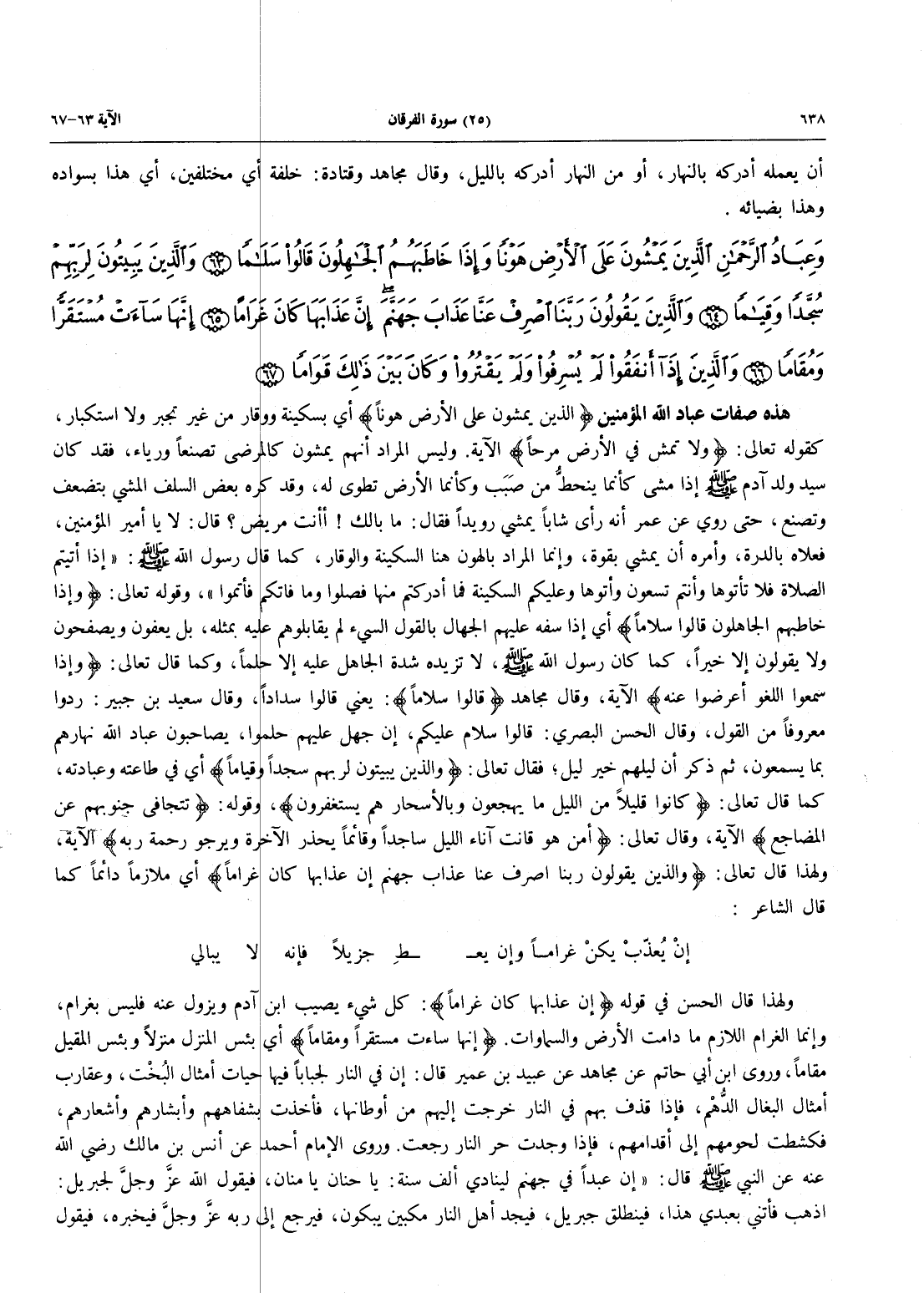 هَذِهِ صِفَاتُ عِبَادِ اللَّهِ الْمُؤْمِنِينَ {الَّذِينَ يَمْشُونَ عَلَى الْأَرْضِ هَوْناً} أَيْ بِسَكِينَةٍ وَوَقَارٍ من غير تجبر ولا استكبار، كقوله تعالى: {وَلاَ تَمْشِ فِي الأرض مرحا} الآية. وليس المراد أنهم يمشون كالمرضى تَصَنُّعًا وَرِيَاءً، فَقَدْ كَانَ سَيِّدُ وَلَدِ آدَمَ محمد صَلَّى اللَّهُ عَلَيْهِ وَسَلَّمَ إِذَا مَشَى كَأَنَّمَا ينحطُّ مِنْ صَبَب وَكَأَنَّمَا الْأَرْضُ تُطْوَى لَهُ، وَقَدْ كَرِهَ بَعْضُ السَّلَفِ الْمَشْيَ بِتَضَعُّفٍ وَتَصَنُّعٍ، حَتَّى رَوِيَ عَنْ عُمَرَ أَنَّهُ رَأَى شَابًّا يمشي رويداً قال: مَا بَالَكَ! أَأَنْتَ مَرِيضٌ؟ قَالَ: لَا يَا أَمِيرَ الْمُؤْمِنِينَ، فَعَلَاهُ بِالدِّرَّةِ وَأَمَرَهُ أَنْ يَمْشِيَ بقوة، وإنما المراد بالهون هنا السَّكِينَةُ وَالْوَقَارُ، كَمَا قَالَ رَسُولُ اللَّهِ صَلَّى اللَّهُ عَلَيْهِ وَسَلَّمَ: «إِذَا أَتَيْتُمُ الصَّلَاةَ فَلَا تَأْتُوهَا وَأَنْتُمْ تَسْعَوْنَ وَأْتُوهَا وَعَلَيْكُمُ السِّكِينَةُ فَمَا أدركتم منها فصلوا وما فاتكم فأتموا»، وقوله تعالى: {وَإِذَا خَاطَبَهُمُ الجَاهِلُونَ قَالُواْ سَلاَماً} أَيْ إِذَا سفه عليهم الجهال بالقول السيء لَمْ يُقَابِلُوهُمْ عَلَيْهِ بِمِثْلِهِ، بَلْ يَعْفُونَ وَيَصْفَحُونَ وَلَا يَقُولُونَ إِلَّا خَيْرًا، كَمَا كَانَ رَسُولُ اللَّهِ صَلَّى اللَّهُ عَلَيْهِ وَسَلَّمَ، لَا تَزِيدُهُ شدة الجاهل عَلَيْهِ إِلَّا حِلْمًا، وَكَمَا قَالَ تَعَالَى: {وَإِذَا سَمِعُواْ اللغو أَعْرَضُواْ عَنْهُ} الآية، وَقَالَ مُجَاهِدٌ {قَالُواْ سَلاَماً}: يَعْنِي قَالُوا سَدَادًا، وَقَالَ سَعِيدُ بْنُ جُبَيْرٍ: رَدُّوا مَعْرُوفًا مِنَ القول، وقال الحسن البصري: قالوا سلام عليكم، إن جُهِلَ عَلَيْهِمْ حَلُمُوا، يُصَاحِبُونَ عِبَادَ اللَّهِ نَهَارَهُمْ بما يسمعون، ثم ذكر أن ليلهم خير ليل؛ فقال تعالى: {وَالَّذِينَ يِبِيتُونَ لِرَبِّهِمْ سُجَّداً وَقِيَاماً} أَيْ فِي طاعته وعبادته، كَمَا قَالَ تَعَالَى: {كَانُواْ قَلِيلاً مِّن اللَّيْلِ مَا يَهْجَعُونَ وَبِالْأَسْحَارِ هُمْ يَسْتَغْفِرُونَ}، وقوله: {تتجافى جُنُوبُهُمْ عَنِ المضاجع} الآية، وقال تعالى: {أَمَّنْ هُوَ قَانِتٌ آنَآءَ اللَّيْلِ سَاجِداً وَقَآئِماً يَحْذَرُ الآخرة ويرجو رحمة ربه} الآية، ولهذا قال تعالى: {وَالَّذِينَ يَقُولُونَ رَبَّنَا اصْرِفْ عَنَّا عَذَابَ جَهَنَّمَ إِنَّ عَذَابَهَا كَانَ غَرَاماً} أَيْ مُلَازِمًا دَائِمًا كَمَا قَالَ الشَّاعِرُ: إنْ يُعذّبْ يكنْ غَرَامًا وَإِنْ يُعْـ * طِ جَزِيلَا فَإِنَّهُ لَا يُبَالِي