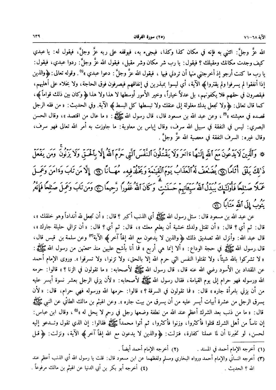 عن عبد الله بن مَسْعُودٍ قَالَ: سُئِلَ رَسُولُ اللَّهِ صَلَّى اللَّهُ عَلَيْهِ وَسَلَّمَ أَيُّ الذَّنْبِ أَكْبَرُ؟ قَالَ: «أَنْ تجعل لله أنداداً وَهُوَ خَلَقَكَ»، قَالَ: ثُمَّ أَيُّ؟ قَالَ: «أَنْ تَقْتُلَ وَلَدَكَ خَشْيَةَ أَنْ يَطْعَمَ مَعَكَ»، قَالَ: ثُمَّ أَيُّ؟ قَالَ: «أَنْ تُزَانِيَ حَلِيلَةَ جَارِكَ»، قَالَ عَبْدُ اللَّهِ: وَأَنْزَلَ اللَّهُ تَصْدِيقَ ذَلِكَ {وَالَّذِينَ لاَ يَدْعُونَ مَعَ اللَّهِ إِلَهًا آخَرَ} الآية (أخرجه النسائي والإمام أحمد ورواه البخاري ومسلم وَلَفْظُهُمَا عَنِ ابْنِ مَسْعُودٍ قَالَ: قُلْتُ يَا رَسُولَ اللَّهِ أَيُّ الذنب أعظم عند الله؟ الحديث) وعن سَلَمَةَ بْنِ قَيْسٍ قَالَ، قَالَ رَسُولُ اللَّهِ صَلَّى اللَّهُ عَلَيْهِ وَسَلَّمَ فِي حِجَّةِ الْوَدَاعِ: «أَلَا إِنَّمَا هِيَ أَرْبَعٌ» فَمَا أَنَا بِأَشَحَّ عليهن مُنْذُ سَمِعْتُهُنَّ مِنْ رَسُولِ اللَّهِ صَلَّى اللَّهُ عَلَيْهِ وَسَلَّمَ: «لَا تُشْرِكُوا بِاللَّهِ شَيْئًا، وَلاَ تَقْتُلُواْ النَّفْسَ الَّتِي حَرَّمَ اللَّهُ إِلاَّ بِالْحَقِّ، وَلاَ تَزْنُوا، وَلَا تسرقوا». وروى الإمام أحمد عن المقداد بن الأسود رَضِيَ اللَّهُ عَنْهُ قَالَ، قَالَ رَسُولُ اللَّهِ صَلَّى اللَّهُ عَلَيْهِ وَسَلَّمَ لِأَصْحَابِهِ: «مَا تَقُولُونَ في الزنا؟» قَالُوا: حَرَّمَهُ اللَّهُ وَرَسُولُهُ فَهُوَ حَرَامٌ إِلَى يَوْمِ الْقِيَامَةِ، فَقَالَ رَسُولُ اللَّهِ صَلَّى اللَّهُ عَلَيْهِ وَسَلَّمَ لِأَصْحَابِهِ: «لَأَنْ يَزْنِيَ الرَّجُلُ بِعَشْرِ نِسْوَةٍ أَيْسَرُ عَلَيْهِ مِنْ أَنْ يَزْنِيَ بِامْرَأَةِ جاره» قال: «فما تَقُولُونَ فِي السَّرِقَةِ؟» قَالُوا: حَرَّمَهَا اللَّهُ وَرَسُولُهُ فَهِيَ حَرَامٌ، قَالَ: «لَأَنْ يَسْرِقَ الرَّجُلُ مِنْ عَشْرَةِ أَبْيَاتٍ أَيْسَرُ عَلَيْهِ مِنْ أَنْ يَسْرِقَ من بيت جاره». وعن الهيثم بن مالك الطائي عَنِ النَّبِيِّ صَلَّى اللَّهُ عَلَيْهِ وَسَلَّمَ قَالَ: «مَا مِنْ ذَنْبٍ بَعْدَ الشِّرْكِ أَعْظَمُ عِنْدَ اللَّهِ مِنْ نُطْفَةٍ وَضَعَهَا رَجُلٌ فِي رَحِمٍ لَا يَحِلُّ لَهُ» (أخرجه أبو بكر بن أبي الدنيا عن الهيثم بن مالك مرفوعاً)، وقال ابْنِ عَبَّاسٍ: أَنَّ نَاسًا مِنْ أَهْلِ الشِّرْكِ قَتَلُوا فَأَكْثَرُوا، وَزَنَوْا فَأَكْثَرُوا، ثُمَّ أَتَوْا مُحَمَّدًا صَلَّى اللَّهُ عَلَيْهِ وَسَلَّمَ فَقَالُوا: إِنَّ الَّذِي تَقُولُ وَتَدْعُو إِلَيْهِ لَحَسَنٌ، لَوْ تُخْبِرُنَا أَنَّ لِمَا عَمِلْنَا كَفَّارَةٌ، فَنَزَلَتْ: {وَالَّذِينَ لاَ يَدْعُونَ مَعَ اللَّهِ إِلَهًا آخَرَ} الآية، ونزلت: {قُلْ