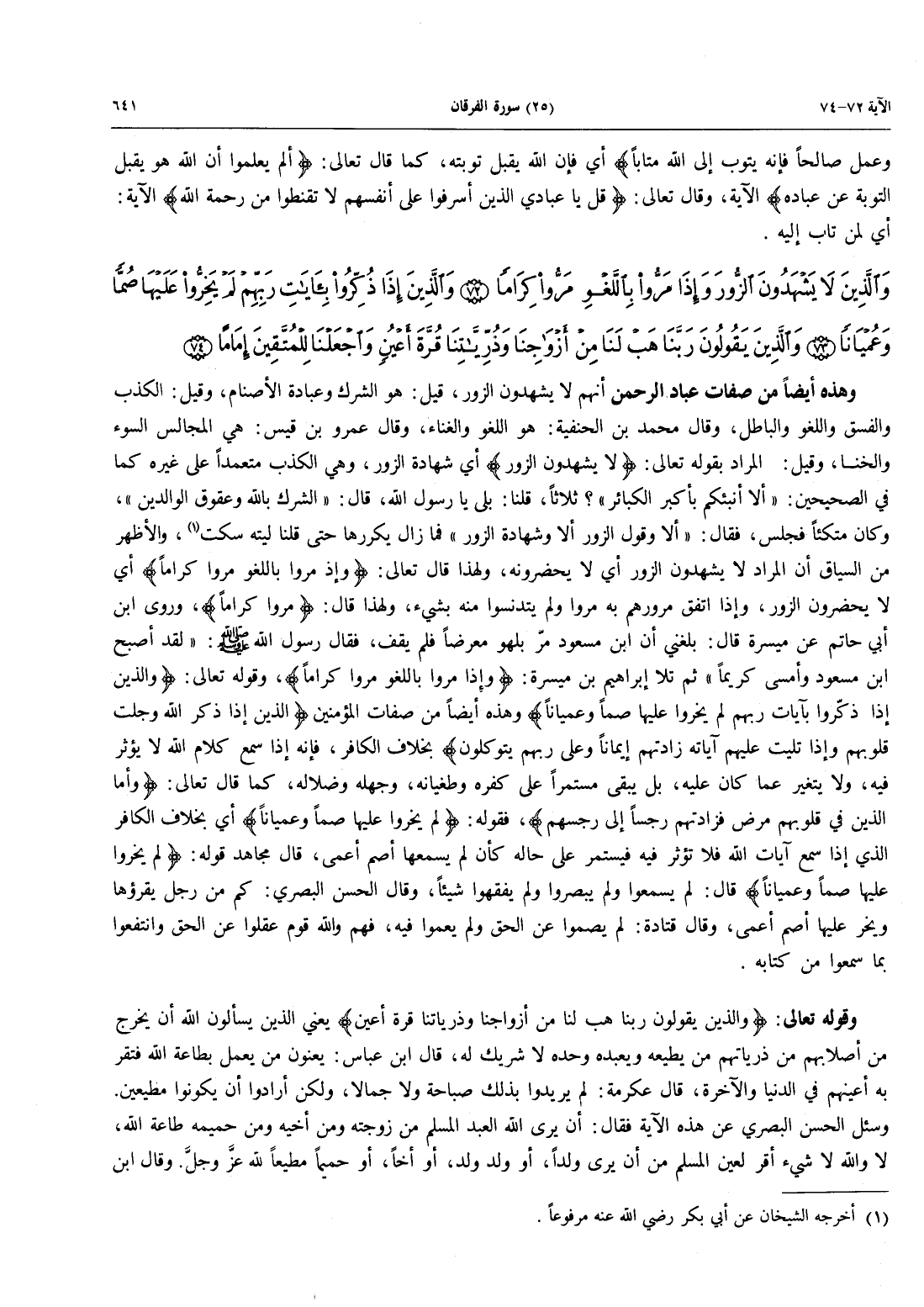 وَهَذِهِ أَيْضًا مِنْ صِفَاتِ عِبَادِ الرَّحْمَنِ أَنَّهُمْ لَا يَشْهَدُونَ الزُّورَ، قِيلَ: هُوَ الشِّرْكُ وَعِبَادَةُ الْأَصْنَامِ، وَقِيلَ الْكَذِبُ وَالْفِسْقُ وَاللَّغْوُ وَالْبَاطِلُ، وَقَالَ مُحَمَّدُ بْنُ الْحَنَفِيَّةِ: هو اللغو والغناء، وقال عمرو بن قيس: هي المجالس السوء والخنا، وَقِيلَ: الْمُرَادُ بِقَوْلِهِ تَعَالَى: {لَا يَشْهَدُونَ الزُّورَ} أَيْ شَهَادَةُ الزُّورِ، وَهِيَ الْكَذِبُ مُتَعَمَّدًا عَلَى غيره كما في الصحيحين: «أَلَا أُنَبِّئُكُمْ بِأَكْبَرِ الْكَبَائِرِ»؟ ثَلَاثًا، قُلْنَا: بَلَى يَا رَسُولَ اللَّهِ، قَالَ: «الشِّرْكُ بِاللَّهِ وَعُقُوقُ الوالدين»، وكان متكئاً فجاس، فَقَالَ: «أَلَا وَقَوْلُ الزُّورِ أَلَا وَشَهَادَةُ الزُّورِ» فَمَا زَالَ يُكَرِّرُهَا حَتَّى قُلْنَا لَيْتَهُ سَكَتَ (أخرجه الشيخان عن أبي بكر رضي الله عنه مرفوعاً)، وَالْأَظْهَرُ مِنَ السِّيَاقِ أَنَّ الْمُرَادَ لَا يَشْهَدُونَ الزور أي لا يحضرونه، ولهذا قَالَ تَعَالَى: {وَإِذَا مَرُّواْ بِاللَّغْوِ مَرُّوا كِراماً} أَيْ لَا يَحْضُرُونَ الزُّورَ، وَإِذَا اتَّفَقَ مُرُورُهُمْ بِهِ مَرُّوا وَلَمْ يَتَدَنَّسُوا مِنْهُ بِشَيْءٍ، وَلِهَذَا قال: {مَرُّوا كِراماً}، وروى ابن أبي حاتم عن مَيْسَرَةَ قَالَ: بَلَغَنِي أَنَّ ابْنَ مَسْعُودٍ مَرَّ بِلَهْوٍ مُعْرِضًا فَلَمْ يَقِفْ، فَقَالَ رَسُولُ اللَّهِ صَلَّى اللَّهُ عَلَيْهِ وَسَلَّمَ: «لَقَدْ أَصْبَحَ ابْنُ مَسْعُودٍ وَأَمْسَى كَرِيمًا» ثُمَّ تَلَا إِبْرَاهِيمُ بْنُ مَيْسَرَةَ: {وَإِذَا مَرُّواْ بِاللَّغْوِ مَرُّوا كِراماً}، وَقَوْلُهُ تَعَالَى: {وَالَّذِينَ إِذَا ذُكِّرُواْ بِآيَاتِ رَبِّهِمْ لَمْ يَخِرُّواْ عَلَيْهَا صُمّاً وَعُمْيَاناً} وهذه أيضاً مِنْ صِفَاتِ