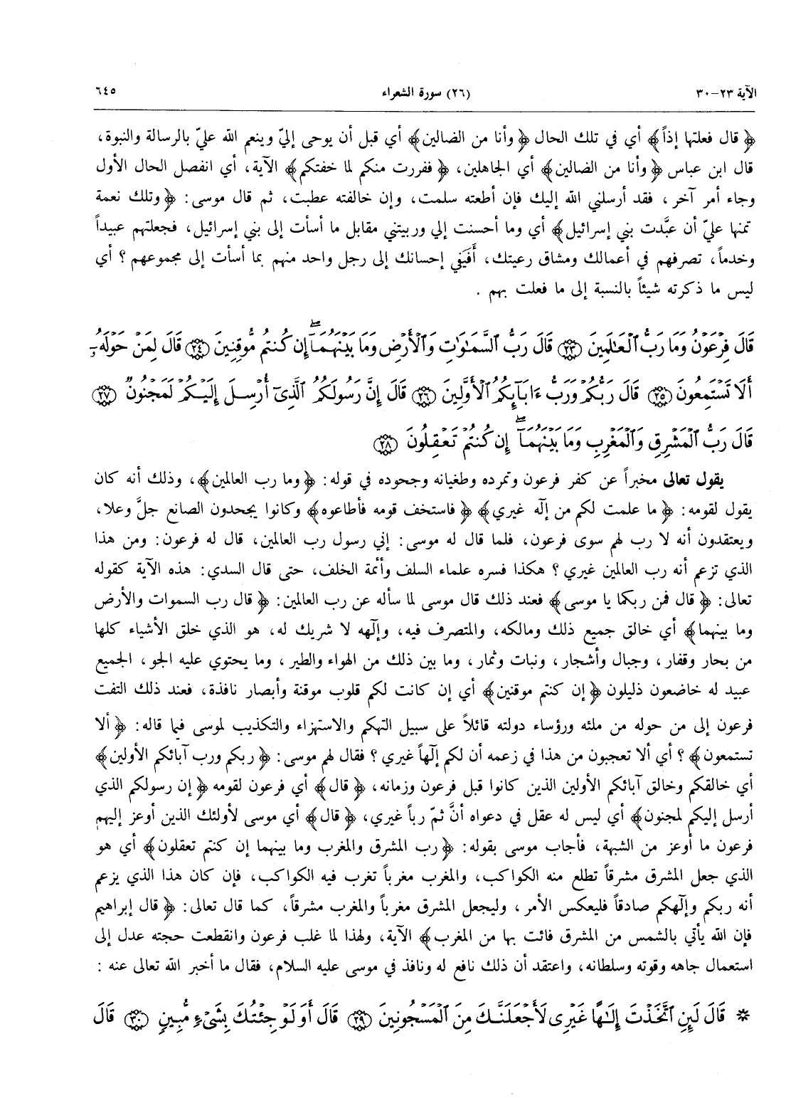 يَقُولُ تَعَالَى مُخْبِرًا عَنْ كُفْرِ فِرْعَوْنَ وَتَمَرُّدِهِ وَطُغْيَانِهِ وَجُحُودِهِ فِي قَوْلِهِ: {وَمَآ رَبُّ الْعَالَمِينَ}، وَذَلِكَ أَنَّهُ كَانَ يَقُولُ لِقَوْمِهِ: {مَا عَلِمْتُ لَكُمْ مِّنْ إله غَيْرِي} {فاستخف قَوْمَهُ فَأَطَاعُوهُ} وكانوا يجحدون الصانع جلَّ وعلا، وَيَعْتَقِدُونَ أَنَّهُ لَا رَبَّ لَهُمْ سِوَى فِرْعَوْنَ، فَلَمَّا قَالَ لَهُ مُوسَى: إِنِّي رَسُولُ رَبُّ العالمين، قَالَ له فرعون: وَمَنْ هَذَا الَّذِي تَزْعُمُ أَنَّهُ رَبُّ الْعَالَمِينَ غَيْرِي؟ هَكَذَا فَسَّرَهُ عُلَمَاءُ السَّلَفِ وَأَئِمَّةُ الْخَلَفِ، حَتَّى قَالَ السُّدِّيُّ: هَذِهِ الْآيَةُ كَقَوْلِهِ تَعَالَى: {قال فمن ربكما يا موسى} فَعِنْدَ ذَلِكَ قَالَ مُوسَى لَمَّا سَأَلَهُ عَنْ رَبُّ الْعَالَمِينَ: {قَالَ رَبُّ السَّمَاوَاتِ وَالْأَرْضِ وَمَا بَيْنَهُمَا} أَيْ خَالِقُ جَمِيعِ ذَلِكَ وَمَالِكُهُ، وَالْمُتَصَرِّفُ فيه، وإلهه لا شريك له، هُوَ الذي خَلَقَ الأشياء كلها من بحار وقفار، وجبال وأشجار، وَنَبَاتٍ وَثِمَارٍ، وَمَا بَيْنَ ذَلِكَ مِنَ الْهَوَاءِ والطير، وَمَا يَحْتَوِي عَلَيْهِ الْجَوُّ، الْجَمِيعُ عَبِيدٌ لَهُ خَاضِعُونَ ذَلِيلُونَ {إِن كُنتُمْ مُّوقِنِينَ} أَيْ إِن كَانَتْ لَكُمُ قُلُوبٌ مُوقِنَةٌ وَأَبْصَارٌ نَافِذَةٌ، فَعِنْدَ ذَلِكَ الْتَفَتَ فِرْعَوْنُ إِلَى مَنْ حَوْلَهُ مِنْ ملئه ورؤساء دولته قائلاً عَلَى سَبِيلِ التَّهَكُّمِ وَالِاسْتِهْزَاءِ وَالتَّكْذِيبِ لِمُوسَى فِيمَا قاله: {أَلاَ تَسْتَمِعُونَ}؟ أي ألا تعجبون من هَذَا فِي زَعْمِهِ أَنَّ لَكُمْ إِلَهًا غَيْرِي؟ فَقَالَ لَهُمْ مُوسَى: {رَبُّكُمْ وَرَبُّ آبَآئِكُمُ الْأَوَّلِينَ} أي خالقكم وخالق آبائكم الأولين الذين كَانُوا قَبْلَ فِرْعَوْنَ وَزَمَانِهِ، {قَالَ} أَيْ فِرْعَوْنُ لِقَوْمِهِ {إِنَّ رَسُولَكُمُ الَّذِي أُرْسِلَ إِلَيْكُمْ لَمَجْنُونٌ} أَيْ لَيْسَ لَهُ عَقْلٌ فِي دَعْوَاهُ أنَّ ثَمَّ رِبًّا غَيْرِي، {قَالَ} أَيْ مُوسَى لِأُولَئِكَ الَّذِينَ أَوْعَزَ إِلَيْهِمْ فِرْعَوْنُ مَا أَوْعَزَ مِنَ الشُّبْهَةِ، فَأَجَابَ مُوسَى بِقَوْلِهِ: {رَّبُّ الْمَشْرِقِ وَالْمَغْرِبِ وَمَا بَيْنَهُمَآ إِن كُنتُمْ تَعْقِلُونَ} أَيْ هُوَ الَّذِي جَعَلَ الْمَشْرِقَ مَشْرِقًا تَطَلُعُ مِنْهُ الْكَوَاكِبُ، والمغرب مغرباً تغرب فيه الكواكب، فَإِنْ كَانَ هَذَا الَّذِي يَزْعُمُ أَنَّهُ رَبُّكُمْ وَإِلَهُكُمْ صَادِقًا فَلْيَعْكِسِ الْأَمْرَ، وَلِيَجْعَلِ الْمَشْرِقَ مَغْرِبًا والمغرب مشرقاً، كما قال تعالى: {قَالَ إِبْرَاهِيمُ فَإِنَّ اللَّهَ يَأْتِي بِالشَّمْسِ مِنَ المشرق فائت بِهَا مِنَ المغرب} الآية، وَلِهَذَا لَمَّا غُلِبَ فِرْعَوْنُ وَانْقَطَعَتْ حُجَّتُهُ عَدَلَ إِلَى اسْتِعْمَالِ جَاهِهِ وَقُوَّتِهِ وَسُلْطَانِهِ، وَاعْتَقَدَ أَنَّ ذَلِكَ نَافِعٌ لَهُ وَنَافِذٌ فِي مُوسَى عَلَيْهِ السَّلَامُ، فَقَالَ مَا أَخْبَرَ اللَّهُ تَعَالَى عَنْهُ:
