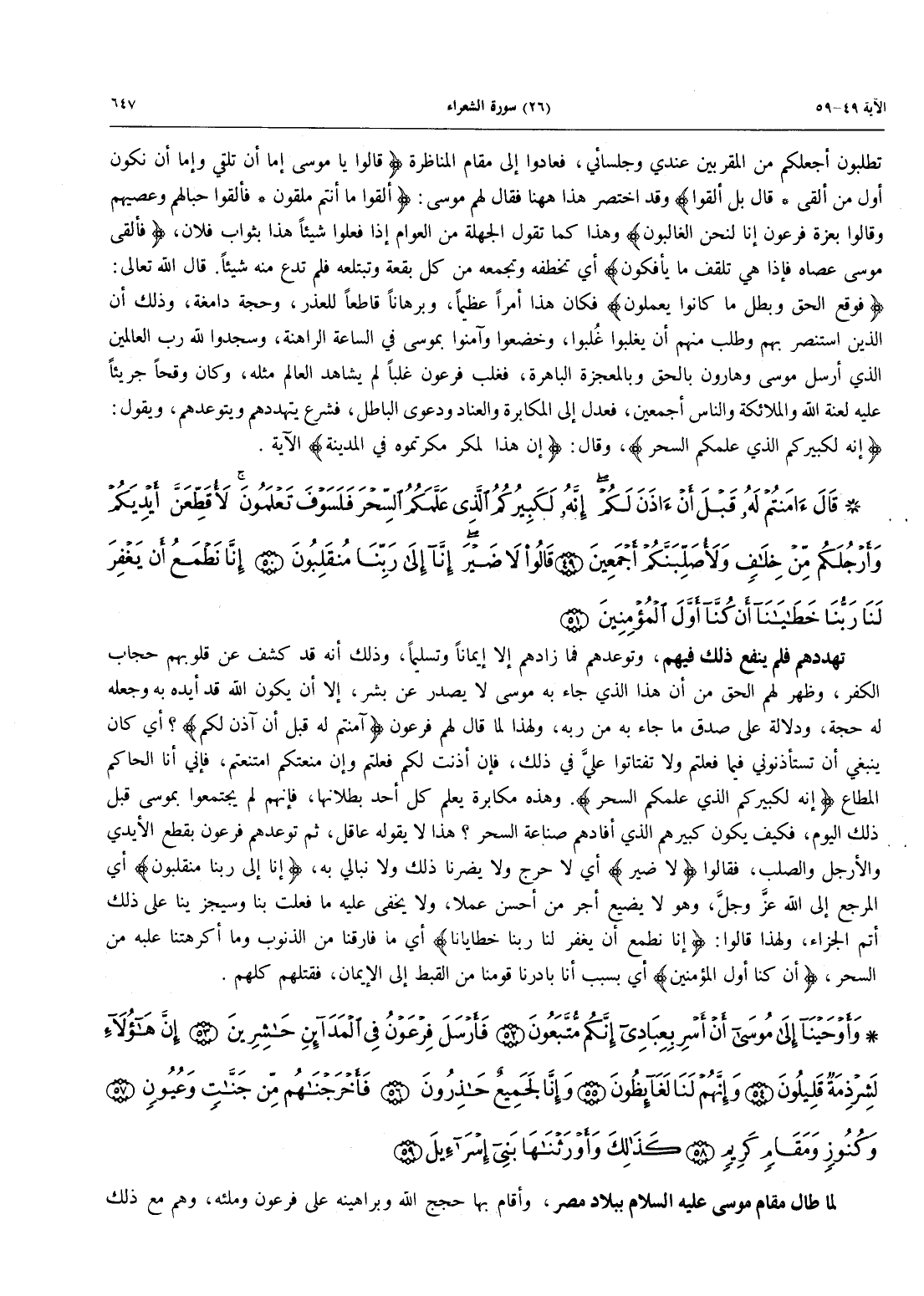 تهددهم فلم ينفع ذَلِكَ فِيهِمْ، وَتَوَعَّدَهُمْ فَمَا زَادَهُمْ إِلاَّ إِيمَاناً وَتَسْلِيمًا، وَذَلِكَ أَنَّهُ قَدْ كُشِفَ عَنْ قُلُوبِهِمْ حجاب الكفر، وظهر لَهُمُ الحق مِنْ أَنَّ هَذَا الَّذِي جَآءَ بِهِ مُوسَى لَا يَصْدُرُ عَنْ بَشَرٍ، إِلَّا أَنْ يَكُونَ اللَّهُ قَدْ أَيَّدَهُ بِهِ وَجَعَلَهُ لَهُ حُجَّةً، وَدَلَالَةً عَلَى صِدْقِ مَا جَاءَ بِهِ مِنْ رَبِّهِ، وَلِهَذَا لَمَّا قَالَ لَهُمْ فِرْعَوْنُ {آمَنتُمْ لَهُ قَبْلَ أَنْ آذَنَ لَكُمْ}؟ أَيْ كَانَ يَنْبَغِي أَنْ تَسْتَأْذِنُونِي فِيمَا فَعَلْتُمْ وَلَا تُفْتَاتُوا عليَّ فِي ذَلِكَ، فَإِنْ أَذِنْتُ لَكُمْ فَعَلْتُمْ وَإِنْ مَنَعْتُكُمُ امْتَنَعْتُمْ، فَإِنِّي أَنَا الْحَاكِمُ الْمُطَاعُ {إِنَّهُ لَكَبِيرُكُمُ الَّذِي عَلَّمَكُمُ السِّحْرَ}. وَهَذِهِ مُكَابَرَةٌ يَعْلَمُ كُلُّ أَحَدٍ بُطْلَانَهَا، فَإِنَّهُمْ لَمْ يَجْتَمِعُوا بِمُوسَى قَبْلَ ذَلِكَ الْيَوْمِ، فَكَيْفَ يَكُونُ كَبِيرَهُمُ الَّذِي أَفَادَهُمْ صِنَاعَةَ السِّحْرِ؟ هَذَا لَا يَقُولُهُ عَاقِلٌ، ثُمَّ تَوَعَّدَهُمْ فِرْعَوْنُ بِقَطْعِ الْأَيْدِي وَالْأَرْجُلِ وَالصَّلْبِ، فَقَالُوا {لاَ ضَيْرَ} أَيْ لَا حَرَجَ وَلَا يَضُرُّنَا ذَلِكَ وَلَا نُبَالِي بِهِ، {إِنَّآ إِلَى رَبِّنَا مُنقَلِبُونَ} أَيِ الْمَرْجِعُ إِلَى اللَّهِ عزَّ وجلَّ، وَهُوَ لاَ يُضِيعُ أَجْرَ مَنْ أَحْسَنَ عَمَلًا، وَلَا يَخْفَى عَلَيْهِ مَا فَعَلْتَ بِنَا وَسَيَجْزِينَا عَلَى ذَلِكَ أَتَمَّ الْجَزَاءَ، وَلِهَذَا قَالُوا: {إِنَّا نَطْمَعُ أَن يَغْفِرَ لَنَا رَبُّنَا خَطَايَانَا} أَيْ ما فارقنا مِنَ الذُّنُوبِ وَمَا أَكْرَهْتَنَا عَلَيْهِ مِنَ السِّحْرِ، {أَن كُنَّآ أَوَّلَ الْمُؤْمِنِينَ} أَيْ بِسَبَبِ أَنَّا بَادَرْنَا قَوْمَنَا مِنَ الْقِبْطِ إِلَى الْإِيمَانِ، فَقَتَلَهُمْ كلهم.