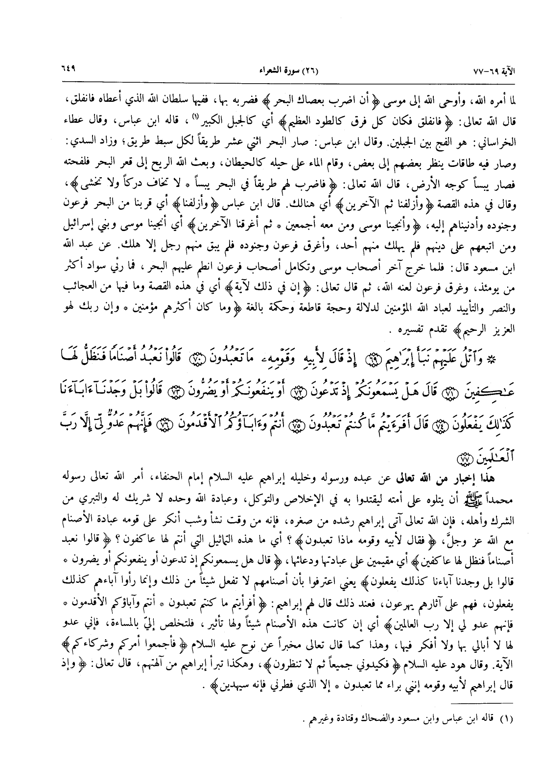 هَذَا إِخْبَارٌ مِنَ اللَّهِ تعالى عن عبده ورسوله وخليله إبراهيم عليه السلام إمام الحنفاء، أمر الله تَعَالَى رَسُولَهُ مُحَمَّدًا صَلَّى اللَّهُ عَلَيْهِ وَسَلَّمَ أَنْ يَتْلُوَهُ عَلَى أُمَّتِهِ لِيَقْتَدُوا بِهِ فِي الْإِخْلَاصِ وَالتَّوَكُّلِ، وَعِبَادَةِ اللَّهِ وَحْدَهُ لَا شَرِيكَ له والتبري مِنَ الشِّرْكِ وَأَهْلِهِ، فَإِنَّ اللَّهَ تَعَالَى آتَى إِبْرَاهِيمَ رُشْدَهُ مِن صغره، فَإِنَّهُ مِنْ وَقْتِ نَشَأَ وَشَبَّ أَنْكَرَ عَلَى قَوْمِهِ عِبَادَةَ الْأَصْنَامِ مَعَ اللَّهِ عزَّ وجلَّ، {فَقَالَ لأَبِيهِ وَقَوْمِهِ مَا تَعْبُدُونَ}؟ أَيْ مَا هَذِهِ التَّمَاثِيلُ الَّتِي أَنتُمْ لَهَا عَاكِفُونَ؟ {قَالُواْ نَعْبُدُ أَصْنَاماً فَنَظَلُّ لَهَا عَاكِفِينَ} أَيْ مُقِيمِينَ عَلَى عِبَادَتِهَا وَدُعَائِهَا، {قَالَ هَلْ يَسْمَعُونَكُمْ إِذْ تَدْعُونَ أَوْ يَنفَعُونَكُمْ أَوْ يَضُرُّونَ * قَالُواْ بَلْ وَجَدْنَآ آبَآءَنَا كَذَلِكَ يَفْعَلُونَ} يَعْنِي اعْتَرَفُوا بِأَنَّ أَصْنَامَهُمْ لَا تَفْعَلُ شَيْئًا مِنْ ذَلِكَ وَإِنَّمَا رَأَوْا آبَاءَهُمْ كَذَلِكَ يَفْعَلُونَ، فَهُمْ عَلَى آثَارِهِمْ يهرعون، فعند ذلك قال لهم إبراهيم: {أَفَرَأَيْتُمْ مَّا كُنْتُمْ تَعْبُدُونَ * أَنتُمْ وَآبَآؤُكُمُ الْأَقْدَمُونَ * فَإِنَّهُمْ عَدُوٌّ لِي إِلاَّ رَبَّ الْعَالَمِينَ} أَيْ إِنْ كَانَتْ هَذِهِ الْأَصْنَامُ شَيْئًا وَلَهَا تَأْثِيرٌ، فَلْتَخْلُصْ إِلَيَّ بِالْمَسَاءَةِ، فَإِنِّي عَدُوٌّ لَهَا لَا أبالي بها وَلَا أُفَكِّرُ فِيهَا، وَهَذَا كَمَا قَالَ تَعَالَى مُخْبِرًا عَنْ نُوحٍ عَلَيْهِ السَّلَامُ {فَأَجْمِعُوا أَمْرَكُمْ وَشُرَكَآءَكُمْ} الآية. وقال هود عليه السلام {فَكِيدُونِي جَمِيعاً ثُمَّ لاَ تنظرون}، وهكذا تبرأ إبراهيم من آلهتهم، قال تَعَالَى: {وَإِذْ قَالَ إِبْرَاهِيمُ لأَبِيهِ وَقَوْمِهِ إِنَّنِي بَرَآءٌ مِّمَّا تَعْبُدُونَ * إِلاَّ الذِي فَطَرَنِي فَإِنَّهُ سَيَهْدِينِ}.