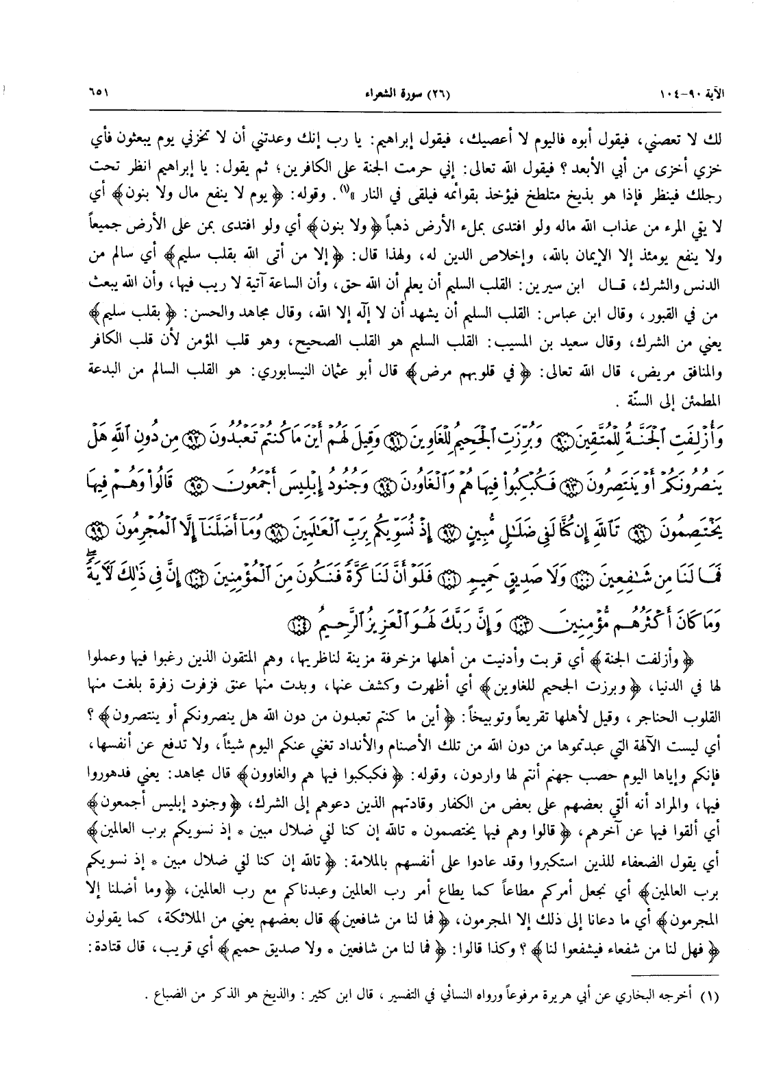 لَكَ لَا تَعْصِنِي، فَيَقُولُ أَبُوهُ فَالْيَوْمَ لَا أَعْصِيكَ، فَيَقُولُ إِبْرَاهِيمُ: يَا رَبِّ إِنَّكَ وَعَدْتَنِي أن لا تُخزني يَوْمَ يُبْعَثُونَ فَأَيُّ خِزْيٍ أَخْزَى مِنْ أَبِي الْأَبْعَدِ؟ فَيَقُولُ اللَّهُ تَعَالَى: إِنِّي حَرَّمْتُ الْجَنَّةَ على الكافرين؛ ثم يقول: يا إبراهيم انظر تحت رجلك فينظر فَإِذَا هُوَ بِذِيخٍ مُتَلَطِّخٍ فَيُؤْخَذُ بِقَوَائِمِهِ فَيُلْقَى في النار" (أخرجه البخاري عن أبي هريرة مرفوعاً ورواه النسائي في التفسير، قال ابن كثير: والذيخ هو الذكر من الضباع). وَقَوْلُهُ: {يَوْمَ لاَ يَنفَعُ مَالٌ وَلاَ بَنُونَ} أَيْ لَا يَقِي الْمَرْءَ مِنْ عَذَابِ اللَّهِ مَالُهُ وَلَوِ افْتَدَى بِمِلْءِ الْأَرْضِ ذَهَبًا {وَلاَ بَنُونَ} أي ولو افتدى بمن على الْأَرْضِ جَمِيعًا وَلَا يَنْفَعُ يومئذٍ إِلَّا الْإِيمَانُ بالله، وإخلاص الدين له، وَلِهَذَا قَالَ: {إِلاَّ مَنْ أَتَى اللَّهَ بِقَلْبٍ سَلِيمٍ} أَيْ سَالِمٍ مِنَ الدَّنَسِ وَالشَّرْكِ، قَالَ ابن سِيرِينَ: الْقَلْبُ السَّلِيمُ أَنْ يَعْلَمَ أَنَّ اللَّهَ حَقٌّ، وَأَنَّ السَّاعَةَ آتِيَةٌ لَا رَيْبَ فِيهَا، وَأَنَّ اللَّهَ يَبْعَثُ مَّن فِي الْقُبُورِ، وَقَالَ ابن عباس: القلب السليم أن يَشْهَدُ أَنْ لَا إِلَهَ إِلَّا اللَّهُ، وَقَالَ مجاهد والحسن: {بِقَلْبٍ سَلِيمٍ} يَعْنِي مِنَ الشِّرْكِ، وَقَالَ سَعِيدُ بْنُ الْمُسَيَّبِ: الْقَلْبُ السَّلِيمُ هُوَ الْقَلْبُ الصَّحِيحُ، وهو قلب المؤمن لأن قلب الكافر والمنافق مريض، قال الله تعالى: {في قلوبهم مرض} قال أبو عثمان النيسابوري: هو القلب السالم مِنَ الْبِدْعَةِ الْمُطْمَئِنُّ إِلَى السُّنَةِ.