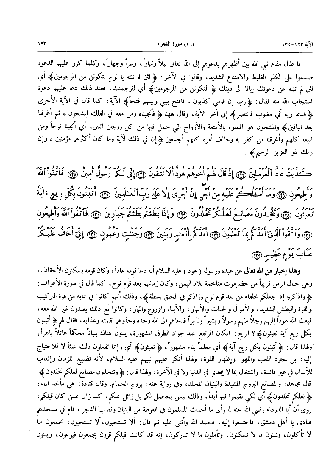 وَهَذَا إِخْبَارٌ مِنَ اللَّهِ تَعَالَى عَنْ عَبْدِهِ وَرَسُولِهِ (هُودٍ) عَلَيْهِ السلام أنه دعا قومه عاداً، وكان قومه يَسْكُنُونَ الْأَحْقَافَ، وَهِيَ جِبَالُ الرَّمَلِ قَرِيبًا مِنْ حضرموت متاخمة بلاد الْيَمَنِ، وَكَانَ زَمَانُهُمْ بَعْدِ قَوْمِ نُوحٍ، كَمَا قَالَ فِي سُورَةِ الْأَعْرَافِ: {وَاذْكُرُوا إِذْ جَعَلَكُمْ خُلَفَآءَ مِن بَعْدِ قَوْمِ نُوحٍ وَزَادَكُمْ فِي الخلق بسطة}، وَذَلِكَ أَنَّهُمْ كَانُوا فِي غَايَةٍ مِنْ قُوَّةِ التركيب والقوة والبطش الشديد، والأموال والجنات والأنهار، وَالْأَبْنَاءِ وَالزُّرُوعِ وَالثِّمَارِ، وَكَانُوا مَعَ ذَلِكَ يَعْبُدُونَ غير الله معه، فبعث الله هوداً إِلَيْهِمْ رَجُلًا مِنْهُمْ رَسُولَا وَبَشِيرًا وَنَذِيرًا فَدَعَاهُمْ إلى الله وحده وحذرهم نقمته وعذابه، فقال لهم {أَتَبْنُونَ بِكُلِّ رِيعٍ آيَةً تَعْبَثُونَ}؟ الريع: المكان المرتفع عند جواد الطرق المشهورة، يبنون هناك بيناناً محكماً هائلاً باهراً، وَلِهَذَا قَالَ: {أَتَبْنُونَ بِكُلِّ رِيعٍ آيَةً} أَيْ معلماً بناء مشهوراً، {تَعْبَثُونَ} أي وَإِنَّمَا تَفْعَلُونَ ذَلِكَ عَبَثًا لَا لِلِاحْتِيَاجِ إِلَيْهِ، بَلْ لِمُجَرَّدِ اللَّعِبِ وَاللَّهْوِ وَإِظْهَارِ الْقُوَّةِ، وَلِهَذَا أنكر عليهم نبيهم عليه السلام، لِأَنَّهُ تَضْيِيعٌ لِلزَّمَانِ وَإِتْعَابٌ لِلْأَبْدَانِ فِي غَيْرِ فَائِدَةٍ، وَاشْتِغَالٌ بِمَا لَا يُجْدِي فِي الدُّنْيَا وَلَا فِي الْآخِرَةِ، وَلِهَذَا قَالَ: {وَتَتَّخِذُونَ مَصَانِعَ لَعَلَّكُمْ تَخْلُدُونَ}. قَالَ مُجَاهِدٌ: والمصانع الْبُرُوجُ الْمُشَيَّدَةُ وَالْبُنْيَانُ الْمُخَلَّدُ، وَفِي رِوَايَةٍ عَنْهُ: بُرُوجُ الْحَمَامِ. وَقَالَ قَتَادَةُ: هِيَ مَأْخَذُ الْمَاءِ، {لَعَلَّكُمْ تَخْلُدُونَ} أَيْ لِكَيْ تُقِيمُوا فِيهَا أَبَدًا، وذلك ليس بِحَاصِلٍ لَكُمْ بَلْ زَائِلٌ عَنْكُمْ، كَمَا زَالَ عمن كان قبلكم، روي أَنَّ أَبَا الدَّرْدَاءِ رَضِيَ اللَّهُ عَنْهُ لَمَّا رَأَى مَا أَحْدَثَ الْمُسْلِمُونَ فِي الْغُوطَةِ مِنَ البنيان ونصب الحجر، قَامَ فِي مَسْجِدِهِمْ فَنَادَى يَا أَهْلَ دِمَشْقَ، فَاجْتَمَعُوا إِلَيْهِ، فَحَمِدَ اللَّهَ وَأَثْنَى عَلَيْهِ ثُمَّ قَالَ: أَلَا تَسْتَحْيُونَ، أَلَا تَسْتَحْيُونَ، تَجْمَعُونَ مَا لَا تَأْكُلُونَ، وَتَبْنُونَ مَا لَا تَسْكُنُونَ، وَتَأْمُلُونَ ما لا تدركون، إنه قد كانت قبلكم قرون يجمعون فيوعون، ويبنون