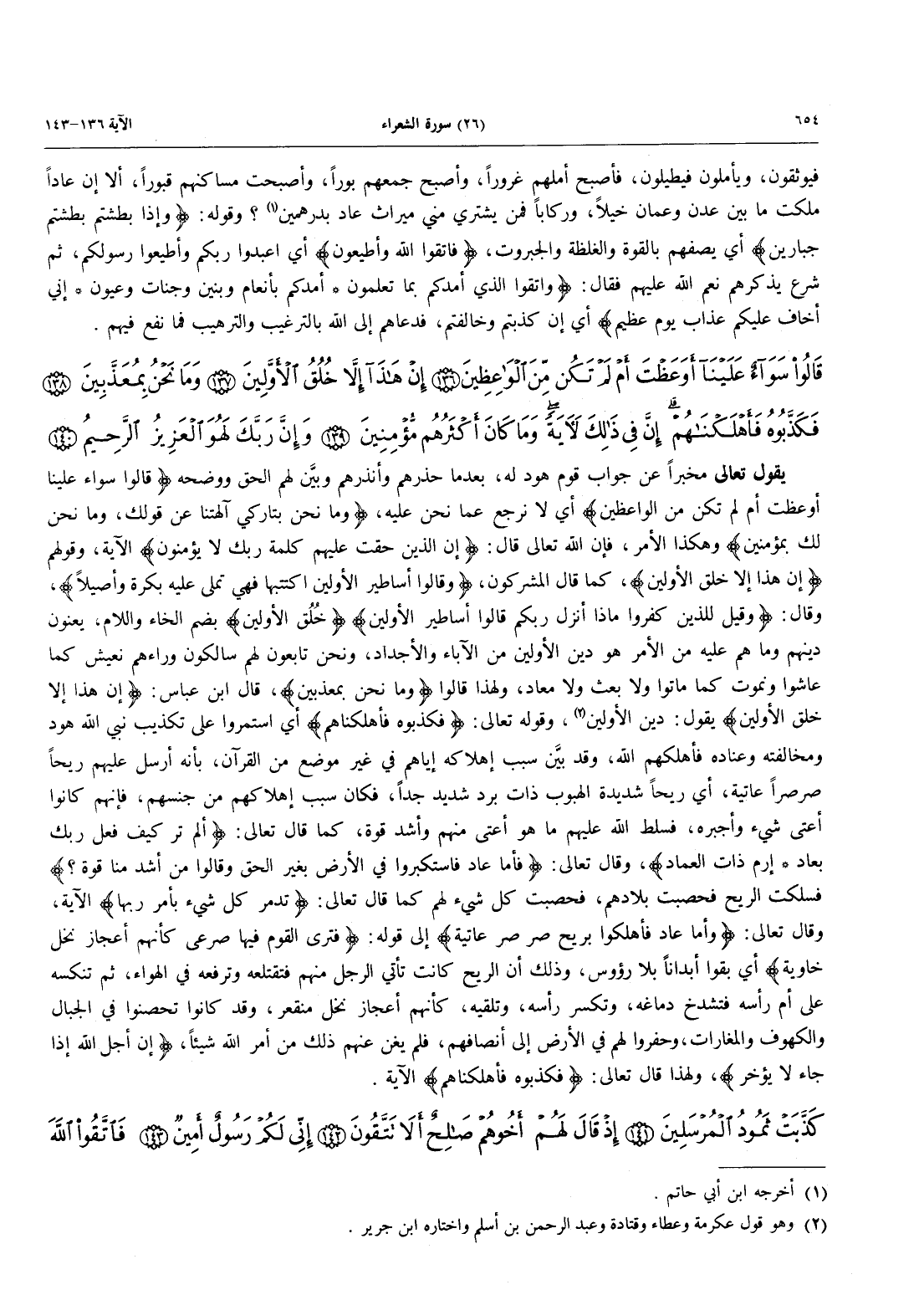 بِتَارِكِي آلِهَتِنَا عَن قَوْلِكَ، وَمَا نَحْنُ لَكَ بمؤمنين} وَهَكَذَا الْأَمْرُ، فَإِنَّ اللَّهَ تَعَالَى قَالَ: {إِنَّ الَّذِينَ حَقَّتْ عَلَيْهِمْ كَلِمَةُ رَبِّكَ لاَ يُؤْمِنُونَ} الآية، وقولهم {إِنْ هذا إِلاَّ خُلُقُ الأولين}، كما قال المشركون، {وَقَالُوا أَسَاطِيرُ الْأَوَّلِينَ اكْتَتَبَهَا فَهِيَ تُمْلَى عَلَيْهِ بُكْرَةً وَأَصِيلاً}، وقال: {وقيل للذين كفروا مَّاذَآ أَنْزَلَ رَبُّكُمْ قَالُواْ أَسَاطِيرُ الأولين} {خُلُق الْأَوَّلِينَ} بِضَمِّ الْخَاءِ وَاللَّامِ، يَعْنُونَ دِينَهُمْ وما هم عليه من الأمر دين الأولين مِنَ الْآبَاءِ وَالْأَجْدَادِ، وَنَحْنُ تَابِعُونَ لَهُمْ سَالِكُونَ وَرَاءَهُمْ نَعِيشُ كَمَا عَاشُوا وَنَمُوتُ كَمَا مَاتُوا وَلَا بَعْثَ وَلَا مَعَادَ، وَلِهَذَا قَالُوا: {وَمَا نَحْنُ بِمُعَذَّبِينَ}، قال ابْنِ عَبَّاسٍ: {إِنْ هَذَا إِلاَّ خُلُقُ الْأَوَّلِينَ} يقول: دين الأولين (وهو قول عكرمة وقتادة وعبد الرحمن بن أسلم واختاره ابن جرير)، وقوله تعالى: {فَكَذَّبُوهُ فَأَهْلَكْنَاهُمْ} أي استمروا عَلَى تَكْذِيبِ نَبِيِّ اللَّهِ هُودٍ وَمُخَالَفَتِهِ وَعِنَادِهِ فَأَهْلَكَهُمُ اللَّهُ، وَقَدْ بيَّن سَبَبَ إِهْلَاكِهِ إِيَّاهُمْ فِي غَيْرِ مَوْضِعٍ مِنَ الْقُرْآنِ، بِأَنَّهُ أَرْسَلَ عَلَيْهِمْ رِيحاً صَرْصَرًا عَاتِيَةً، أَيْ رِيحًا شَدِيدَةَ الهبوب ذات برد شديد جداً، فكان سبب إِهْلَاكُهُمْ مِنْ جِنْسِهِمْ، فَإِنَّهُمْ كَانُوا أَعْتَى شَيْءٍ وَأَجْبَرَهُ، فَسَلَّطَ اللَّهُ عَلَيْهِمْ مَا هُوَ أَعْتَى منهم وأشد قوة، كَمَا قَالَ تَعَالَى: {أَلَمْ تَرَ كَيْفَ فَعَلَ رَبُّكَ بِعَادٍ * إِرَمَ ذَاتِ العماد}، وَقَالَ تَعَالَى: {فَأَمَّا عَادٌ فَاسْتَكْبَرُوا فِي الْأَرْضِ بِغَيْرِ الْحَقِّ وَقَالُواْ مَنْ أَشَدُّ مِنَّا قُوَّةً؟} فسلكت الريح فحصبت بِلَادَهُمْ، فَحَصَبَتْ كُلَّ شَيْءٍ لَهُمْ كَمَا قَالَ تعالى: {تُدَمِّرُ كل شيء بأمر ربها} الآية، وَقَالَ تَعَالَى: {وَأَمَا عَادٌ فَأُهْلِكُواْ بِرِيحٍ صَرْصَرٍ عَاتِيَةٍ} إلى قوله: {فَتَرَى الْقَوْمَ فِيهَا صَرْعَى كَأَنَّهُمْ أَعْجَازُ نَخْلٍ خاوية} أَيْ بَقُوا أَبْدَانًا بِلَا رُؤُوسٍ، وَذَلِكَ أَنَّ الرِّيحَ كَانَتْ تَأْتِي الرَّجُلَ مِنْهُمْ فَتَقْتَلِعُهُ وَتَرْفَعُهُ فِي الْهَوَاءِ، ثُمَّ تُنَكِّسُهُ عَلَى أُمِّ رَأْسِهِ فَتَشْدَخُ دِمَاغَهُ، وَتَكْسِرُ رَأْسَهُ، وَتُلْقِيهِ، كَأَنَّهُمْ أَعْجَازُ نَخْلٍ مُنْقَعِرٍ، وَقَدْ كَانُوا تَحَصَّنُوا فِي الْجِبَالِ وَالْكُهُوفِ وَالْمَغَارَاتِ، وَحَفَرُوا لَهُمْ فِي الْأَرْضِ إِلَى أَنْصَافِهِمْ، فَلَمْ يُغْنِ عَنْهُمْ ذَلِكَ مِنْ أَمْرِ اللَّهِ شَيْئًا، {إِنَّ أَجَلَ اللَّهِ إِذَا جَاءَ لَا يُؤَخَّرُ}، ولهذا قال تعالى: {فَكَذَّبُوهُ فَأَهْلَكْنَاهُمْ} الآية.
