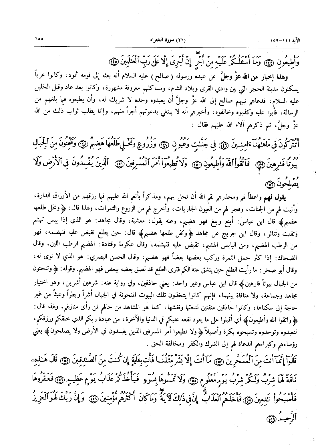 يقول لهم واعظاً لهم ومحذرهم نِقَمَ اللَّهِ أَنْ تَحِلَّ بِهِمْ، وَمُذَكِّرًا بِأَنْعُمِ اللَّهِ عَلَيْهِمْ فِيمَا رَزَقَهُمْ مِنَ الْأَرْزَاقِ الدَّارَّةِ، وأنبت لهم من الجنات، وفجر لَهُمْ مِنَ الْعُيُونِ الْجَارِيَاتِ، وَأَخْرَجَ لَهُمْ مِنَ الزُّرُوعِ وَالثَّمَرَاتِ، وَلِهَذَا قَالَ: {وَنَخْلٍ طَلْعُهَا هَضِيمٌ} قال ابن عباس: أينع وبلغ فهو هضيم، وعنه يقول: معشبة، وقال مجاهد: هو الذي إذا يبس تهشم وتفتت وتناثر، وقال ابن جريج عن مجاهد {وَنَخْلٍ طَلْعُهَا هَضِيمٌ} قَالَ: حِينَ يَطْلُعُ تَقْبِضُ عَلَيْهِ فَتَهْضِمُهُ، فَهُوَ مِنَ الرُّطَبِ الْهَضِيمِ، وَمِنَ الْيَابِسِ الْهَشِيمِ، تَقْبِضُ عَلَيْهِ فَتُهَشِّمُهُ، وَقَالَ عِكْرِمَةُ وقَتَادَةُ: الْهَضِيمُ الرَّطْبُ اللَّيِّنُ، وَقَالَ الضَّحَاكُ: إِذَا كثر حمل الثمرة وركب بعضها بعضاً فهو هضيم، وَقَالَ الْحَسَنُ الْبَصْرِيُّ: هُوَ الَّذِي لَا نَوَى لَهُ، وَقَالَ أَبُو صَخْرٍ: مَا رَأَيْتُ الطَّلْعَ حين ينشق عَنْهُ الْكُمُّ فَتَرَى الطَّلْعَ قَدْ لَصِقَ بَعْضُهُ بِبَعْضٍ فَهُوَ الْهَضِيمُ. وَقَوْلُهُ: {وَتَنْحِتُونَ مِنَ الْجِبَالِ بُيُوتاً فَارِهِين} قَالَ ابْنُ عَبَّاسٍ وَغَيْرُ وَاحِدٍ: يَعْنِي حَاذِقِينَ، وَفِي رِوَايَةٍ عَنْهُ: شَرِهِينَ أَشِرِينَ، وَهُوَ اخْتِيَارُ مُجَاهِدٍ وَجَمَاعَةٍ، وَلَا مُنَافَاةَ بَيْنَهُمَا، فَإِنَّهُمْ كَانُوا يَتَّخِذُونَ تِلْكَ الْبُيُوتَ الْمَنْحُوتَةَ فِي الْجِبَالِ أَشَرًا وَبَطَرًا وَعَبَثًا مِنْ غَيْرِ حَاجَةٍ إلى سكناها، وكانوا حاذقين متقين لِنَحْتِهَا وَنَقْشِهَا، كَمَا هُوَ الْمُشَاهَدُ مِنْ حَالِهِمْ لِمَنْ رَأَى مَنَازِلَهُمْ، وَلِهَذَا قَالَ: {فَاتَّقُوا اللَّهَ وَأَطِيعُونِ} أي أقبلوا على مَا يَعُودُ نَفْعُهُ عَلَيْكُمْ فِي الدُّنْيَا وَالْآخِرَةِ، من عبادة ربكم الذي خلقكم ورزقكم، لتعبدوه وتوحده وَتُسَبِّحُوهُ بُكْرَةً وَأَصِيلًا {وَلاَ تُطِيعُوا أَمْرَ الْمُسْرِفِينَ الَّذِينَ يُفْسِدُونَ فِي الْأَرْضِ وَلَا يُصْلِحُونَ} يَعْنِي رُؤَسَاءَهُمْ وَكُبَرَاءَهُمْ الدُّعَاةَ لَهُمْ إِلَى الشِّرْكِ وَالْكُفْرِ ومخالفة الحق.