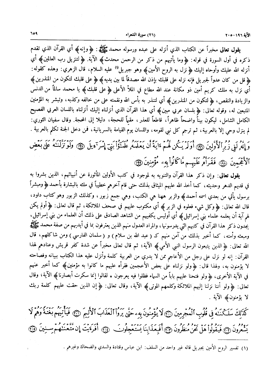 يَقُولُ تَعَالَى مُخْبِرًا عَنِ الْكِتَابِ الَّذِي أَنْزَلَهُ عَلَى عَبْدِهِ وَرَسُولِهِ مُحَمَّدٍ صَلَّى اللَّهُ عَلَيْهِ وَسَلَّمَ: {وَإِنَّهُ} أَيِ الْقُرْآنُ الَّذِي تَقَدَّمَ ذِكْرُهُ فِي أَوَّلِ السُّورَةِ فِي قَوْلِهِ: {وَمَآ يَأْتِيهِمْ مِنْ ذِكْرٍ مِّنَ الرَّحْمَنِ مُحْدَثٍ} الْآيَةَ. {لَتَنزِيلُ رَبِّ الْعَالَمِينَ} أَيْ أَنْزَلَهُ اللَّهُ عَلَيْكَ وَأَوْحَاهُ إِلَيْكَ {نَزَلَ بِهِ الروح الأمين} وهو جبريل (تفسسير الروح الأمين بجبريل قَالَهُ غَيْرُ وَاحِدٍ مِنَ السَّلَفِ: ابْنُ عَبَّاسٍ وقتادة والسدي والضحاك وغيرهم) عليه السلام، قَالَ الزُّهْرِيُّ: وَهَذِهِ كَقَوْلِهِ: {قُلْ مَن كَانَ عَدُوّاً لِّجِبْرِيلَ فَإِنَّهُ نَزَّلَهُ عَلَى قَلْبِكَ بِإِذْنِ اللَّهِ مُصَدِّقاً لِّمَا بَيْنَ يَدَيْهِ} {عَلَى قَلْبِكَ لِتَكُونَ مِنَ الْمُنْذِرِينَ} أَيْ نَزَلَ بِهِ مَلَكٌ كَرِيمٌ أَمِينٌ ذُو مَكَانَةٍ عِنْدَ اللَّهِ مُطَاعٌ فِي الْمَلَأِ الْأَعْلَى {عَلَى قَلْبِكَ} يَا مُحَمَّدُ سَالِمًا مِنَ الدَّنَسِ وَالزِّيَادَةِ وَالنَّقْصِ، {لِتَكُونَ مِنَ الْمُنْذِرِينَ} أَيْ لِتُنْذِرَ بِهِ بَأْسَ اللَّهِ وَنِقْمَتِهِ عَلَى مَنْ خَالَفَهُ وَكَذَّبَهُ، وَتُبَشِّرَ به المؤمنين المتبعين له، وقوله تعالى: {بِلِسَانٍ عَرَبِيٍّ مُبِينٍ} أَيْ هَذَا الْقُرْآنُ الَّذِي أنزلناه إليك باللسان الْعَرَبِيِّ الْفَصِيحِ الْكَامِلِ الشَّامِلِ، لِيَكُونَ بَيِّنًا وَاضِحًا ظَاهِرًا، قَاطِعًا لِلْعُذْرِ، مُقِيمًا لِلْحُجَّةِ، دَلِيلًا إِلَى المحجة، وَقَالَ سُفْيَانُ الثَّوْرِيُّ: لَمْ يَنْزِلْ وَحْيٌ إِلَّا بِالْعَرَبِيَّةِ، ثُمَّ تَرْجَمَ كُلُّ نَبِيٍّ لِقَوْمِهِ، وَاللِّسَانُ يَوْمَ الْقِيَامَةِ بِالسُّرْيَانِيَّةِ، فَمَنْ دَخَلَ الْجَنَّةَ تَكَلَّمَ العربية.