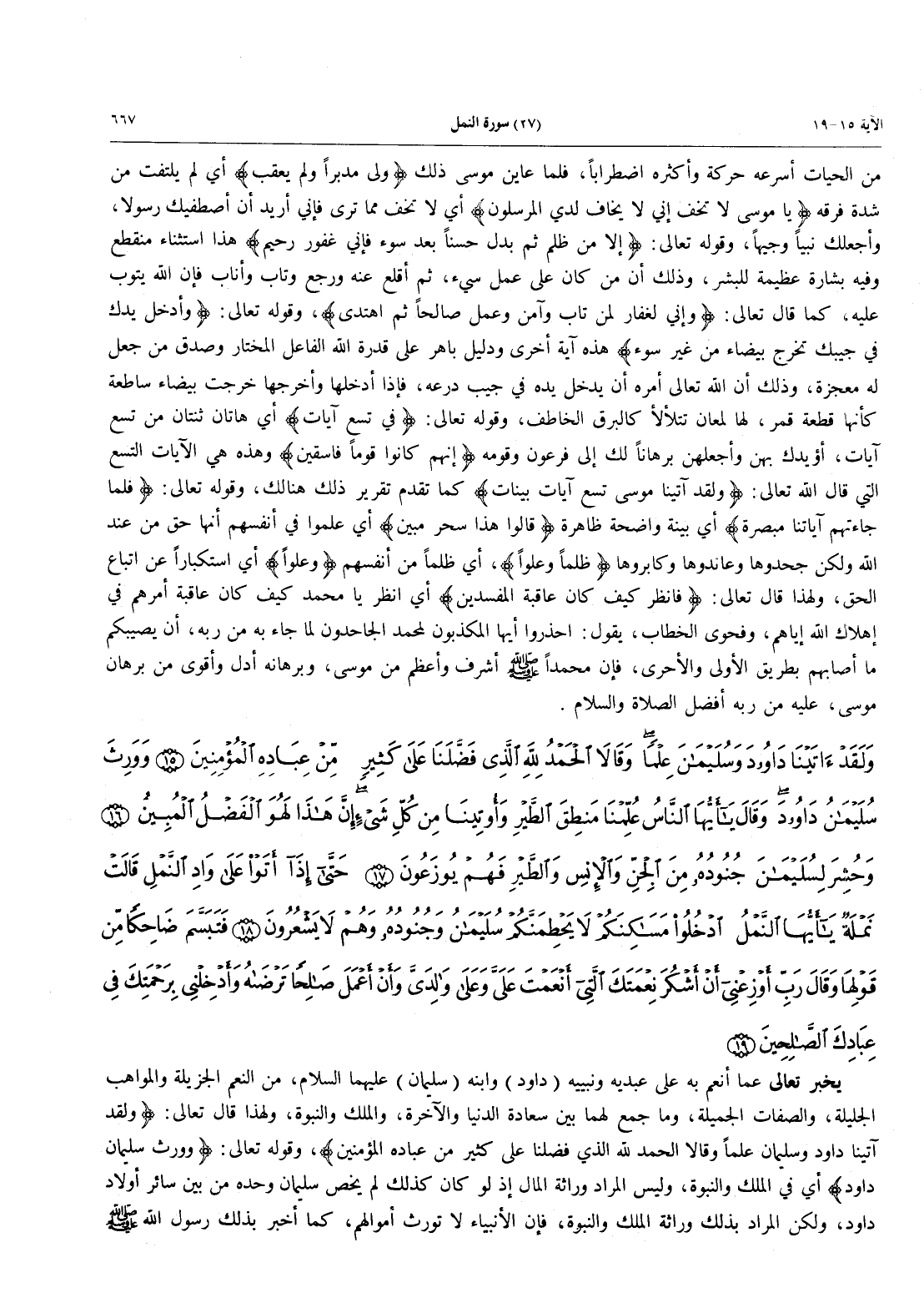 يُخْبِرُ تَعَالَى عَمَّا أَنْعَمَ بِهِ عَلَى عَبْدَيْهِ وَنَبِيَّيْهِ (دَاوُدَ) وَابْنِهِ (سليمان) عليهما السَّلَامُ، مِن النِّعَمِ الْجَزِيلَةِ وَالْمَوَاهِبِ الْجَلِيلَةِ، وَالصِّفَاتِ الْجَمِيلَةِ، وَمَا جَمَعَ لَهُمَا بَيْنَ سَعَادَةِ الدُّنْيَا والآخرة، والملك والنبوة، ولهذا قال تَعَالَى: {وَلَقَدْ آتَيْنَا دَاوُدَ وَسُلَيْمَانَ عِلْماً وَقَالاَ الْحَمْدُ لِلَّهِ الَّذِي فَضَّلَنَا عَلَى كَثِيرٍ مِنْ عباده المؤمنين}، وقوله تعالى: {وَوَرِثَ سُلَيْمَانُ دَاوُدَ} أَيْ فِي الْمُلْكِ وَالنُّبُوَّةِ، وَلَيْسَ الْمُرَادُ وِرَاثَةَ الْمَالِ إِذْ لَوْ كَانَ كذلك لم يخص سليمان وحده بين سائر أولاد داود، وَلَكِنَّ الْمُرَادَ بِذَلِكَ وِرَاثَةُ الْمُلْكِ وَالنُّبُوَّةِ، فَإِنَّ الْأَنْبِيَاءَ لَا تُوَرَّثُ أَمْوَالُهُمْ، كَمَا أَخْبَرَ بِذَلِكَ رَسُولُ اللَّهِ صَلَّى اللَّهُ عَلَيْهِ وَسَلَّمَ