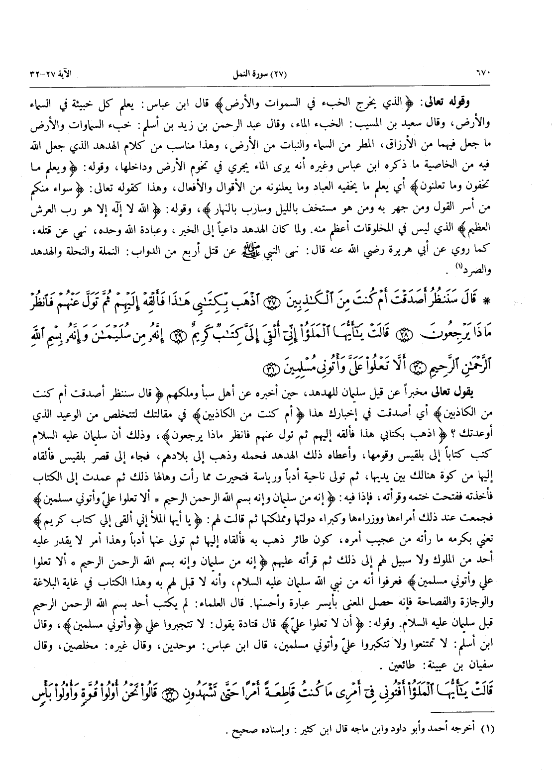 يقول تعالى مخبراً عن قيل سليمان للهدهد، حين أخبره عن أهل سبأ وملكهم {قَالَ سَنَنظُرُ أَصَدَقْتَ أَمْ كُنتَ مِنَ الْكَاذِبِينَ} أَيْ أَصْدَقْتَ فِي إِخْبَارِكَ هَذَا {أَمْ كُنتَ مِنَ الكاذبين} في مقالتك لتتخلص مِنَ الْوَعِيدِ الَّذِي أَوْعَدْتُكَ؟ {اذْهَبْ بِّكِتَابِي هَذَا فَأَلْقِهْ إِلَيْهِمْ ثُمَّ تَوَلَّ عَنْهُمْ فَانْظُرْ مَاذَا يَرْجِعُونَ}، وَذَلِكَ أَنَّ سُلَيْمَانَ عَلَيْهِ السَّلَامُ كَتَبَ كتاباً إلى بلقيس وقومها، وأعطاه ذلك الهدهد فحمله وَذَهَبَ إِلَى بِلَادِهِمْ، فَجَاءَ إِلَى قَصْرِ بِلْقِيسَ فَأَلْقَاهُ إِلَيْهَا مِنْ كُوَّةٍ هُنَالِكَ بَيْنَ يَدَيْهَا، ثُمَّ تَوَلَّى نَاحِيَةً أَدَبًا وَرِيَاسَةً فَتَحَيَّرَتْ مِمَّا رَأَتْ وَهَالَهَا ذَلِكَ ثُمَّ عَمَدَتْ إِلَى الْكِتَابِ فأخذته ففتحت ختمه وقرأنه، فَإِذَا فِيهِ: {إِنَّهُ مِن سُلَيْمَانَ وَإِنَّهُ بِسْمِ اللَّهِ الرَّحْمَنِ الرَّحِيمِ * أَلاَّ تَعْلُواْ عَلَيَّ وَأْتُونِي مُسْلِمِينَ} فَجَمَعَتْ عِنْدَ ذَلِكَ أُمَرَاءَهَا وَوُزَرَاءَهَا وَكُبَرَاءَ دولتها ثُمَّ قَالَتْ لَهُمْ: {يَا أَيُّهَا الْمَلَأُ إِنِّي أُلْقِيَ إِلَيَّ كِتَابٌ كَرِيمٌ} تَعْنِي بِكَرَمِهِ مَا رأته من عجيب أمره، كون طائر ذهب بِهِ فَأَلْقَاهُ إِلَيْهَا ثُمَّ تَوَلَّى عَنْهَا أَدَبًا وَهَذَا أَمْرٌ لَا يَقْدِرَ عَلَيْهِ أَحَدٌ مِنَ الْمُلُوكِ وَلَا سَبِيلَ لَهُمْ إِلَى ذَلِكَ ثُمَّ قَرَأَتْهُ عَلَيْهِمْ {إِنَّهُ مِن سُلَيْمَانَ وَإِنَّهُ بِسْمِ اللَّهِ الرَّحْمَنِ الرَّحِيمِ * أَلاَّ تَعْلُواْ عَلَيَّ وَأْتُونِي مُسْلِمِينَ} فَعَرَفُوا أَنَّهُ مِنْ نَبِيِّ اللَّهِ سُلَيْمَانَ عليه السلام، وَأَنَّهُ لَا قِبَلَ لَهُمْ بِهِ وَهَذَا الْكِتَابُ فِي غَايَةِ الْبَلَاغَةِ وَالْوَجَازَةِ وَالْفَصَاحَةِ فَإِنَّهُ حَصَّلَ المعنى بأيسر عبارة وأحسنها. قال العلماء: لم يَكْتُبْ أَحَدٌ بِسْمِ اللَّهِ الرَّحْمَنِ الرَّحِيمِ قَبْلَ سليمان عليه السلام. وقوله: {أَلاَّ تَعْلُواْ عَلَيَّ} قال قتادة يقول: لا تتجبروا علي {وأتوني مسلمين}، وقال ابن أَسْلَمَ: لَا تَمْتَنِعُوا وَلَا تَتَكَبَّرُوا عَلَيَّ وَأْتُونِي مُسْلِمِينَ، قَالَ ابْنُ عَبَّاسٍ: مُوَحِّدِينَ، وَقَالَ غَيْرُهُ: مُخْلِصِينَ، وَقَالَ سُفْيَانُ بْنُ عُيَيْنَةَ: طَائِعِينَ.