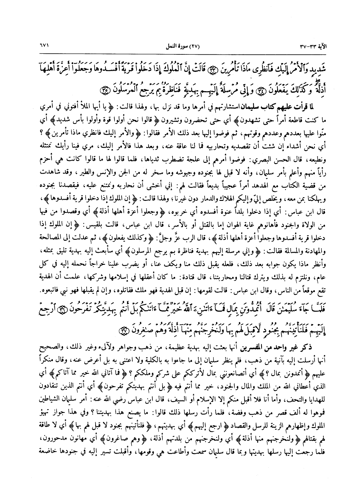 ذَكَرَ غَيْرُ وَاحِدٍ مِنَ المفسرين أَنَّهَا بَعَثَتْ إِلَيْهِ بِهَدِيَّةٍ عَظِيمَةٍ، مِنْ ذَهَبٍ وجواهر ولآلئ وغير ذلك، وَالصَّحِيحُ أَنَّهَا أَرْسَلَتْ إِلَيْهِ بِآنِيَةٍ مِنْ ذَهَبٍ، فلم ينظر سليمان إِلَى مَا جَاءُوا بِهِ بِالْكُلِّيَّةِ وَلَا اعْتَنَى بِهِ بَلْ أَعْرَضَ عَنْهُ، وَقَالَ مُنْكِرًا عَلَيْهِمْ {أَتُمِدُّونَنِ بِمَالٍ؟} أَيْ أَتُصَانِعُونَنِي بِمَالٍ لِأَتْرُكَكُمْ عَلَى شركم وَمُلْكِكُمْ؟ {فَمَآ آتَانِيَ اللَّهُ خَيْرٌ مِمَّا آتَاكُمْ} أَيِ الَّذِي أَعْطَانِي اللَّهُ مِنَ الْمُلْكِ وَالْمَالِ وَالْجُنُودِ، خَيْرٌ مِمَّا أَنْتُمْ فِيهِ {بَلْ أَنتُمْ بِهَدِيَّتِكُمْ تَفْرَحُونَ} أي أنتم الذي تَنْقَادُونَ لِلْهَدَايَا وَالتُّحَفِ، وَأَمَّا أَنَا فَلَا أَقْبَلُ منكم إلاّ الإسلام أو السيف، قال ابْنِ عَبَّاسٍ رَضِيَ اللَّهُ عَنْهُ: أَمَرَ سُلَيْمَانُ الشَّيَاطِينَ فَمَوَّهُوا لَهُ أَلْفَ قَصْرٍ مِنْ ذَهَبٍ وَفِضَّةٍ، فَلَمَّا رَأَتْ رُسُلُهَا ذَلِكَ قَالُوا: مَا يصنع هذا بهديتنا؟ وفي هذا جَوَازِ تَهَيُّؤِ الْمُلُوكِ وَإِظْهَارِهِمُ الزِّينَةَ لِلرُّسُلِ وَالْقُصَّادِ {ارْجِعْ إِلَيْهِمْ} أَيْ بِهَدِيَّتِهِمْ، {فَلَنَأْتِيَنَّهُم بِجُنُودٍ لاَّ قِبَلَ لَهُمْ بِهَا} أَيْ لَا طَاقَةَ لَهُمْ بقتالهم {وَلَنُخْرِجَنَّهُم مِّنْهَآ أذلة} أي ولنخرجهم من بلدتهم أَذِلَّةً، {وَهُمْ صَاغِرُونَ} أَيْ مُهَانُونَ مَدْحُورُونَ، فَلَمَّا رَجَعَتْ إِلَيْهَا رُسُلُهَا بِهَدِيَّتِهَا وَبِمَا قَالَ سُلَيْمَانُ سَمِعَتْ وَأَطَاعَتْ هِيَ وَقَوْمُهَا، وَأَقْبَلَتْ تَسِيرُ إِلَيْهِ فِي جُنُودِهَا خَاضِعَةً