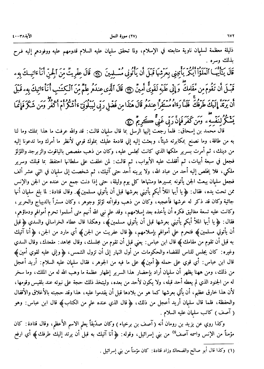 - 38 - قَالَ يَا أَيُّهَا الْمَلَأُ أَيُّكُمْ يَأْتِينِي بِعَرْشِهَا قَبْلَ أَن يَأْتُونِي مُسْلِمِينَ