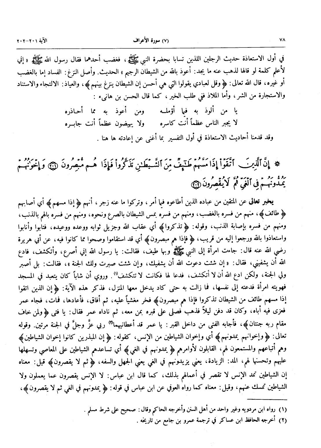 يُخْبِرُ تَعَالَى عَنِ الْمُتَّقِينَ مِنْ عِبَادِهِ الَّذِينَ أَطَاعُوهُ فِيمَا أَمَرَ، وَتَرَكُوا مَا عَنْهُ زَجَرَ، أَنَّهُمْ {إِذَا مَسَّهُمْ} أي أصابهم {طَائِفٌ}، منهم من فسره بِالْغَضَبِ، وَمِنْهُمْ مَنْ فَسَّرَهُ بِمَسِّ الشَّيْطَانِ بِالصَّرَعِ وَنَحْوِهِ، وَمِنْهُمْ مَنْ فَسَّرَهُ بِالْهَمِّ بِالذَّنْبِ، وَمِنْهُمْ مَنْ فَسَّرَهُ بِإِصَابَةِ الذَّنْبِ، وَقَوْلُهُ: {تَذَكَّرُواْ} أَيْ عِقَابَ اللَّهِ وَجَزِيلَ ثَوَابِهِ وَوَعْدَهُ وَوَعِيدَهُ، فَتَابُوا وَأَنَابُوا وَاسْتَعَاذُوا بِاللَّهِ وَرَجَعُوا إِلَيْهِ مِنْ قَرِيبٍ، {فَإِذَا هُم مُّبْصِرُونَ} أَيْ قَدِ اسْتَقَامُوا وَصَحَوْا مما كانوا فيه، عَنْ أَبِي هُرَيْرَةَ رَضِيَ اللَّهُ عَنْهُ قَالَ: جَاءَتِ امْرَأَةٌ إِلَى النَّبِيِّ صَلَّى اللَّهُ عَلَيْهِ وَسَلَّمَ وَبِهَا طَيْفٌ، فَقَالَتْ: يَا رَسُولَ اللَّهِ إِنِّي أُصْرَعُ، وَأَتَكَشَّفُ، فَادْعُ اللَّهَ أَنْ يَشْفِيَنِي، فقال: «إن شئت دعوت لك أَنْ يَشْفِيَكَ، وَإِنْ شِئْتِ صَبَرْتِ وَلَكِ الْجَنَّةُ»،