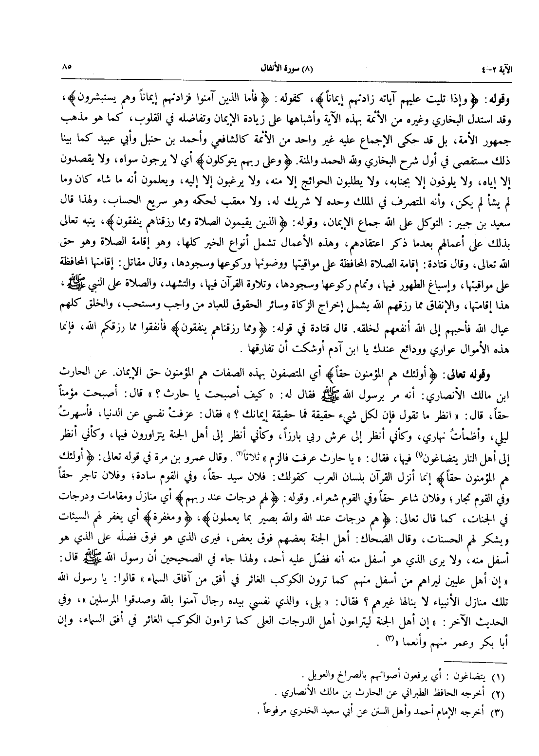 وَقَوْلُهُ تعالى: {أُولَئِكَ هُمُ الْمُؤْمِنُونَ حَقّاً} أَي الْمُتَّصِفُونَ بِهَذِهِ الصفات هم المؤمنون حق الإيمان. عَنِ الْحَارِثِ بْنِ مَالِكٍ الْأَنْصَارِيِّ: أَنَّهُ مَرَّ بِرَسُولِ اللَّهِ صَلَّى اللَّهُ عَلَيْهِ وَسَلَّمَ فَقَالَ لَهُ: «كَيْفَ أَصْبَحْتَ يَا حَارِثُ؟» قَالَ: أَصْبَحْتُ مؤمناً حقاً، قال: «انظر ما تَقُولُ فَإِنَّ لِكُلِّ شَيْءٍ حَقِيقَةً فَمَا حَقِيقَةُ إِيمَانِكَ؟» فَقَالَ: عزفتْ نَفْسِي عَنِ الدُّنْيَا، فأسهرتُ لَيْلِي، وأظمأتُ نَهَارِي، وَكَأَنِّي أَنْظُرُ إِلَى عَرْشِ رَبِّي بَارِزًا، وَكَأَنِّي أَنْظُرُ إِلَى أَهْلِ الْجَنَّةِ يَتَزَاوَرُونَ فِيهَا، وَكَأَنِّي أَنْظُرُ إِلَى أَهْلِ النَّارِ يتضاغون (يتضاغون: أي يرفعون أصواتهم بالصراخ والعويل) فِيهَا، فَقَالَ: «يَا حَارِثُ عَرَفْتَ فَالْزَمْ» ثَلَاثًا (أخرجه الحافظ الطبراني عن الحارث بن مالك الأنصاري). وقال عمرو بن مرة في قوله تعالى: {أُولَئِكَ هُمُ الْمُؤْمِنُونَ حَقًّا} إِنَّمَا أُنْزِلَ الْقُرْآنُ بِلِسَانِ الْعَرَبِ كَقَوْلِكَ: فُلَانٌ سَيِّدٌ حَقًّا، وَفِي الْقَوْمِ سَادَةٌ؛ وَفُلَانٌ تَاجِرٌ حَقًّا، وَفِي الْقَوْمِ تُجَّارٌ؛ وَفُلَانٌ شَاعِرٌ حَقًّا، وَفِي الْقَوْمِ شُعَرَاءُ. وَقَوْلُهُ: {لَهُمْ دَرَجَاتٌ عِندَ رَبِّهِمْ} أَيْ مَنَازِلُ وَمَقَامَاتٌ وَدَرَجَاتٌ فِي الْجَنَّاتِ، كَمَا قَالَ تَعَالَى: {لهم دَرَجَاتٌ عِندَ اللَّهِ وَاللَّهُ بَصِيرٌ بِمَا يَعْمَلُونَ}، {وَمَغْفِرَةٌ} أَيْ يَغْفِرُ لَهُمُ السَّيِّئَاتِ وَيَشْكُرُ لَهُمُ الحسنات، وقال الضحاك: أَهْلُ الْجَنَّةِ بَعْضَهُمْ فَوْقَ بَعْضٍ، فَيَرَى الَّذِي هُوَ فَوْقُ فضلَه عَلَى الَّذِي هُوَ أَسْفَلُ منه، ولا يرى الذي هو أسفل منه أَنَّهُ فُضِّلَ عَلَيْهِ أَحَدٌ، وَلِهَذَا جَاءَ فِي الصَّحِيحَيْنِ أَنَّ رَسُولَ اللَّهِ صَلَّى اللَّهُ عَلَيْهِ وَسَلَّمَ قَالَ: «إِنَّ أَهْلَ عِلِّيِّينَ لَيَرَاهُمْ مَنْ أسفل منهم كما ترون الكوكب الغائر فِي أُفُقٍ مِنْ آفَاقِ السَّمَاءِ» قَالُوا: يَا رَسُولَ اللَّهِ تِلْكَ مَنَازِلُ الْأَنْبِيَاءِ لَا يَنَالُهَا غَيْرُهُمْ؟ فَقَالَ: «بَلَى، وَالَّذِي نَفْسِي بِيَدِهِ رِجَالٌ آمَنُوا بِاللَّهِ وصدَّقوا الْمُرْسَلِينَ»، وَفِي الْحَدِيثِ الْآخَرِ: «إِنَّ أَهْلَ الْجَنَّةِ لَيَتَرَاءَوْنَ أَهْلَ الدَّرَجَاتِ الْعُلَى كما تراءون الكوكب الغائر فِي أُفُقِ السَّمَاءِ، وَإِنَّ أَبَا بَكْرٍ وَعُمَرَ منهم وأنعما» (أخرجه الإمام أحمد وأهل السنن عن أبي سعيد الخدري مرفوعاً).