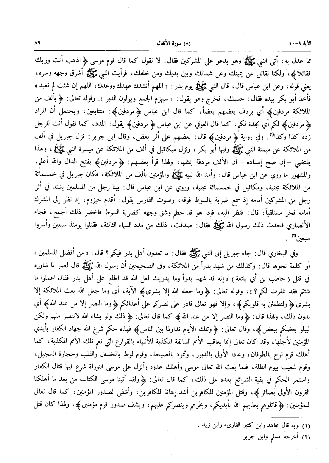 مِمَّا عُدِلَ بِهِ، أَتَى النَّبِيَّ صَلَّى اللَّهُ عَلَيْهِ وَسَلَّمَ وَهُوَ يَدْعُو عَلَى الْمُشْرِكِينَ فَقَالَ: لا نقول كما قال قوم موسى {اذهب أَنتَ وَرَبُّكَ فقاتلا}، ولكنا نُقَاتِلُ عَنْ يَمِينِكَ وَعَنْ شِمَالِكَ وَبَيْنَ يَدَيْكَ ومن خلفك، فَرَأَيْتُ النَّبِيَّ صَلَّى اللَّهُ عَلَيْهِ وَسَلَّمَ أَشْرَقَ وجهه وسره، يعني قوله، وعن ابْنِ عَبَّاسٍ قَالَ، قَالَ النَّبِيُّ صَلَّى اللَّهُ عَلَيْهِ وَسَلَّمَ يَوْمَ بَدْرٍ: «اللَّهُمَّ أَنْشُدُكَ عَهْدَكَ وَوَعْدَكَ، اللَّهُمَّ إِنْ شِئْتَ لَمْ تُعْبَدْ» فَأَخَذَ أَبُو بَكْرٍ بِيَدِهِ فَقَالَ: حَسْبُكَ، فَخَرَجَ وَهُوَ يقول: «سَيُهْزَمُ الجمع وَيُوَلُّونَ الدبر». وَقَوْلُهُ تَعَالَى: {بِأَلْفٍ مِنَ الْمَلَائِكَةِ مُرْدِفِينَ} أَيْ يردف بعضهم بعضاً، كما قال ابن عباس {مُرْدِفِينَ}: متتابعين، ويحتمل أن الْمُرَادُ {مُرْدِفِينَ} لَكُمْ أَيْ نَجْدَةً لَكُمْ، كَمَا قَالَ الْعَوْفِيُّ عَنِ ابْنِ عَبَّاسٍ {مُرْدِفِينَ} يَقُولُ: المدد، كما تقول أنت للرجل زده كذا وكذا (وبه قَالَ مُجَاهِدٌ وَابْنُ كَثِيرٍ الْقَارِئُ وَابْنُ زَيْدٍ). وفي رواية {مُرْدِفِينَ} قال: بعضهم على أثر بعض، وقال ابن جرير: نَزَلَ جِبْرِيلُ فِي أَلْفٍ مِنَ الْمَلَائِكَةِ عَنْ مَيْمَنَةِ النَّبِيِّ صَلَّى اللَّهُ عَلَيْهِ وَسَلَّمَ وَفِيهَا أَبُو بَكْرٍ، وَنَزَلَ مِيكَائِيلُ فِي أَلْفٍ مِنَ الْمَلَائِكَةِ عَنْ مَيْسَرَةِ النَّبِيِّ صَلَّى اللَّهُ عَلَيْهِ وسلم، وهذا يقتضي - أن صَحَّ إِسْنَادُهُ - أَنَّ الْأَلْفَ مُرْدَفَةٌ بِمِثْلِهَا، وَلِهَذَا قرأ بعضهم: {مُرْدِفِينَ} بفتح الدال والله أعلم،