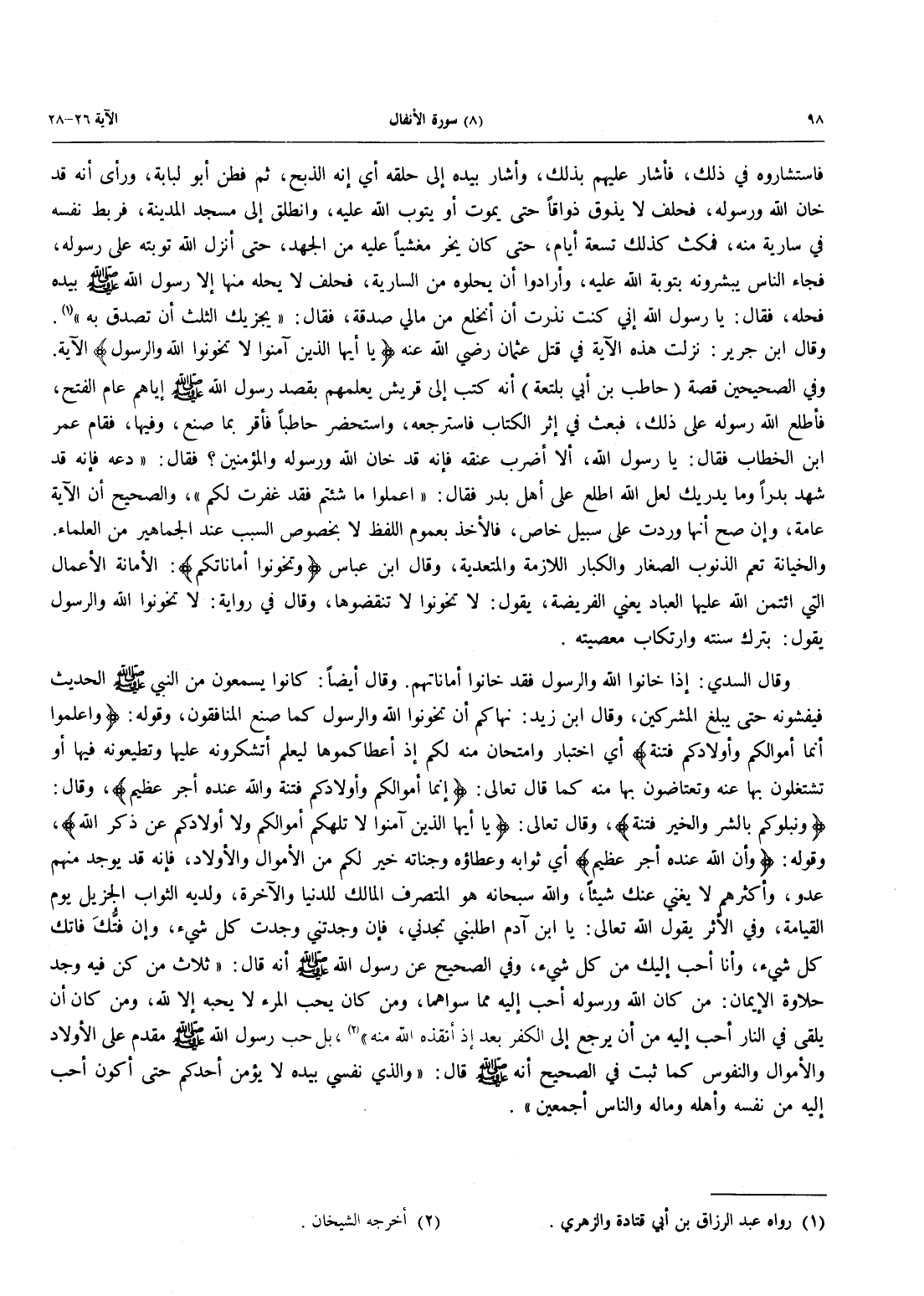 وَقَالَ السُّدِّيُّ: إِذَا خَانُوا اللَّهَ وَالرَّسُولَ فَقَدْ خَانُوا أَمَانَاتِهِمْ. وَقَالَ أَيْضًا: كَانُوا يَسْمَعُونَ مِنَ النبي صلى الله عليه وسلم الحديث فيشفونه حتى يبلغ المشركين، وقال ابن زيد: نَهَاكُمْ أَنْ تَخُونُوا اللَّهَ وَالرَّسُولَ كَمَا صَنَعَ المنافقون، وقوله: {وَاعْلَمُوا أَنَّمَآ أَمْوَالُكُمْ وَأَوْلاَدُكُمْ فِتْنَةٌ} أَيْ اخْتِبَارٌ وَامْتِحَانُ مِنْهُ لَكُمْ إِذْ أَعْطَاكُمُوهَا لِيَعْلَمَ أَتَشْكُرُونَهُ عَلَيْهَا وَتُطِيعُونَهُ فِيهَا أَوْ تَشْتَغِلُونَ بِهَا عَنْهُ وَتَعْتَاضُونَ بِهَا مِنْهُ كَمَا قَالَ تَعَالَى: {أَنَّمَآ أَمْوَالُكُمْ وَأَوْلاَدُكُمْ فِتْنَةٌ وَاللَّهُ عِندَهُ أَجْرٌ عَظِيمٌ}، وقال: و {نبلوكم بالشر والخير فِتْنَةً}، وَقَالَ تَعَالَى: {يَا أَيُّهَا الَّذِينَ آمَنُواْ لاَ تُلْهِكُمْ أَمْوَالُكُمْ وَلاَ أَوْلاَدُكُمْ عَن ذِكْرِ اللَّهِ}، وَقَوْلُهُ: {وَأَنَّ اللَّهَ عِندَهُ أَجْرٌ عَظِيمٌ} أَيْ ثَوَابُهُ وَعَطَاؤُهُ وَجَنَّاتُهُ خَيْرٌ لَكُمْ مِنَ الْأَمْوَالِ وَالْأَوْلَادِ، فَإِنَّهُ قَدْ يُوجَدُ مِنْهُمْ عَدُوٌّ، وَأَكْثَرُهُمْ لَا يُغْنِي عَنكَ شَيْئاً، وَاللَّهُ سُبْحَانَهُ هُوَ الْمُتَصَرِّفُ الْمَالِكُ لِلدُّنْيَا وَالْآخِرَةِ، وَلَدَيْهِ الثَّوَابُ الْجَزِيلُ يَوْمَ الْقِيَامَةِ، وَفِي الْأَثَرِ يَقُولُ اللَّهُ تَعَالَى: يا ابْنَ آدَمَ اطْلُبْنِي تَجِدْنِي، فَإِنْ وَجَدْتَنِي وَجَدْتَ كُلَّ شَيْءٍ، وَإِنْ فُتَّكَ فَاتَكَ كُلُّ شَيْءٍ، وَأَنَا أَحَبُّ إِلَيْكَ مِنْ كُلِّ شَيْءٍ، وَفِي الصَّحِيحِ عَنْ رَسُولِ اللَّهِ صَلَّى اللَّهُ عَلَيْهِ وَسَلَّمَ أَنَّهُ قَالَ: "ثَلَاثٌ مَنْ كُنَّ فِيهِ وجد حَلَاوَةَ الْإِيمَانِ: مَنْ كَانَ اللَّهُ وَرَسُولُهُ أَحَبَّ إِلَيْهِ مِمَّا سِوَاهُمَا، وَمَنْ كَانَ يُحِبُّ الْمَرْءَ لَا يُحِبُّهُ إِلَّا لِلَّهِ، وَمَنْ كَانَ أَنْ يُلْقَى فِي النَّارِ أَحَبَّ إِلَيْهِ مِنْ أَنْ يَرْجِعَ إِلَى الْكُفْرِ بَعْدَ إِذْ أَنْقَذَهُ اللَّهُ منه" (أخرجه الشيخان)، بل حب رسول الله صلى الله عليه وسلم مُقَدَّمٌ عَلَى الْأَوْلَادِ وَالْأَمْوَالِ وَالنُّفُوسِ كَمَا ثَبَتَ في الصحيح أنه صَلَّى اللَّهُ عَلَيْهِ وَسَلَّمَ قَالَ: «وَالَّذِي نَفْسِي بِيَدِهِ لَا يُؤْمِنُ أَحَدُكُمْ حَتَّى أَكُونَ أَحَبَّ إِلَيْهِ مِنْ نَفْسِهِ وَأَهْلِهِ وَمَالِهِ وَالنَّاسِ أَجْمَعِينَ».
