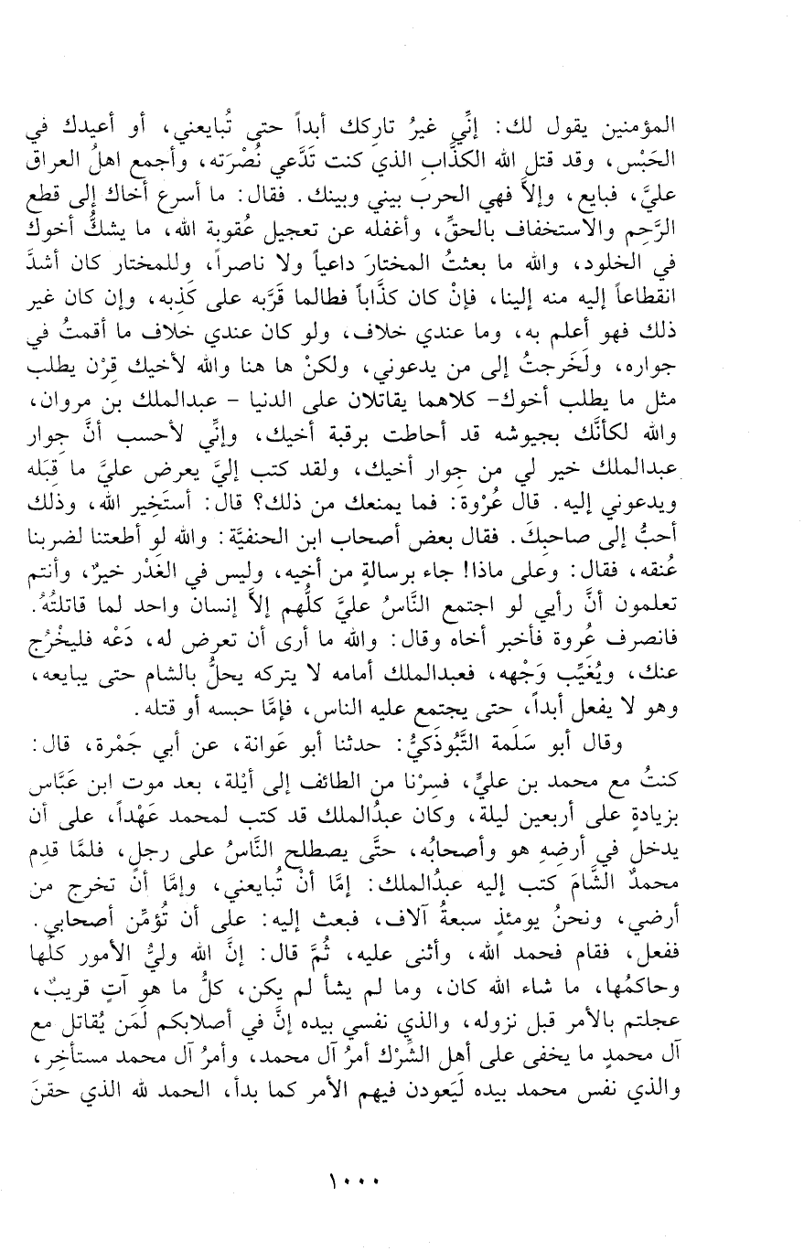عُثْمَانُ بْنُ أَبِي شيبة: حدثنا محمد بن الحسن الأسدي قال: حدثنا عَبْدُ رَبِّهِ أَبُو شِهَابٍ، عَنْ لَيْثٍ، عَنْ محمد بن بشر، عن محمد ابن الْحَنَفِيَّةِ قَالَ: أَهْلُ بَيْتَيْنِ مِنَ الْعَرَبِ يَتَّخِذُهُمُ النَّاسُ أَنْدَادًا مِنْ دُونِ اللَّهِ، نَحْنُ، وَبَنُو عَمِّنَا هَؤُلاءِ، يَعْنِي بَنِي أُمَيَّةَ.