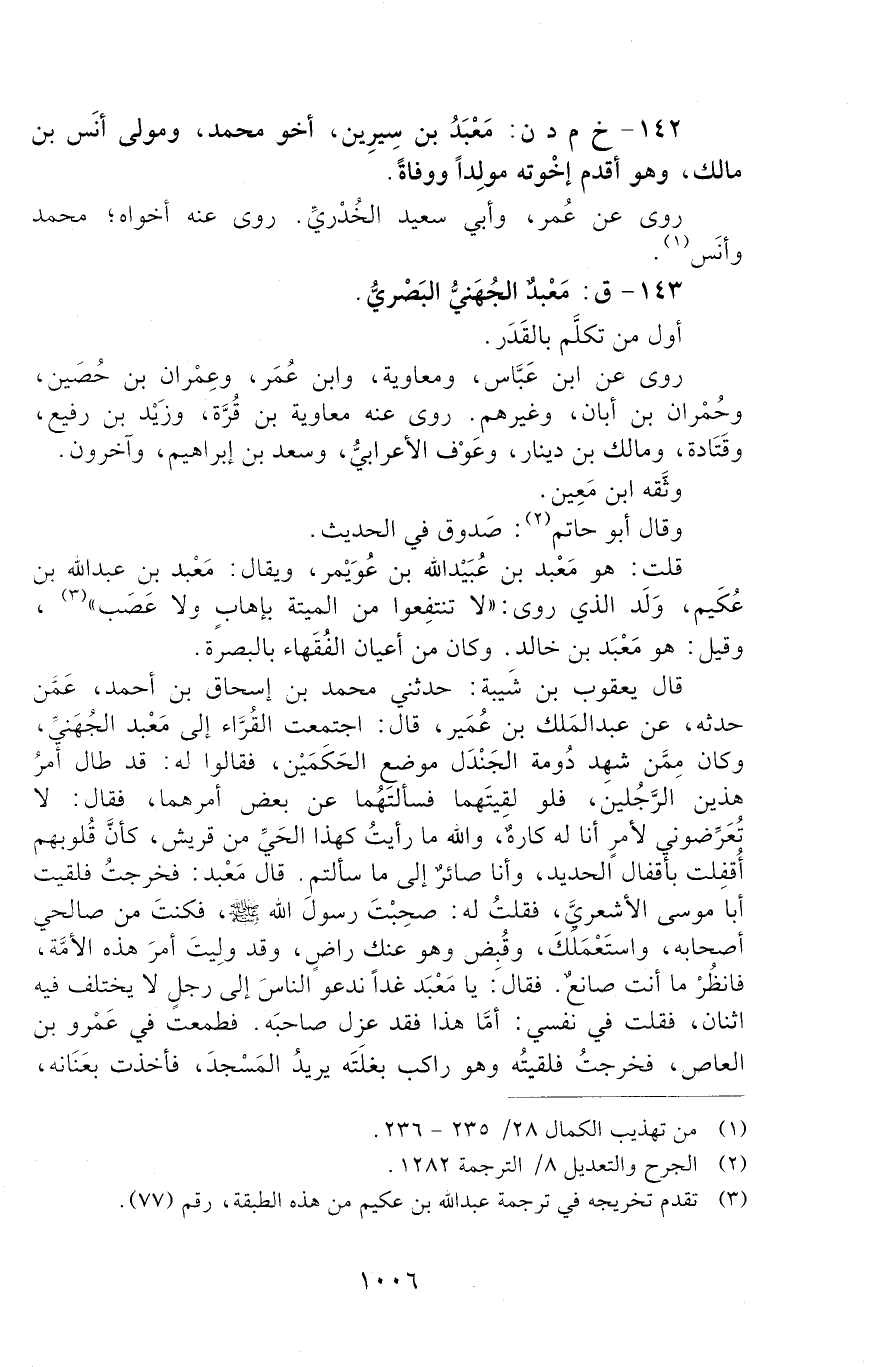 142 - خ م د ن: مَعْبَدُ بْنُ سِيرِينَ [الوفاة: 81 - 90 ه]