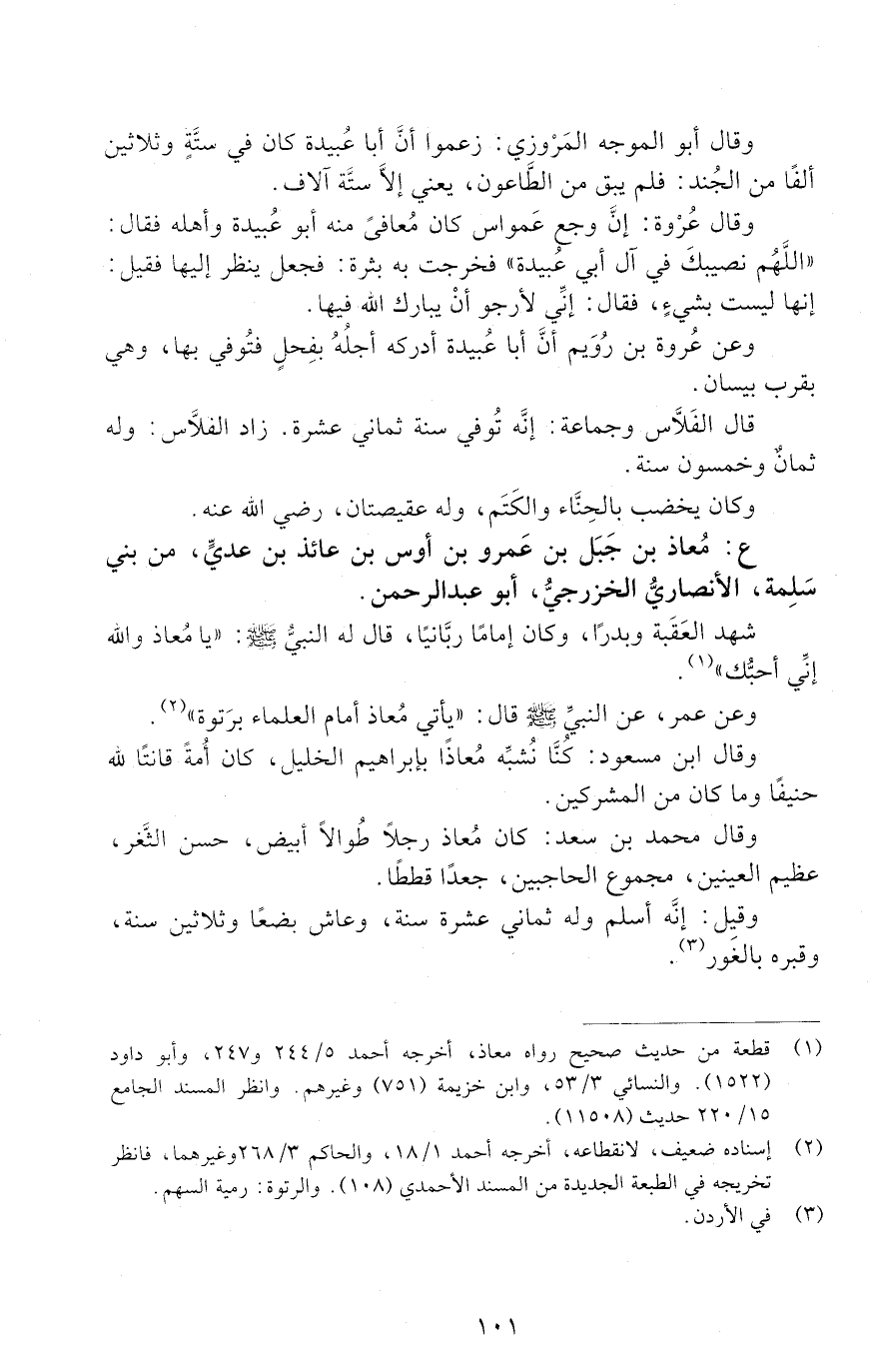 -ع: معاذ بن جبل بن عَمْرِو بْنِ أَوْسِ بْنِ عَائِذِ بْنِ عَدِيٍّ، مِنْ بَنِي سَلَمَةَ، الْأَنْصَارِيُّ الْخَزْرَجِيُّ، أَبُو عَبْدِ الرَّحْمَنِ. [المتوفى: 18 ه]