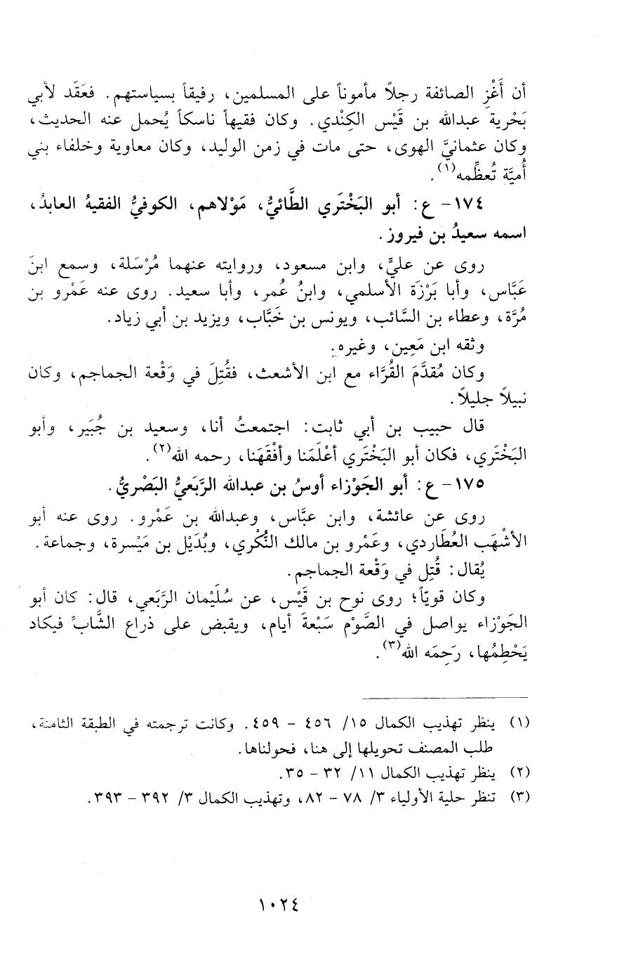 174 - ع: أَبُو الْبَخْتَرِيِّ الطَّائِيُّ مَوْلاهُمُ، الْكُوفِيُّ الْفَقِيهُ الْعَابِدُ، اسْمُهُ سَعِيدُ بْن فَيْرُوزَ. [الوفاة: 81 - 90 ه]