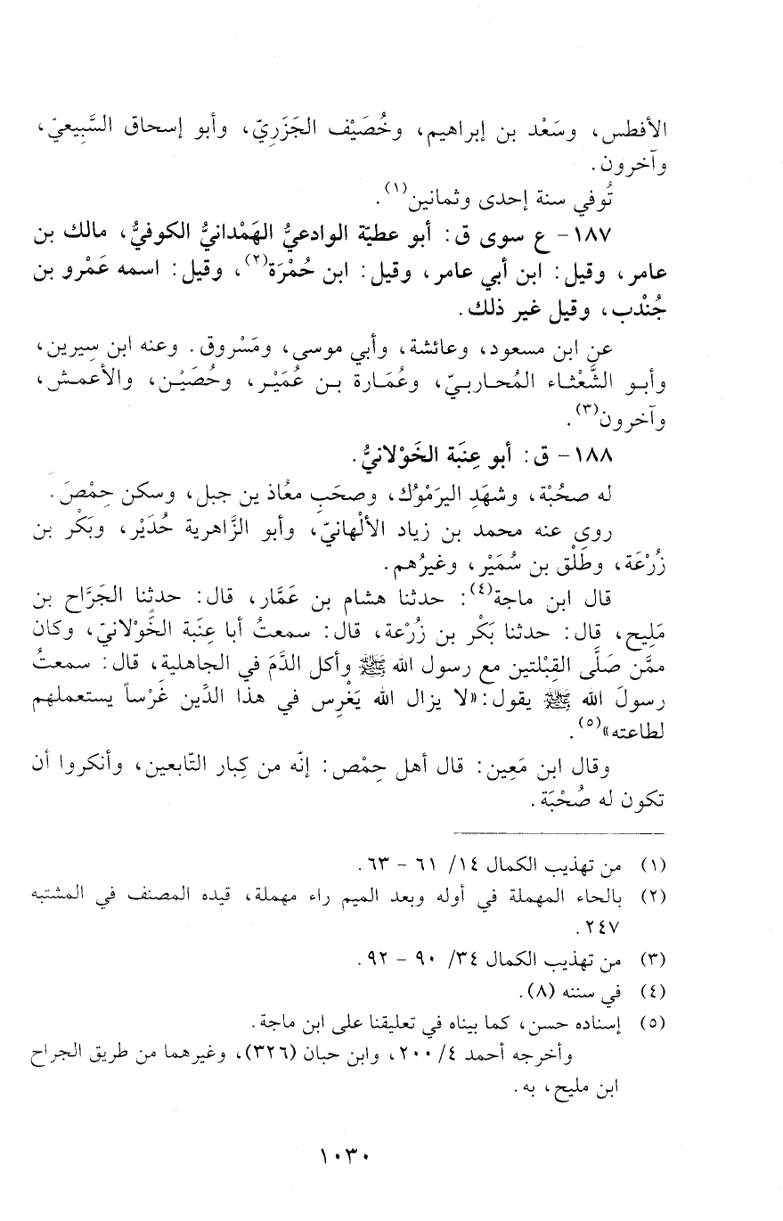 187 - ع سوى ق: أَبُو عَطِيَّةَ الْوَادِعِيُّ الْهَمْدَانِيُّ الْكُوفِيُّ، مَالِكُ بْنُ عَامِرٍ، وَقِيلَ: ابْنُ أَبِي عَامِرٍ، وَقِيلَ: ابْنُ حُمْرَةَ، وَقِيلَ: اسْمُهُ عَمْرُو بْنُ جُنْدُبٍ، [الوفاة: 81 - 90 ه]