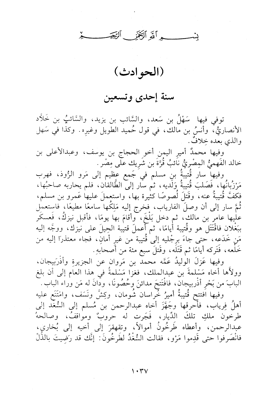 وَفِيهَا سَارَ قُتَيْبَةُ بْنُ مُسْلِمٍ فِي جَمْعٍ عَظِيمٍ إِلَى مَرْوِ الرُّوذِ، فَهَرَبَ مَرْزُبَانُهَا، فَصَلَبَ قُتَيْبَةُ وَلَدَيْهِ، ثُمَّ سَارَ إِلَى الطَّالِقَانِ، فَلَمْ يُحَارِبْهُ صَاحِبُهَا، فَكَفَّ قُتَيْبَةُ عَنْهُ، وَقَتَلَ لُصُوصًا كَثِيرَةً بِهَا، وَاسْتَعْمَلَ عَلَيْهَا عَمْرَو بْنَ مُسْلِمٍ، ثُمَّ سَارَ إِلَى أَنْ وَصَلَ الْفَارِيَابَ، فَخَرَجَ إِلَيْهِ مَلِكُهَا سَامِعًا مُطِيعًا، فَاسْتَعْمَلَ عَلَيْهَا عَامِرَ بْنَ مَالِكٍ، ثُمَّ دَخَلَ بَلْخَ، وَأَقَامَ بِهَا يَوْمًا، فَأَقْبَلَ نِيزَكُ، فَعَسْكَرَ بِبَغْلانَ، فَاقْتَتَلَ هُوَ وَقُتَيْبَةُ أَيَّامًا، ثُمَّ أَعْمَلَ قُتَيْبَةَ الْحِيَلَ عَلَى نِيزَكَ، وَوَجَّهَ إِلَيْهِ مِنْ خَدَعَهُ، حَتَّى جَاءَ بِرِجْلَيْهِ إِلَى قُتَيْبَةَ مِنْ غَيْرِ أَمَانٍ، فَجَاءَ مُعْتَذِرًا إِلَيْهِ مِنْ خلعه، فتركه أياما ثم قتله، وقتل سبع مائة مِنْ أَصْحَابِهِ.
