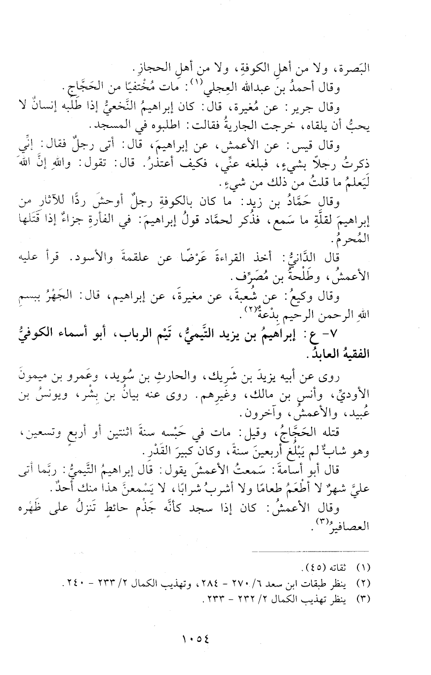 7 - ع: إِبْرَاهِيمُ بْنُ يَزِيدَ التَّيْمِيُّ، تَيْمُ الرَّبَابِ، أَبُو أسَمَاءَ الْكُوفِيُّ الْفَقِيهُ الْعَابِدُ. [الوفاة: 91 - 100 ه]