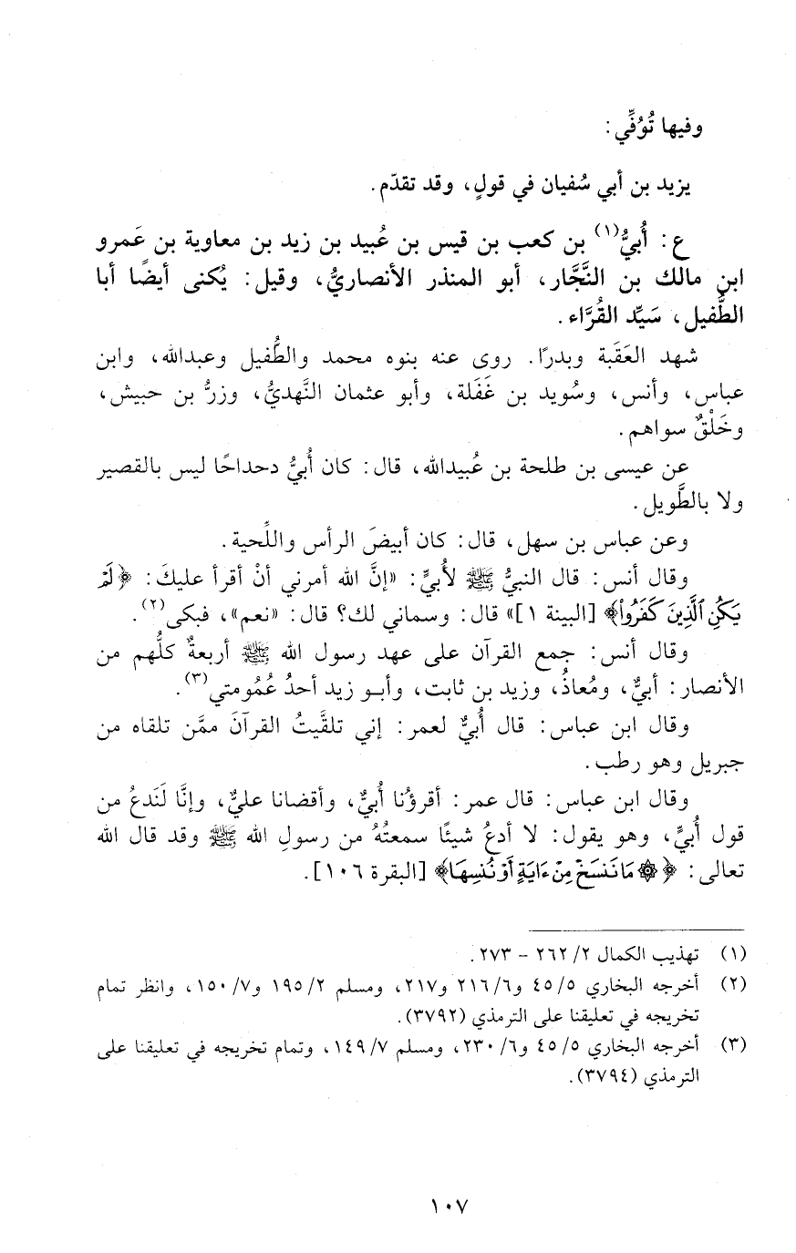 -ع: أبي بن كعب بن قيس بْن عُبَيْد بْن زيد بْن معاوية بْن عمرو بْن مالك بْن النجار، أَبُو المنذر الأنصاري، وقيل: يُكنى أيضًا أبا الطُّفيل، سيد القراء. [المتوفى: 19 ه]