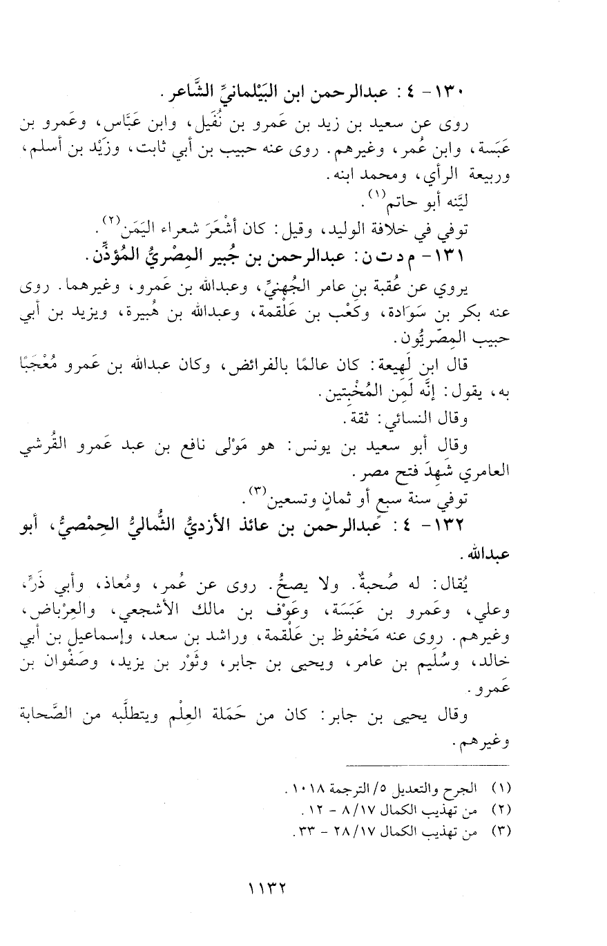 132 - 4: عَبْدُ الرَّحْمَنِ بْنُ عَائِذٍ الأَزْدِيُّ الثُّمَالِيُّ الْحِمْصِيُّ، أَبُو عَبْدِ اللَّهِ. [الوفاة: 91 - 100 ه]