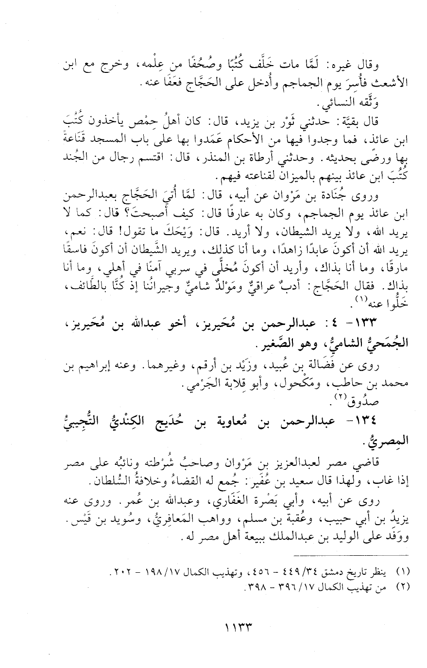 133 - 4: عَبْدُ الرَّحْمَنِ بْنُ مُحَيْرِيزٍ، أَخُو عَبْدِ اللَّهِ بْنِ مُحَيْرِيزٍ، الْجُمَحِيُّ الشَّامِيُّ، [الوفاة: 91 - 100 ه]