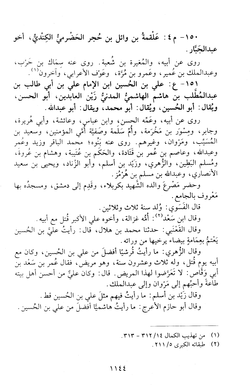 151 - ع: علي بن الحسين ابن الإمام عَلِيِّ بْنِ أَبِي طَالِبِ بْنِ عَبْدِ الْمُطَّلِبِ بن هاشم الهاشمي المدني، زين العابدين، أبو الحسن، ويقال: أبو الحسين، وَيُقَالُ: أَبُو مُحَمَّدٍ، وَيُقَالُ: أَبُو عَبْدِ اللَّهِ. [الوفاة: 91 - 100 ه]